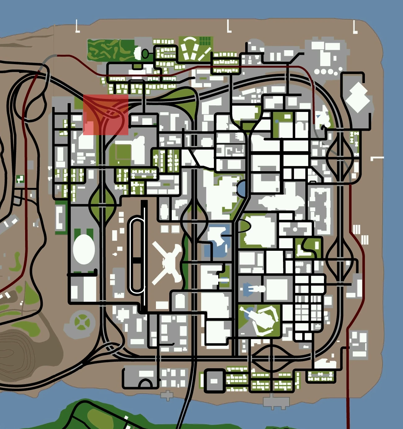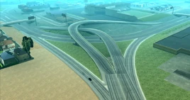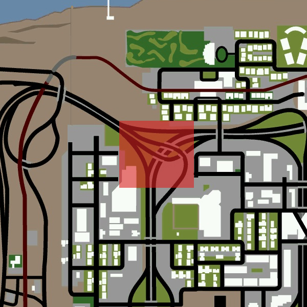 It is located just south of the Prickle Pine district in northwestern Las Venturas, and is identical in design to the Blackfield Intersection, barring its mirrored layout. The heat seeking RPG can be found on the northeast section of the above ground parking lot.