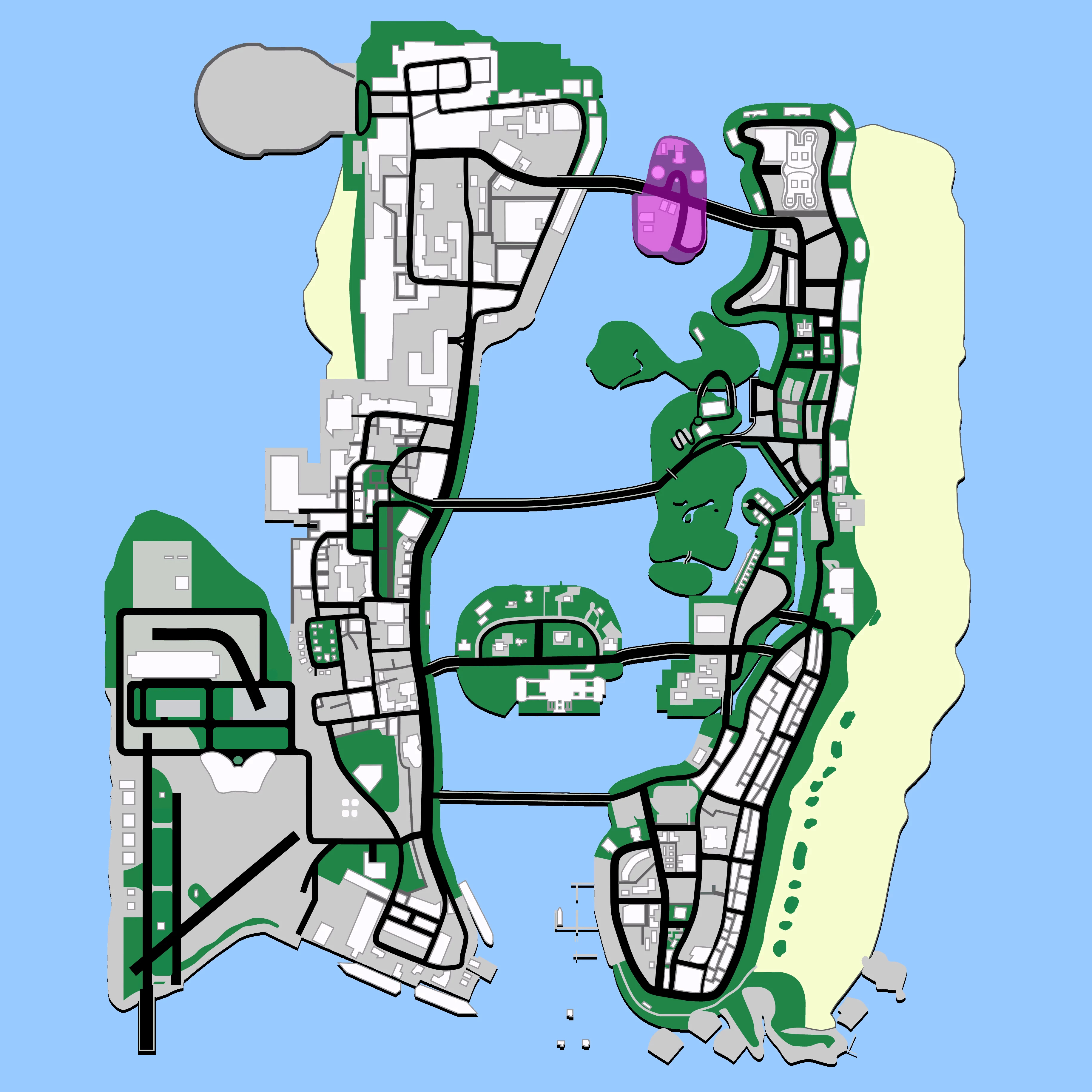 In Grand Theft Auto: Vice City, the island is the only region other than Vice City Beach that is unlocked from the beginning of the game.