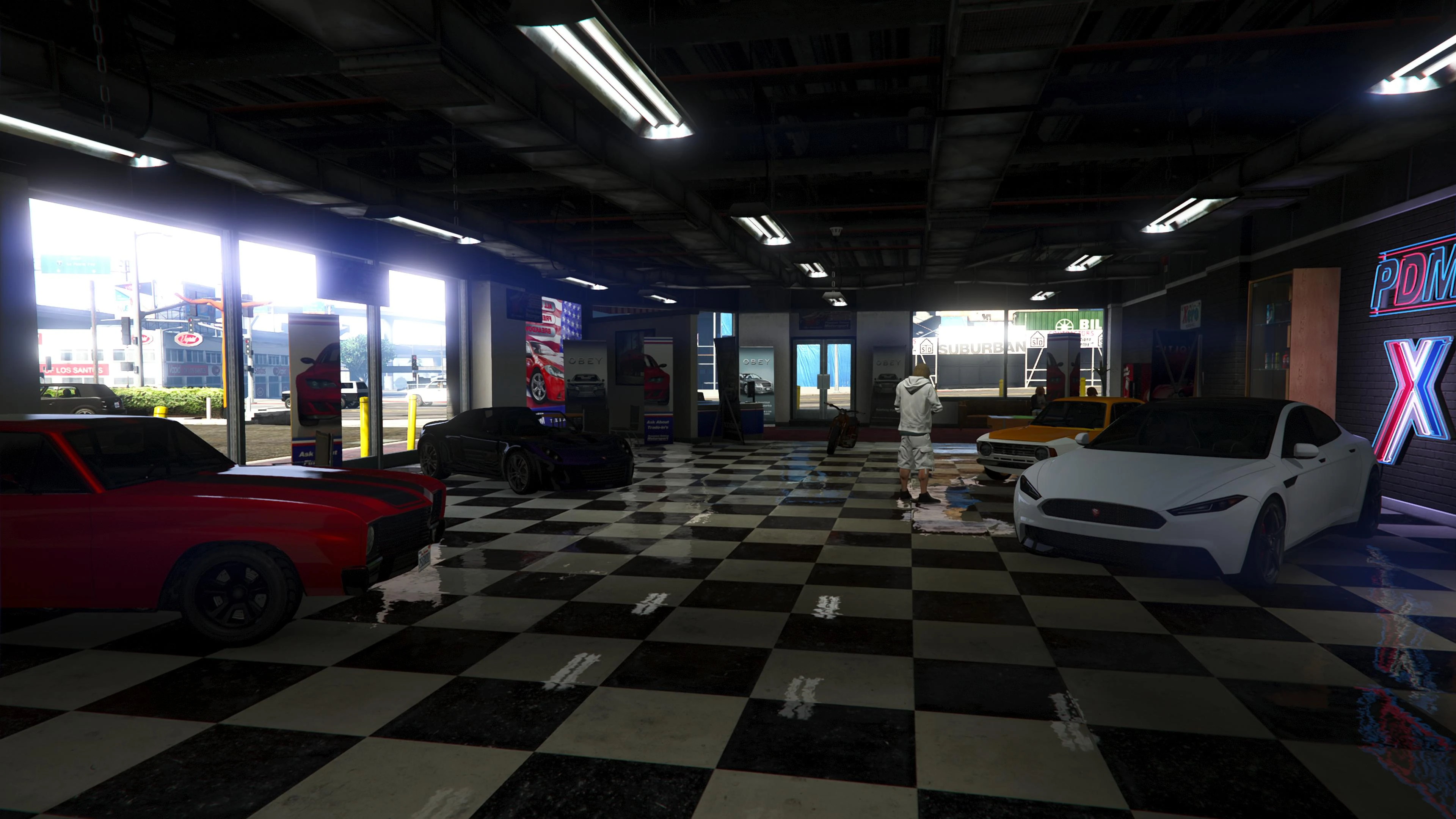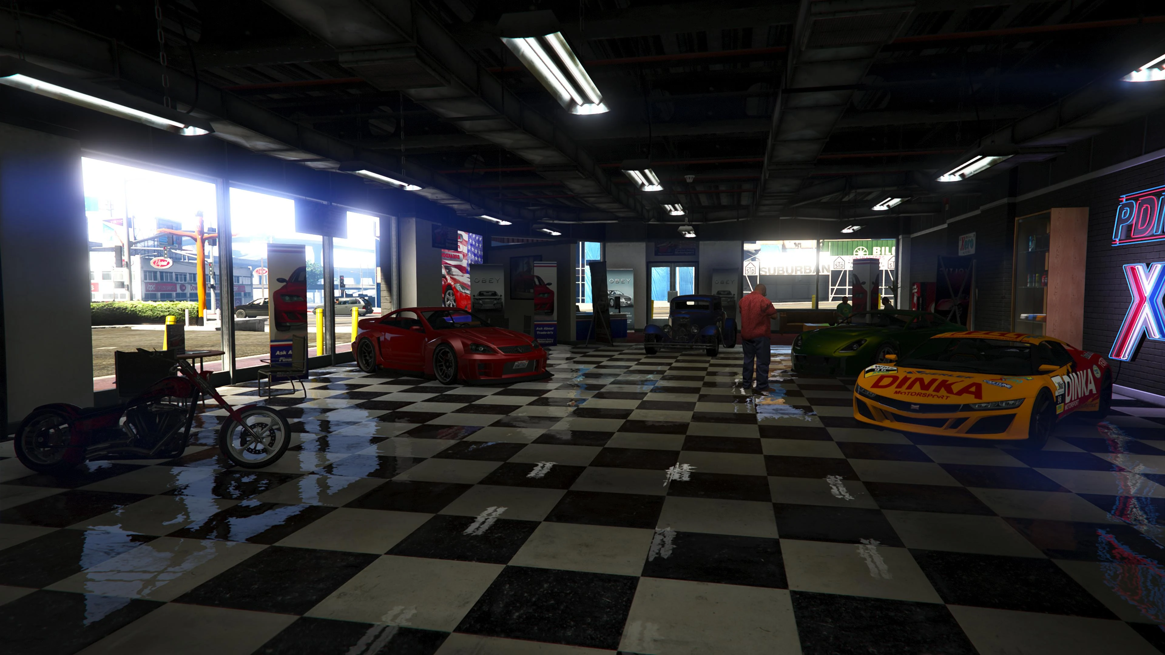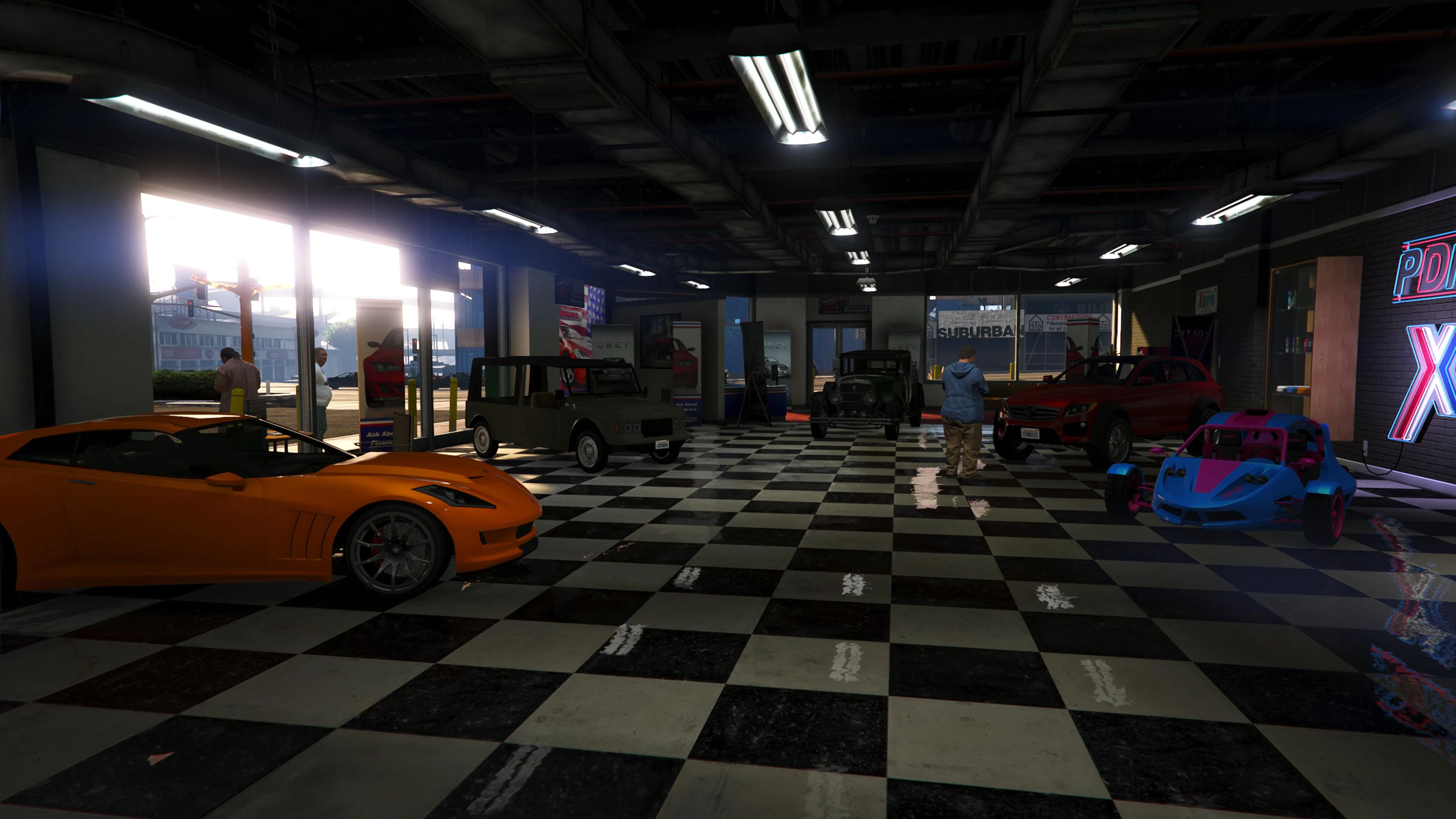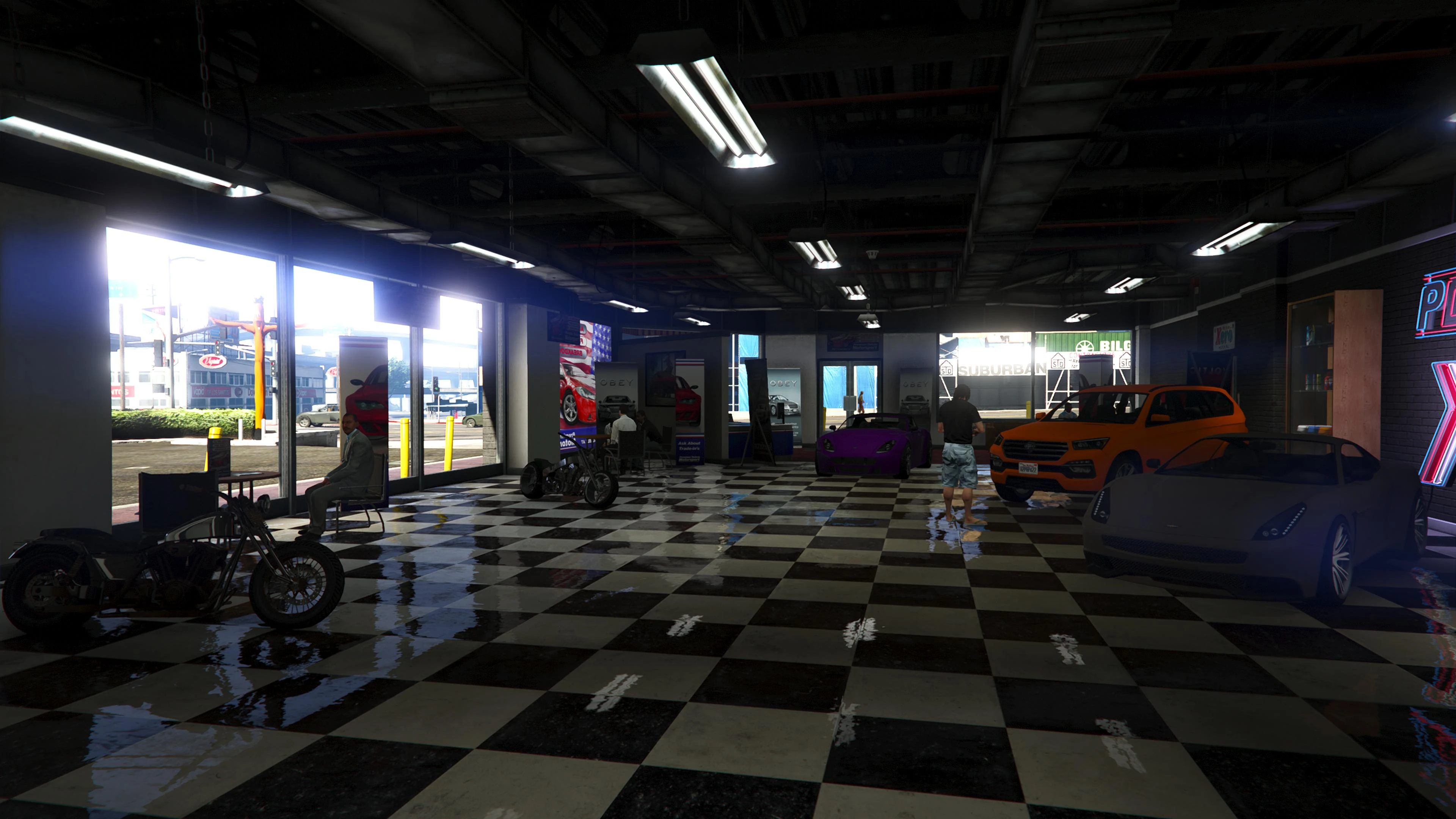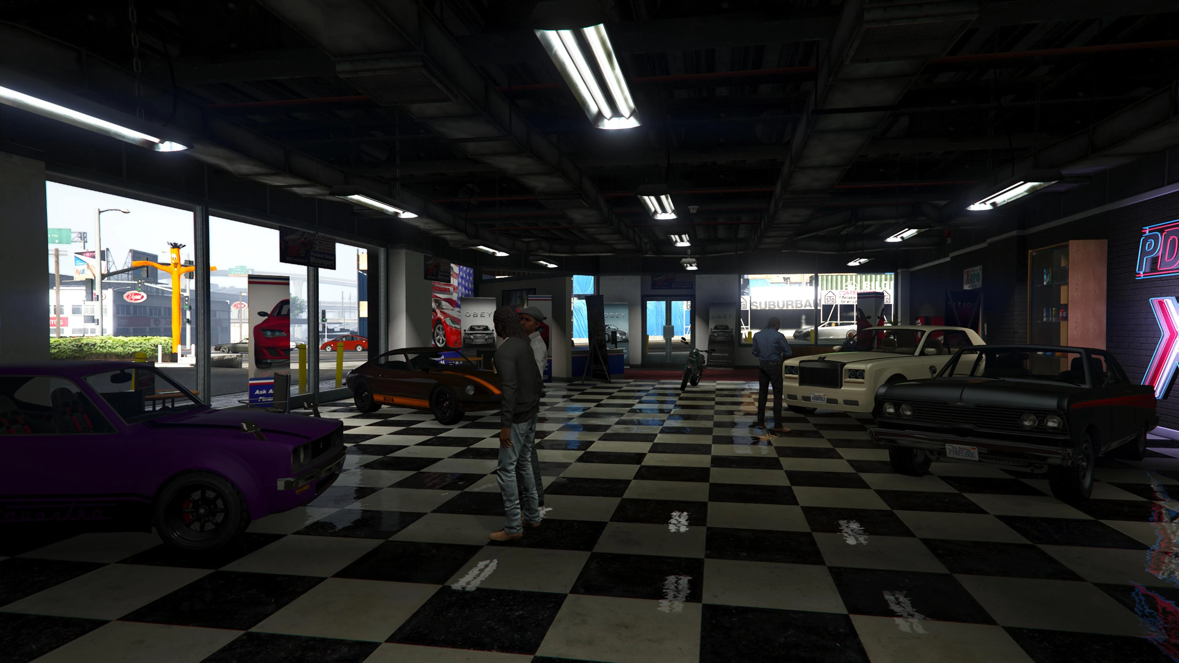 Beginning with the SM722 Week, the first weekly update after the launch of The Criminal Enterprises DLC, Premium Deluxe Motorsport became an accessible location to players. Numerous NPCs are seen milling about inside and Simeon is usually seen inside his office.