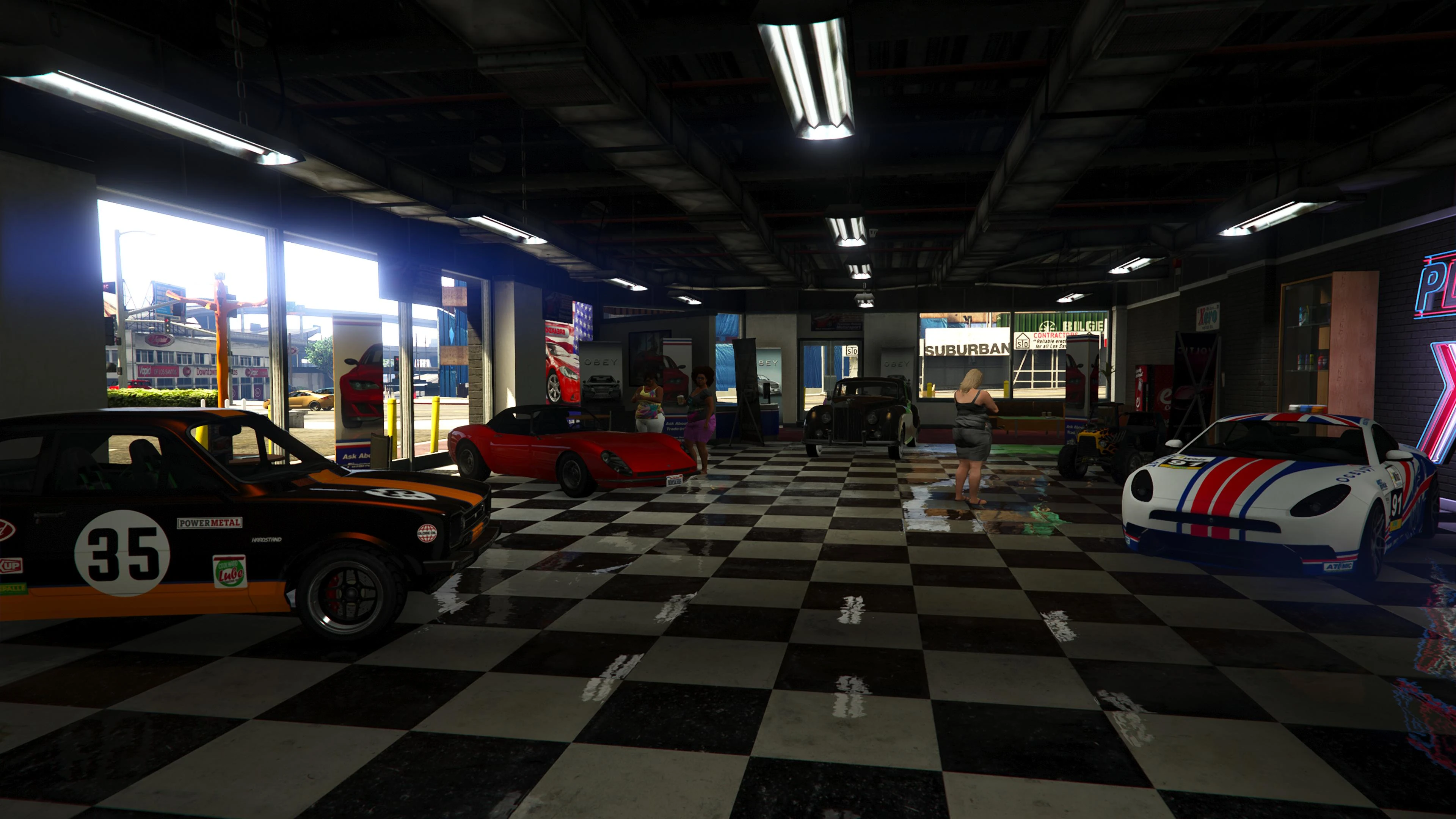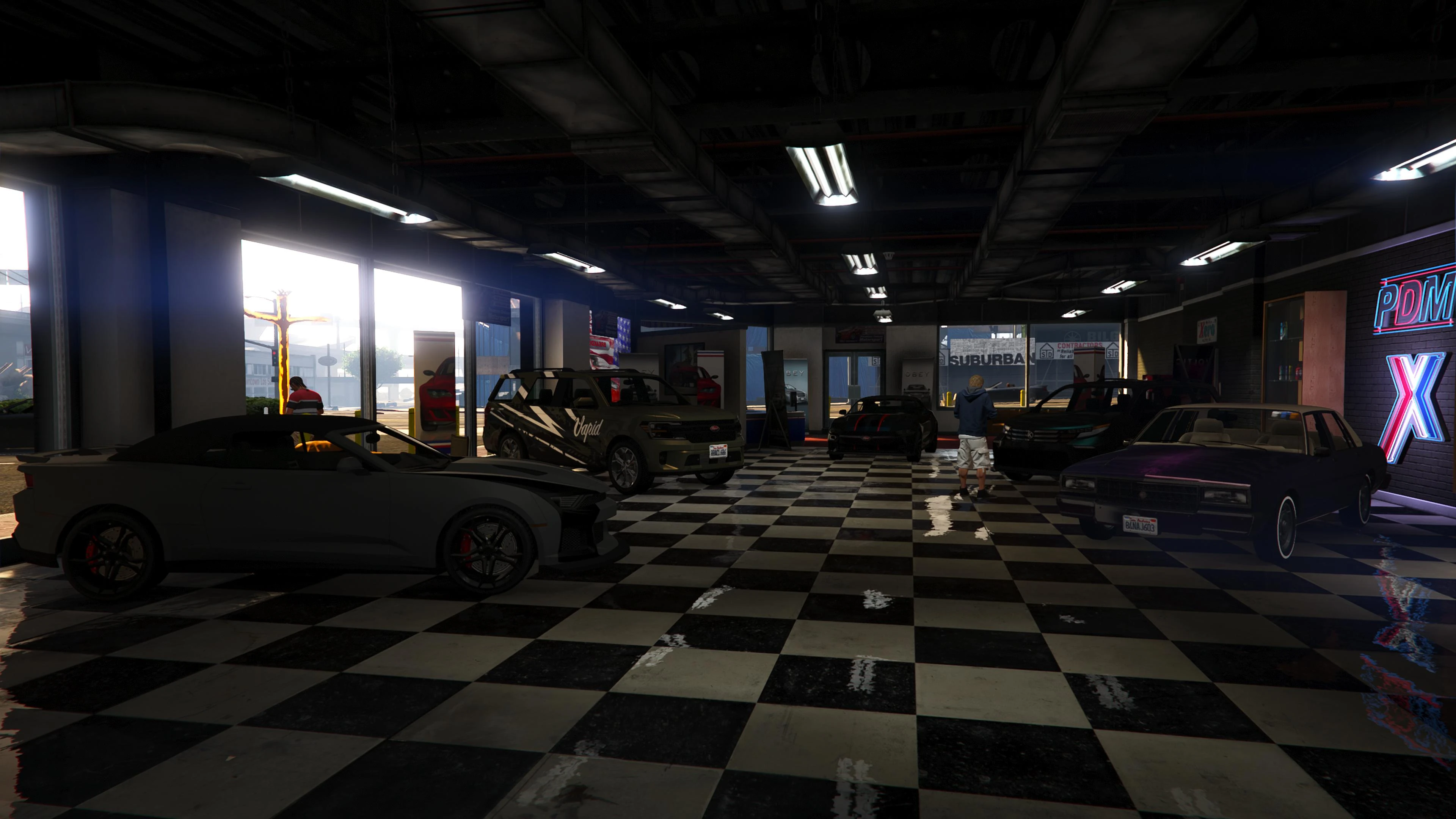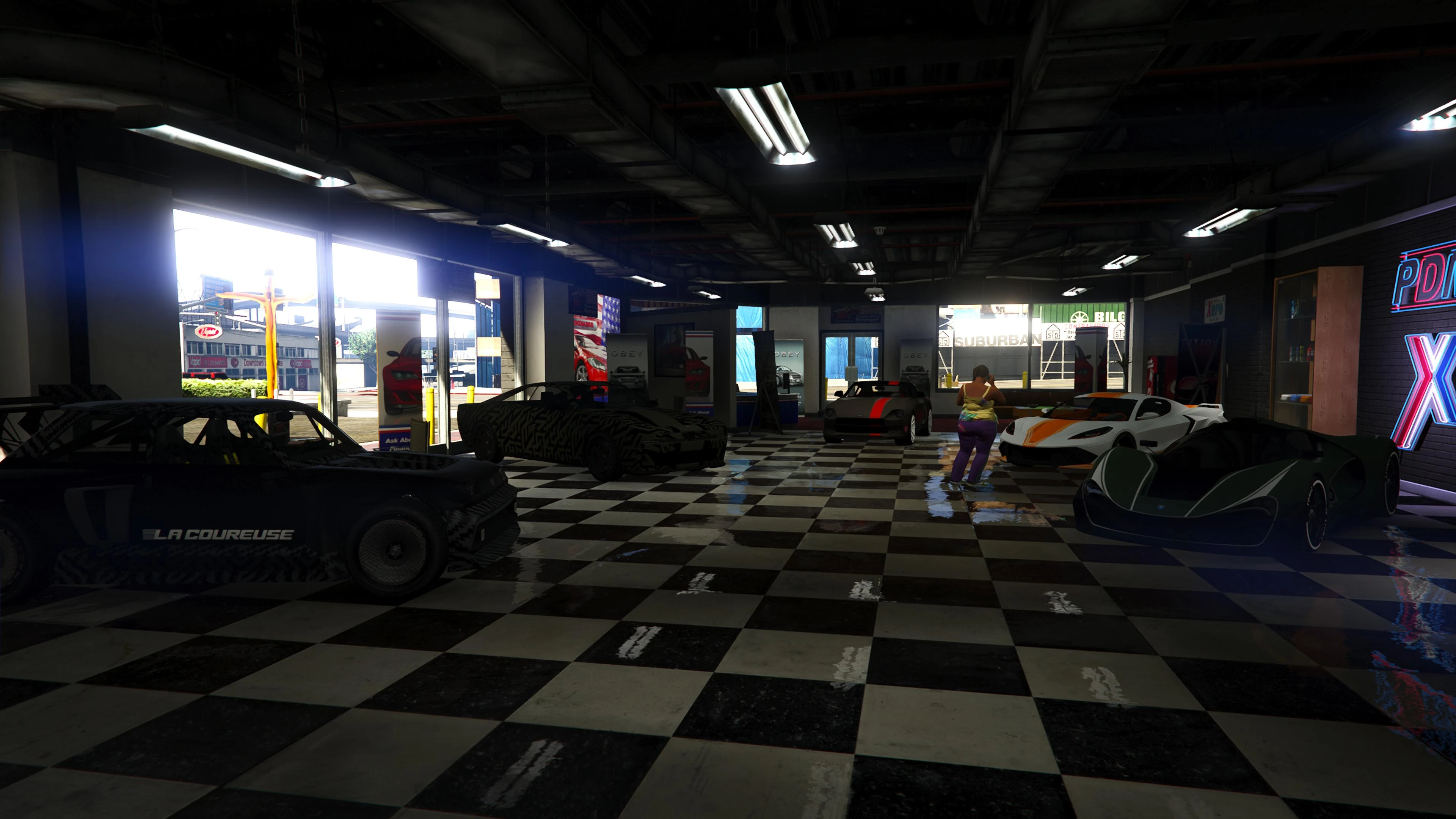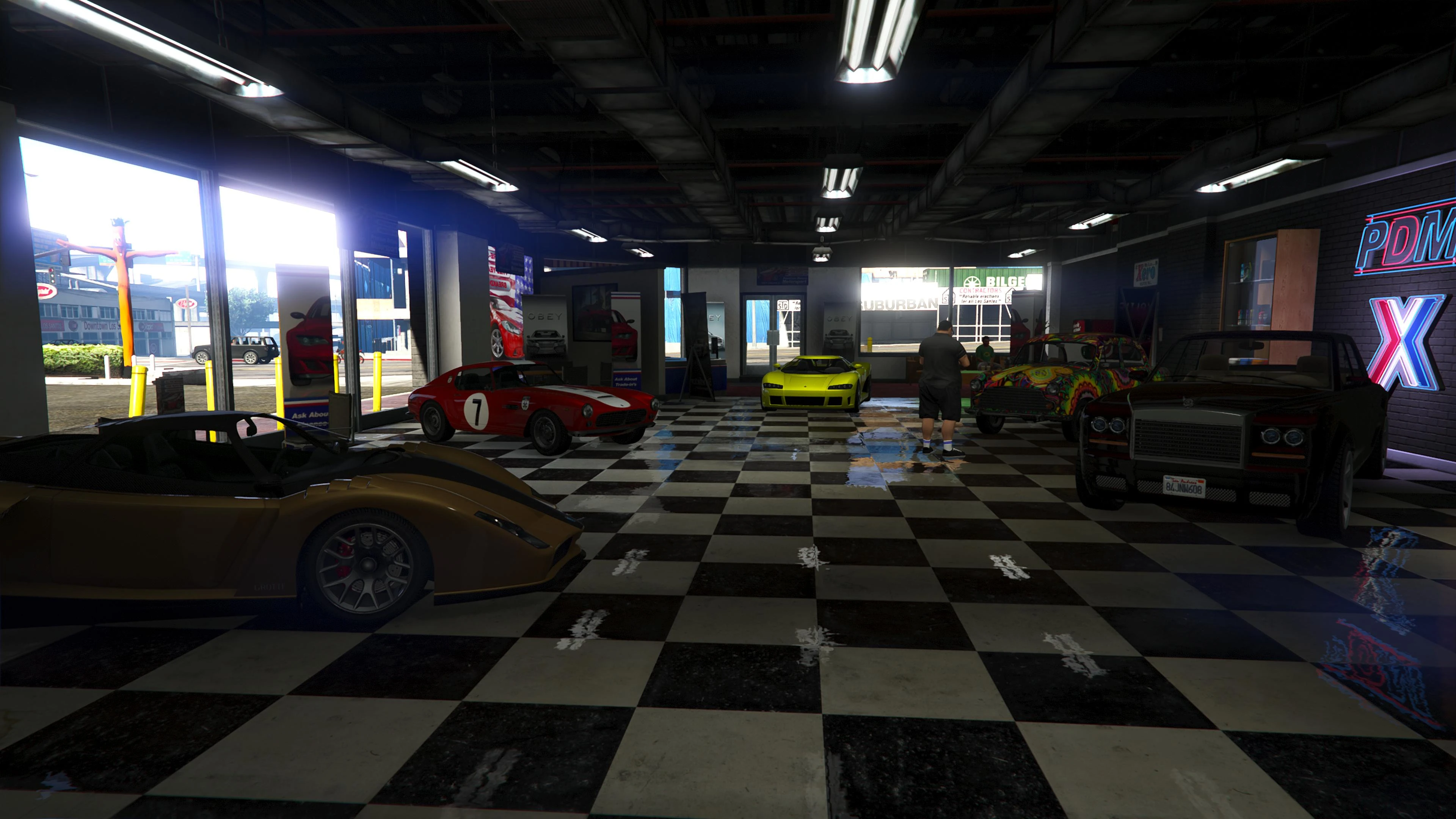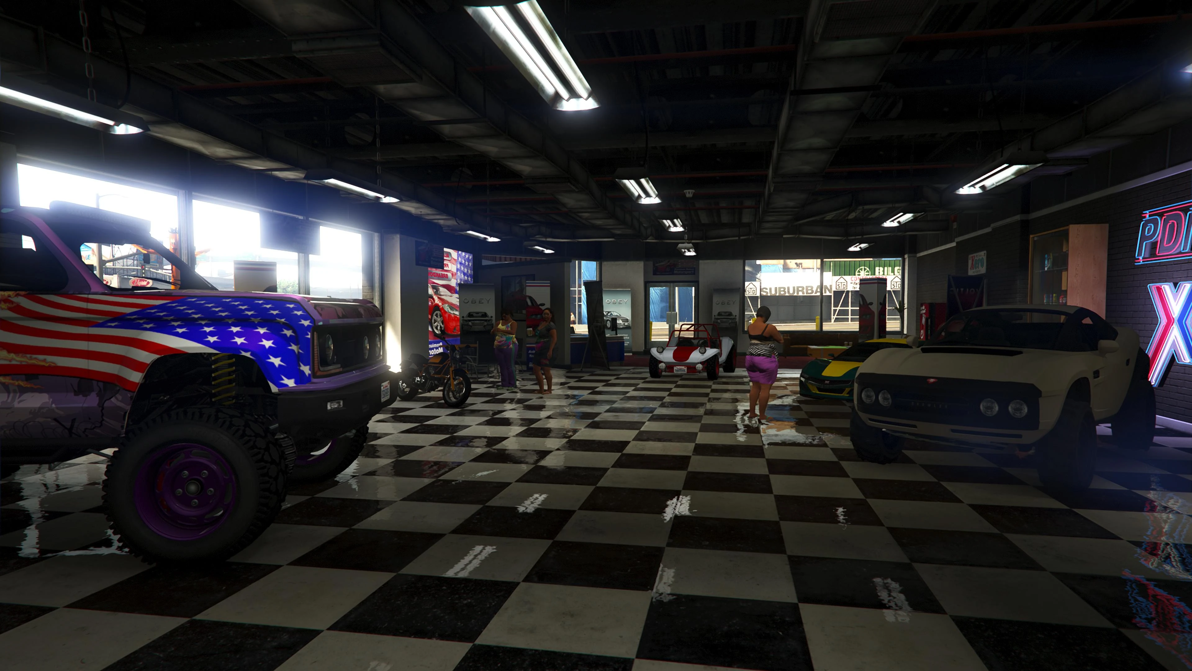 Beginning with the SM722 Week, the first weekly update after the launch of The Criminal Enterprises DLC, Premium Deluxe Motorsport became an accessible location to players. Numerous NPCs are seen milling about inside and Simeon is usually seen inside his office.