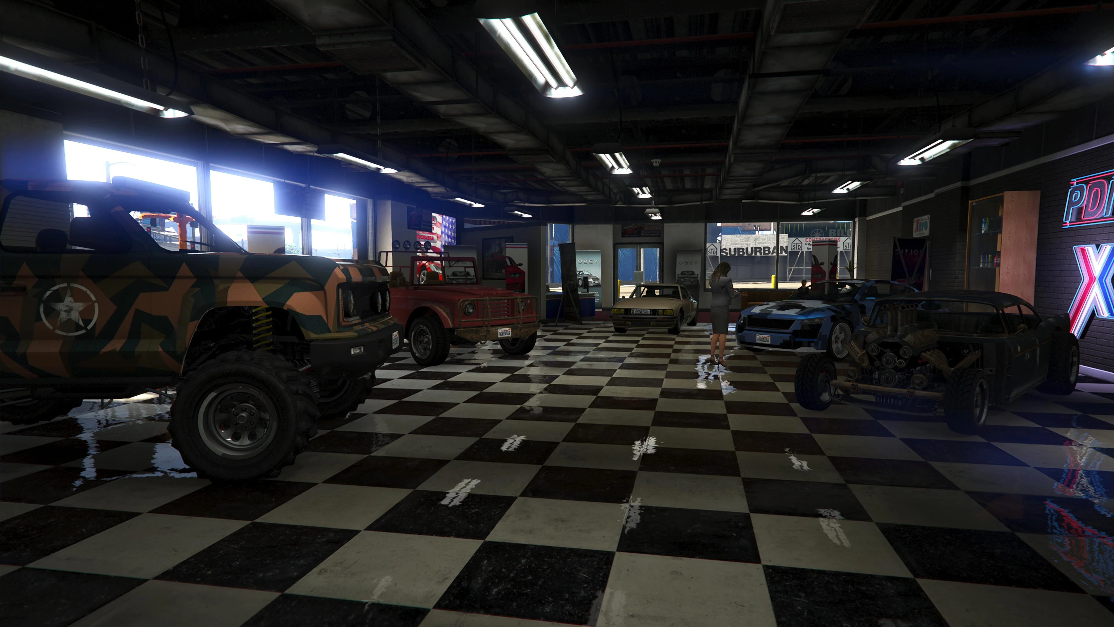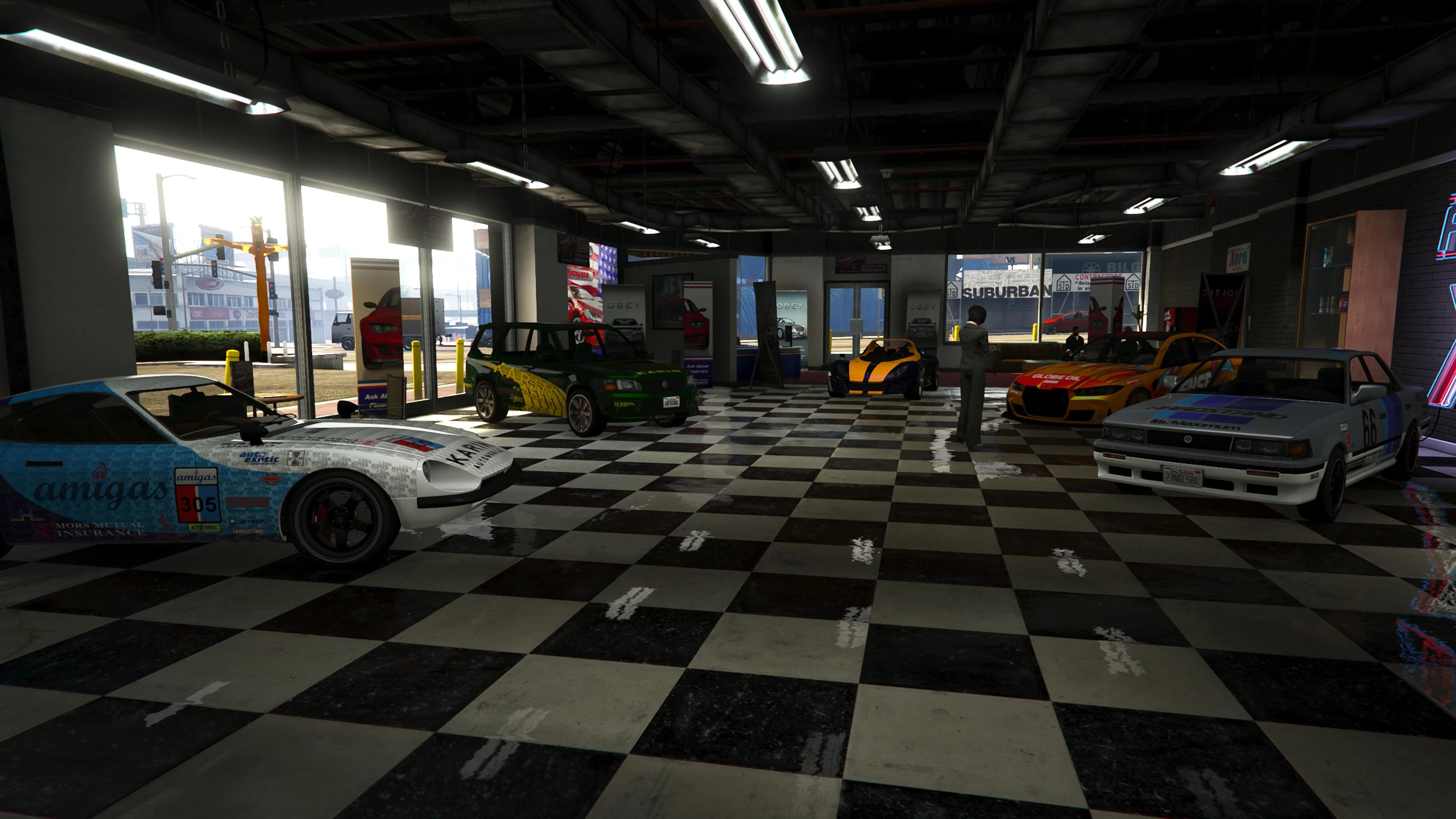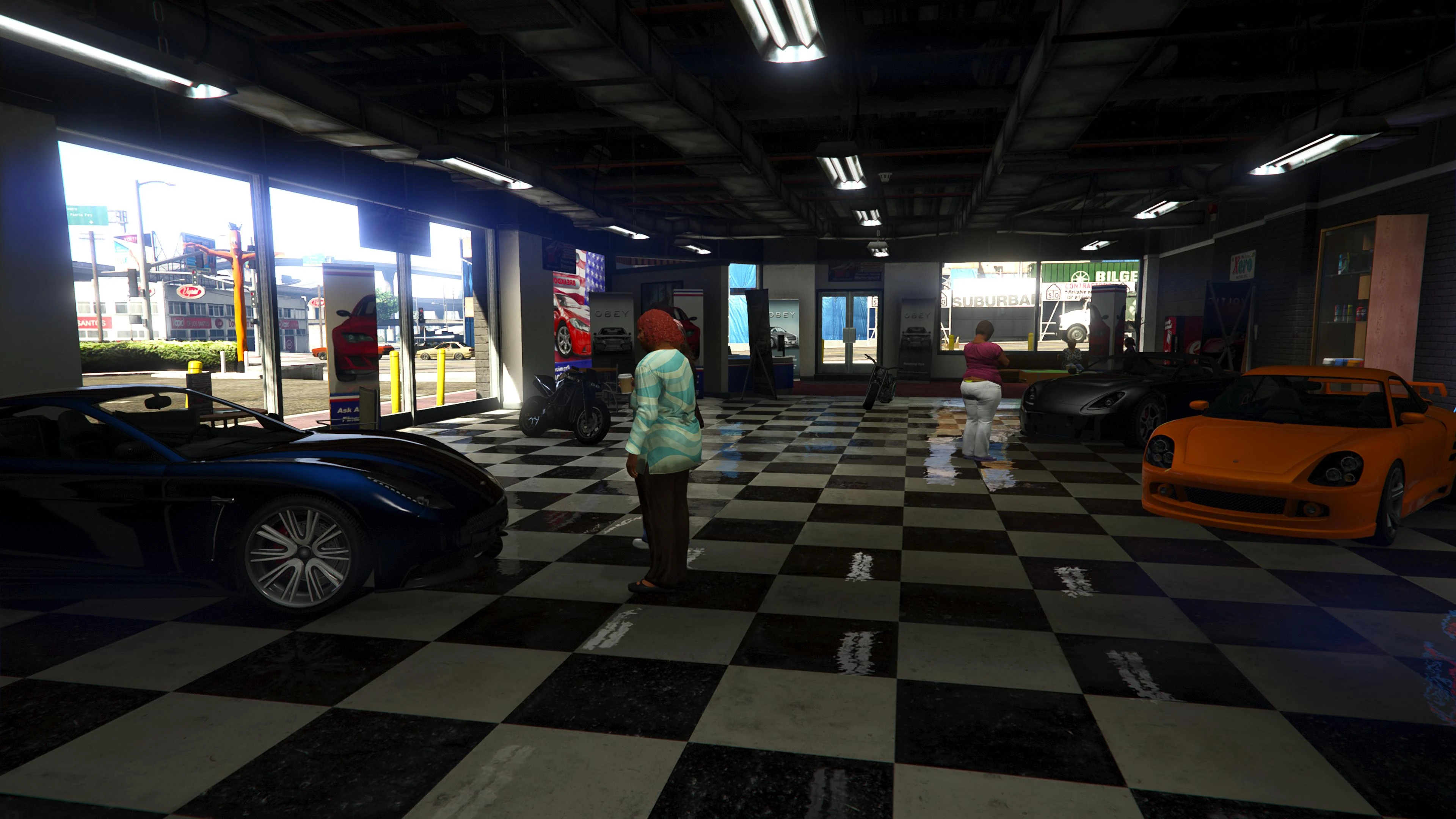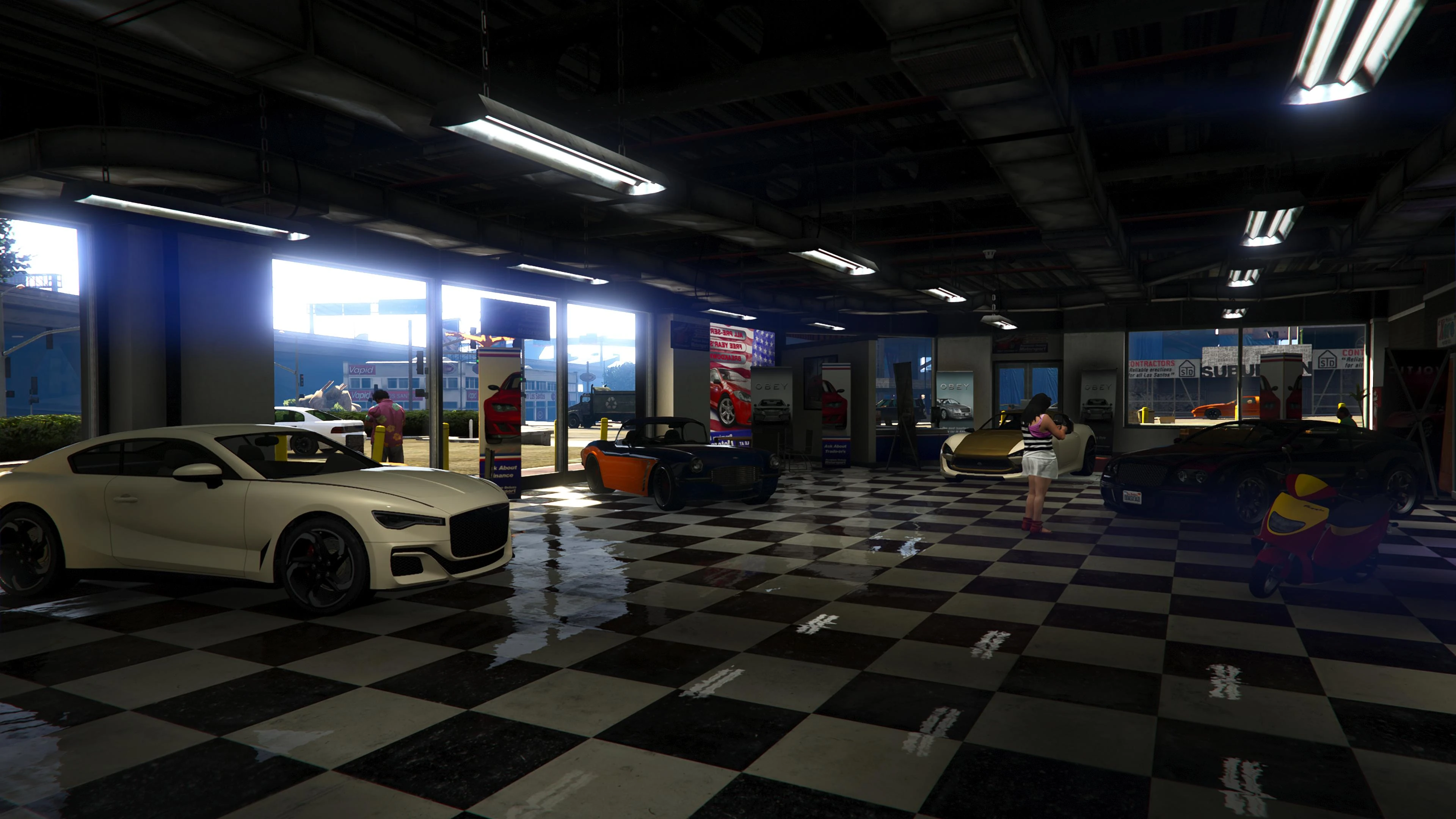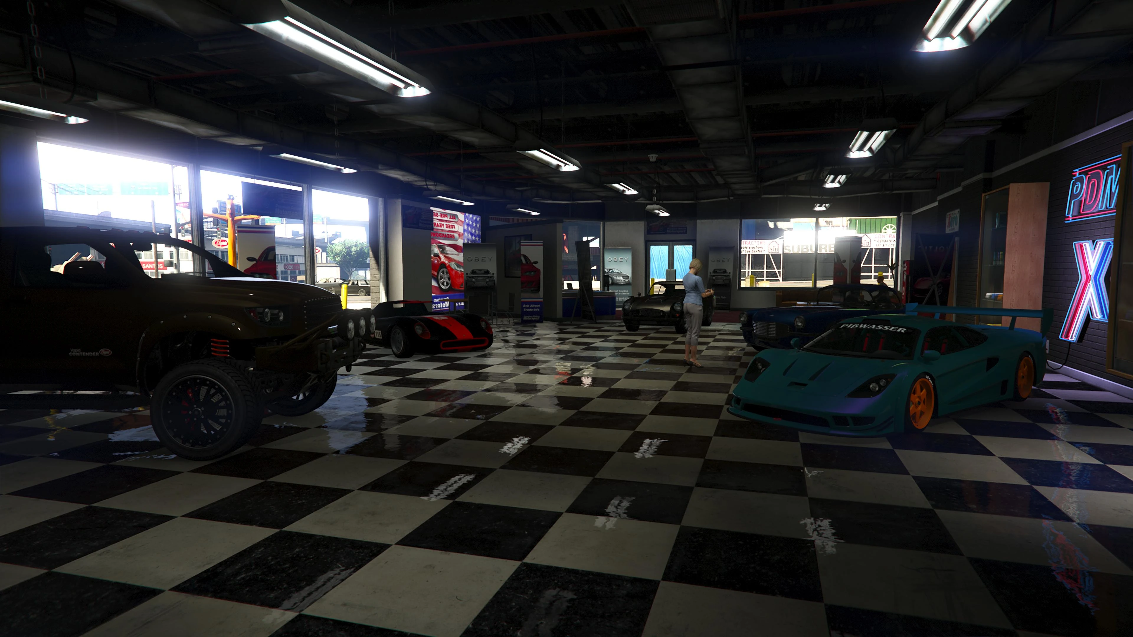 Beginning with the SM722 Week, the first weekly update after the launch of The Criminal Enterprises DLC, Premium Deluxe Motorsport became an accessible location to players. Numerous NPCs are seen milling about inside and Simeon is usually seen inside his office.