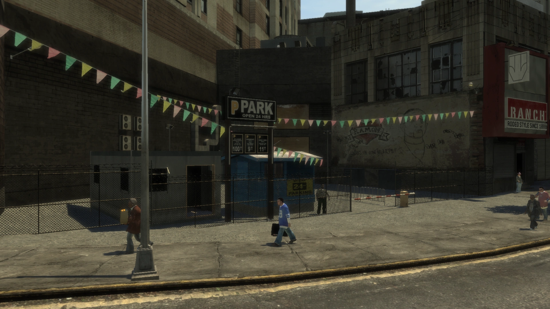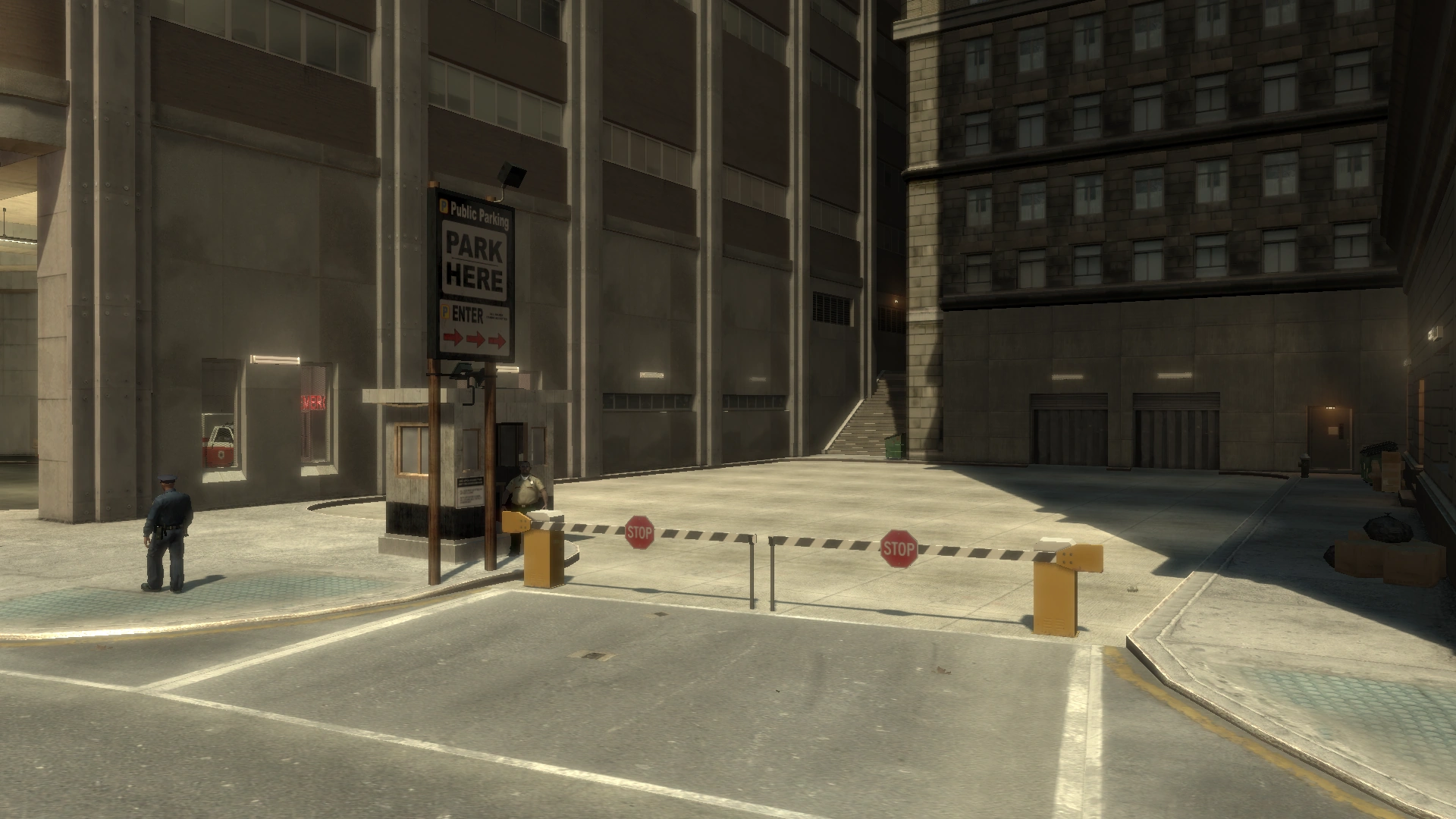 Public car parks are recognisable by a "Public Parking" or "Park" sign. Most of them are guarded and have stack parking systems. NPCs can sometimes be seen pulling into certain car parks.