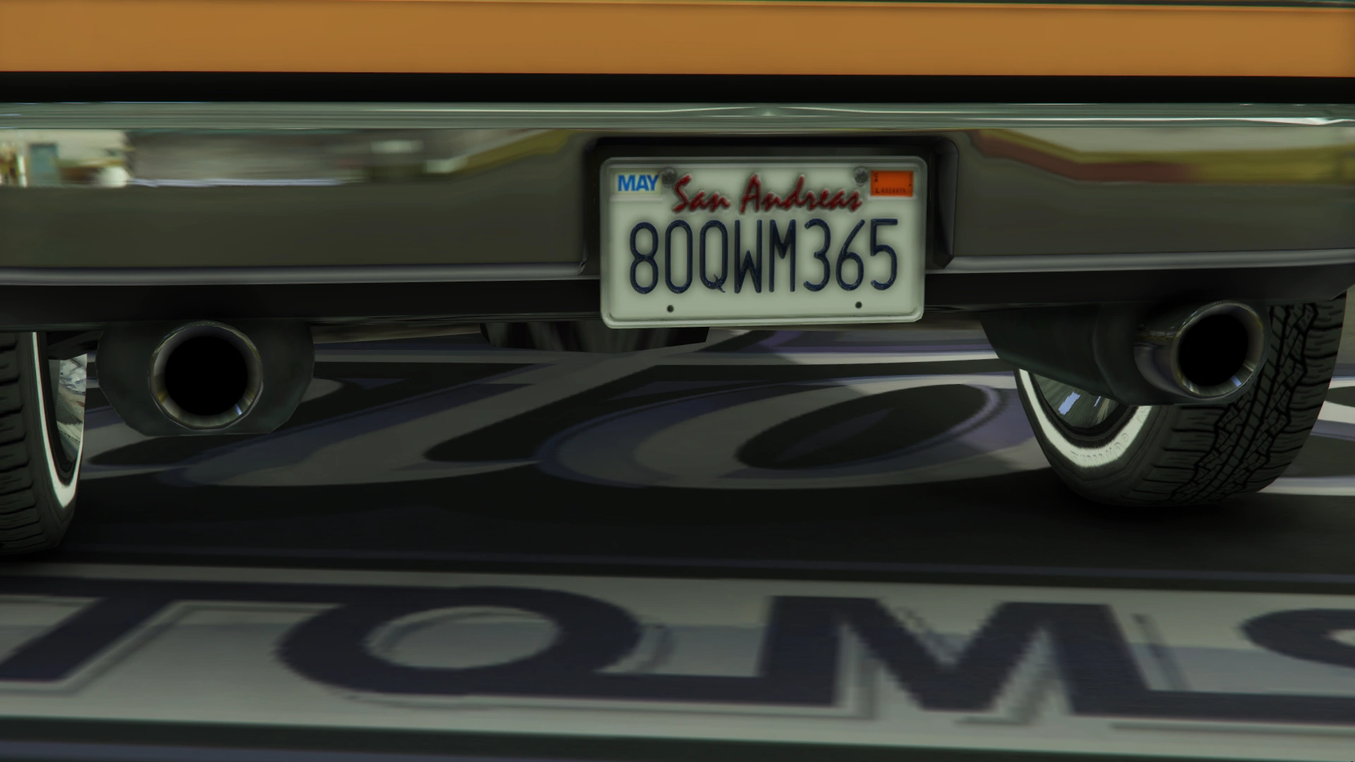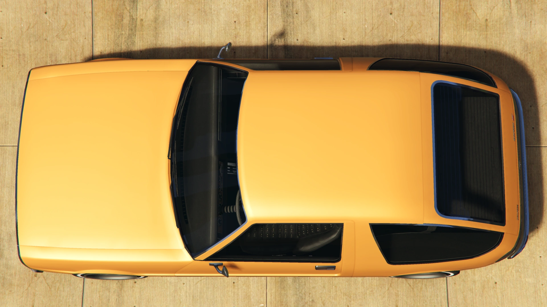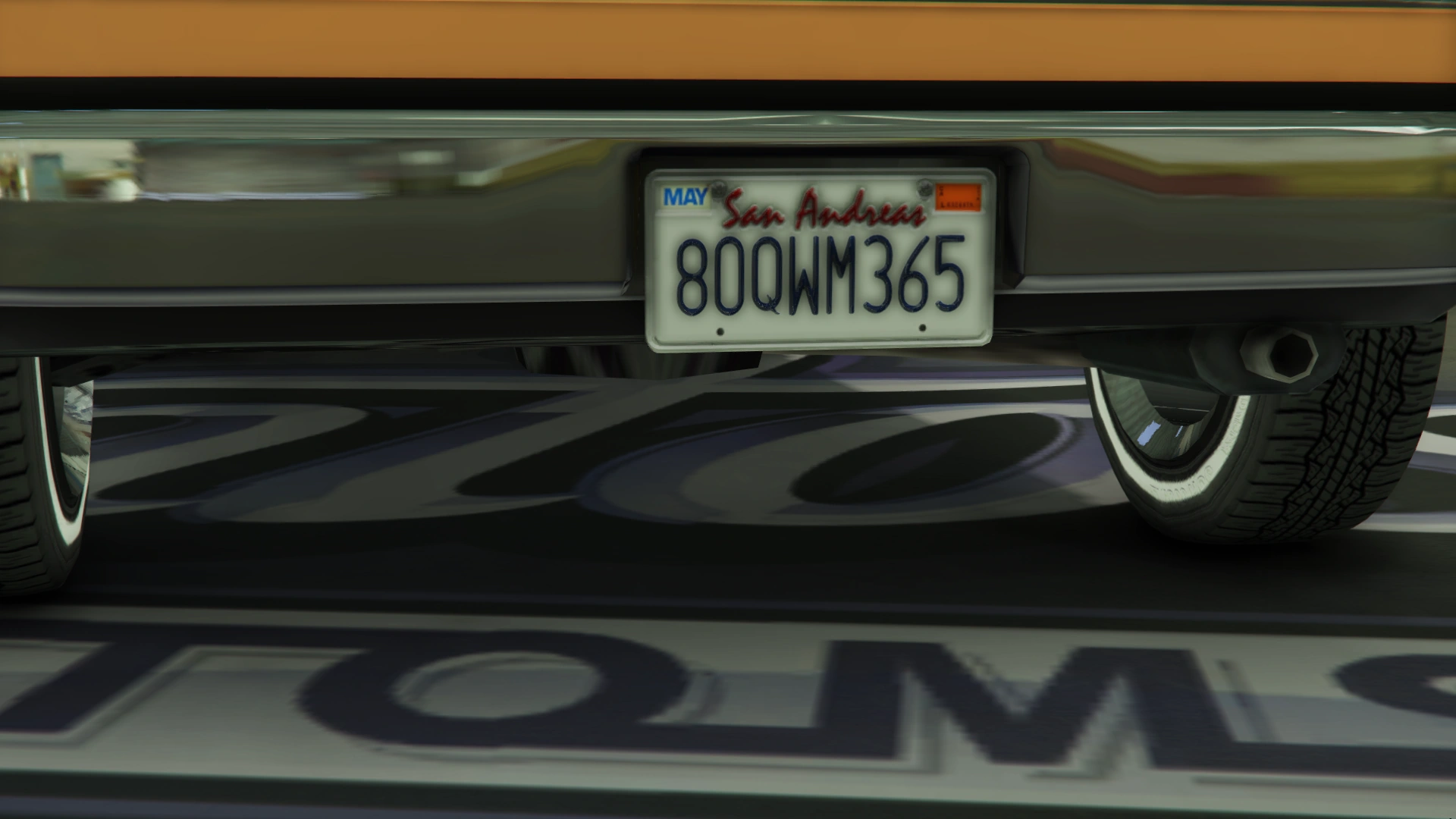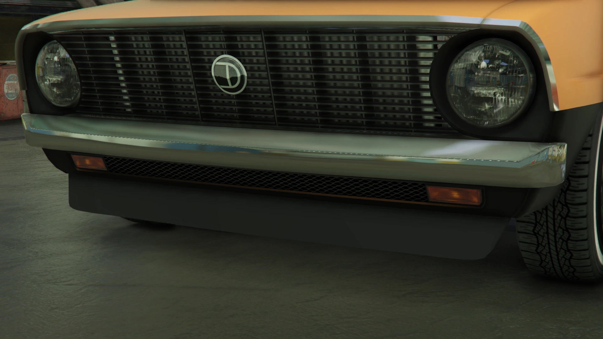 Color distribution is the same as its previous iteration. Its wheels are seemingly identical to the "Revolver" muscle rims available in Los Santos Customs, although fitted with whitewall tires.