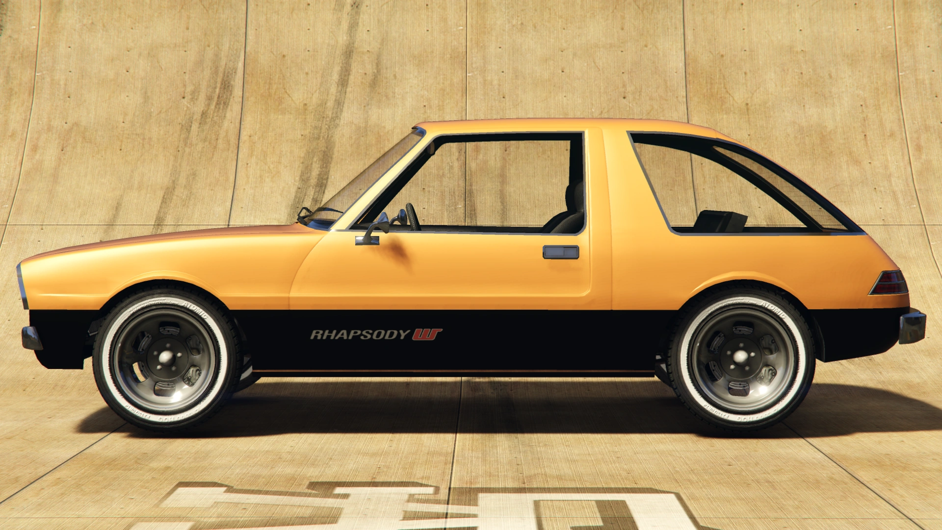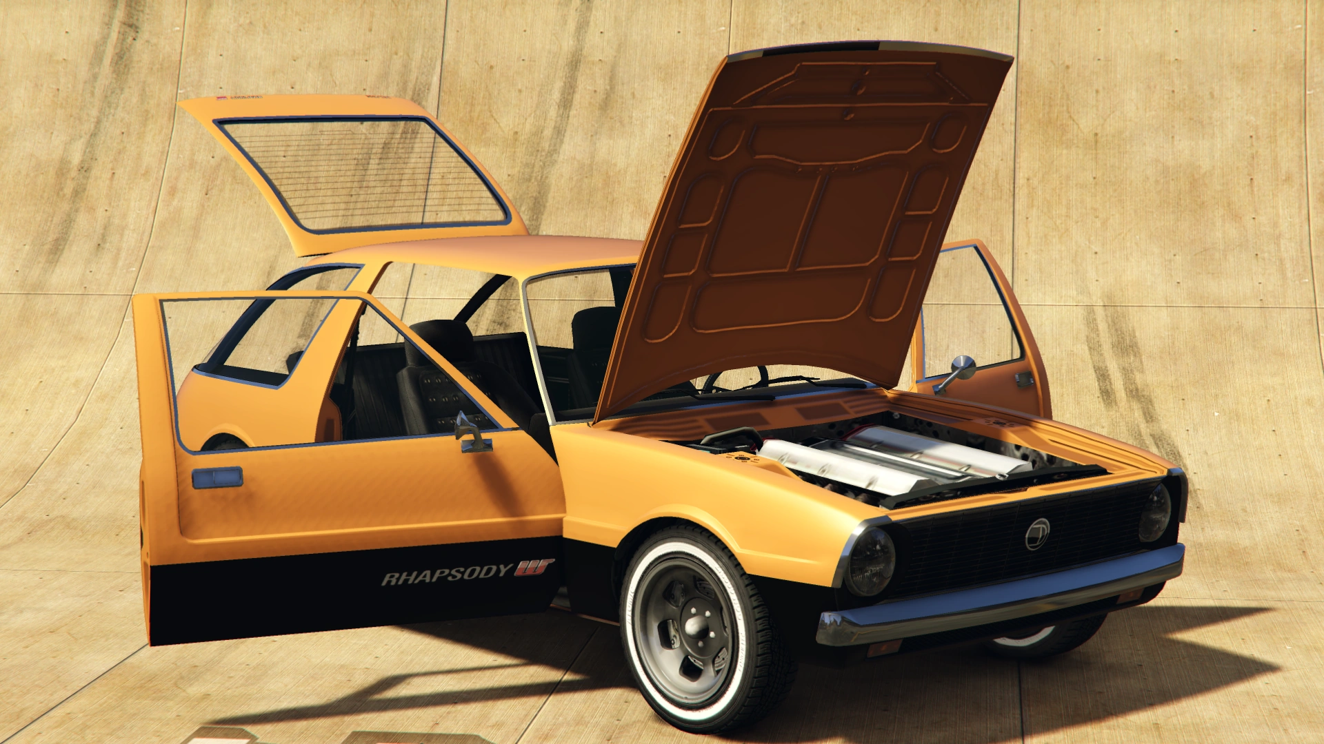 The Rhapsody in Grand Theft Auto V is mostly unchanged, but features body modification options that include a ducktail spoiler, fender flares, and a bumper lip, a reference to the original Volkswagen Golf GTI.