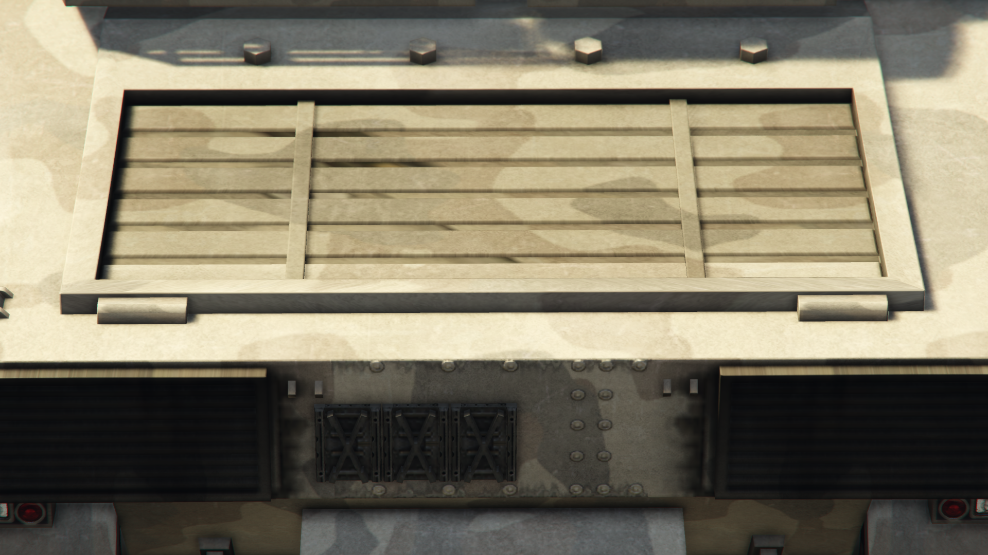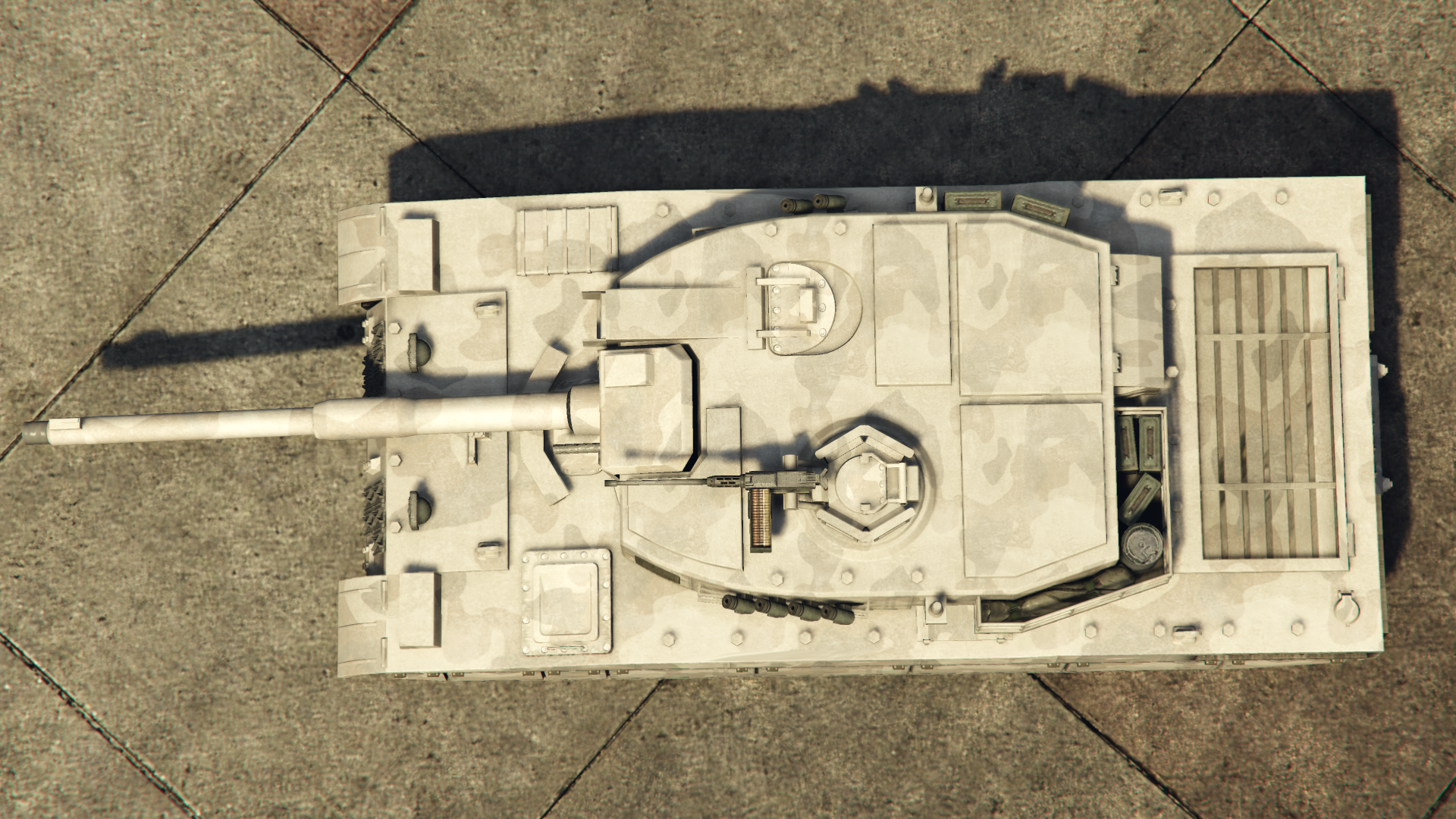 The front of the hull features what look like spare track links, while the top area mounts various headlights on the edges, consisting of dual inner circular units and outer square-shaped units split between the upper main lights and lower turn indicators, together with circular high-beam units in the center. The area near the turret has what look like periscopes in the center intended for the driver, although there is an access hatch on the left that opens to reveal the driver seat. The sides have various armor plating that cover most of the tracks, while the rearmost section has rectangular vents, with the side ones acting as the exhausts. The rear end has larger vents on the edges and additional spare track links in the center, followed by a set of tail lights that consist of dual circular main units on the outer sides, square reverse units in the middle, and circular brake lights on the inner sides. The turret is very detailed and features numerous accessories, being ammo boxes, smoke grenade launchers on each side, and a sighting unit located beside the main cannon, while the top features two unusable hatches with additional periscopes. The vehicle only spawns in a desert camouflage livery with a rather worn appearance, with the files indicating it actually spawns in a white color.