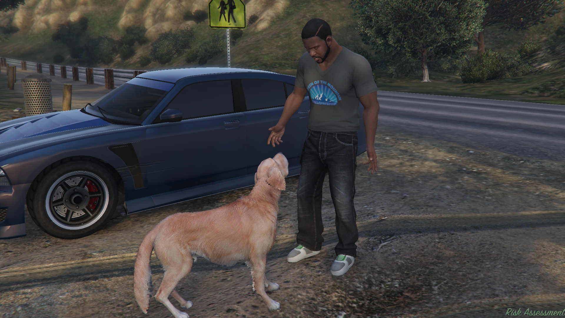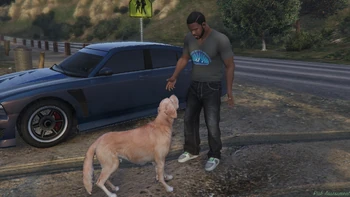 While traveling through Vinewood Hills, Franklin comes across a barking dog. Franklin is somehow capable of understanding the dog and follows the animal along a dirt path to where Dom is hanging by the lines of his parachute from the branches of a tree overlooking the Sisyphus Theater. Franklin helps Dom out of the tree, then tells the adrenaline junkie how his dog led him to the scene.