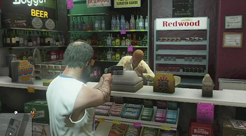 Trevor robbing a liquor store.