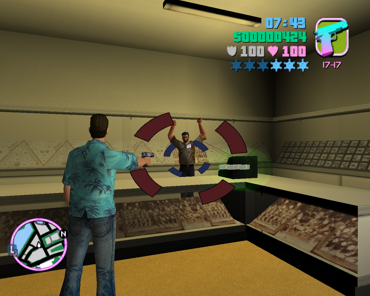 Auto-aiming at a jewelry show attendant as he drops money on the counter in GTA Vice City.
