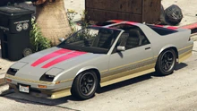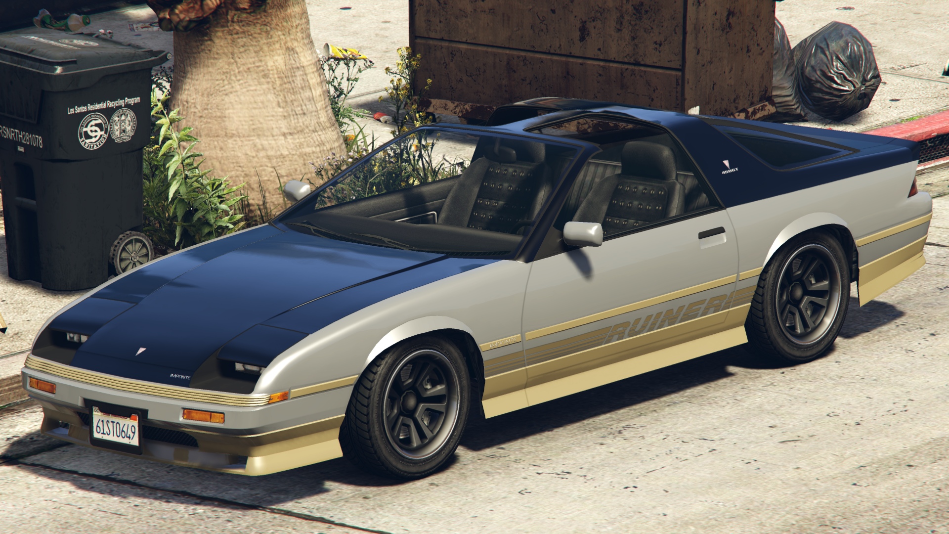 As of Patch 1.29, the three T-Top roof options from the GTA IV version are present but cannot be changed by the player and are random at spawn. All variants spawns with its windows rolled up, even without roof panels. Color distribution is the same as before, but the mirrors changed to receive the primary color and the interior stitching matches with the same primary one. The Ruiner's rim design is the same, able to be found in Los Santos Customs under the Muscle category, named "Mecha". There is also an off-road counterpart under the Off Road category, named "Dune Basher". Unique to the stock rims, however, is that the wheel color has a darker tone (although painting the stock wheels is only possible on Content Creator).