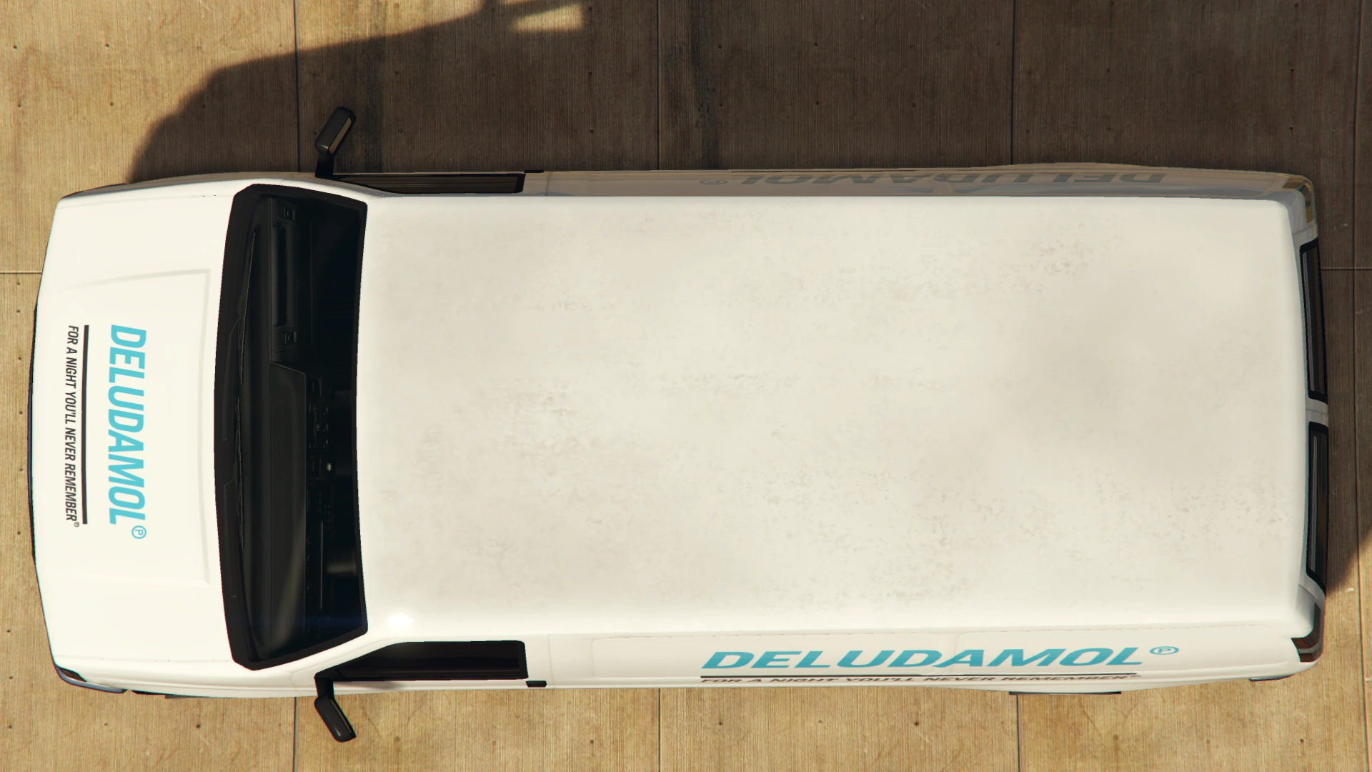 The van remains almost identical to the regular Rumpo, but with a Deludamol livery and four Deludamol boxes in the rear compartment. These boxes are static props that are part of the vehicle model, and therefore cannot be dislodged or removed.