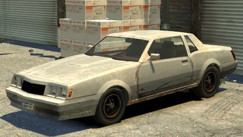 The Sabre is one of a few cars in that can be found as a beater - a rusted out version of the original car that has a ragged out engine that randomly backfires when shifting gears, as well as featuring junky/shoddy bodywork, rusted out parts, occasionally missing headlights and grilles, and jutting exhaust pipes. Standard Sabres in GTA IV do not have hood scoops. However, beater Sabres feature cowl induction hoods. While the standard Sabres have two exhaust pipes that ends on the rear, the beater versions have twin exhaust pipes that ends on the right side, at front of the rear right wheel.