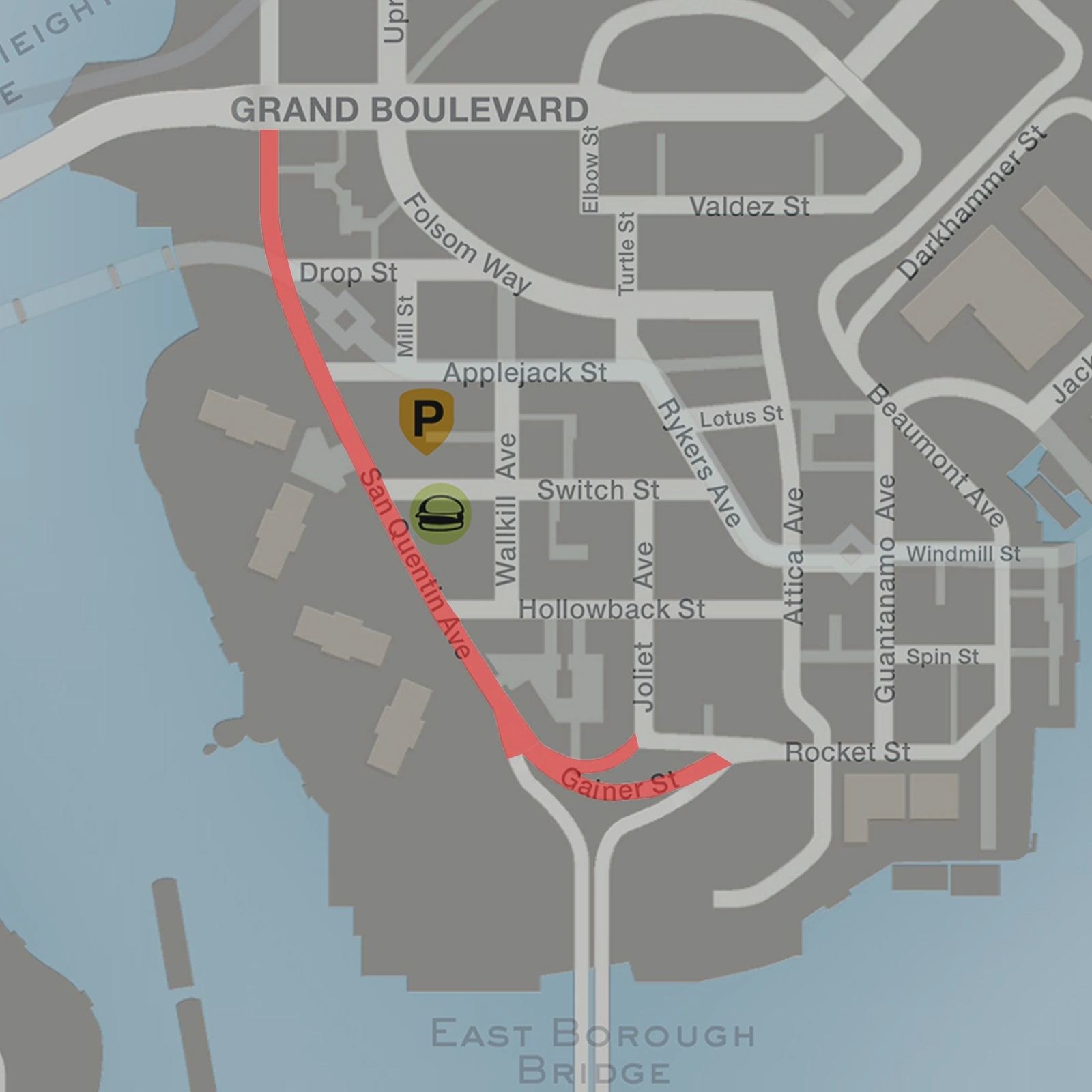 Entering Bohan from Northwood Heights Bridge and immediately turning right is where San Quentin avenue starts. Grand Boulevard within Boulevard neighborhood is the north border of the avenue. Then, it travels through western Fortside, next to San Quentin station and then next to Fortside branch of Burger Shot. Then it travels through western South Bohan by South Bohan Projects. Going further, there is an exit to East Borough Bridge and a road split. One way that leads to an intersection with Joliet Street and Rocket Street. The other way leads to Gainer Street[ref?ref?Gainer street might be just a continuation of San Quentin avenue.] which leads to Rocket Street.