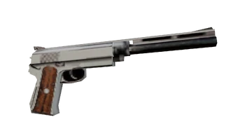 Despite its name, the pistol was not actually based on the Colt M1911, but rather the Wildey Magnum, a large-calibre semi-automatic magnum handgun. The weapon being suppressed in the game is also erroneous; the long extension seemingly assumed to be a suppressor on the weapon's model is simply the handgun's barrel.
