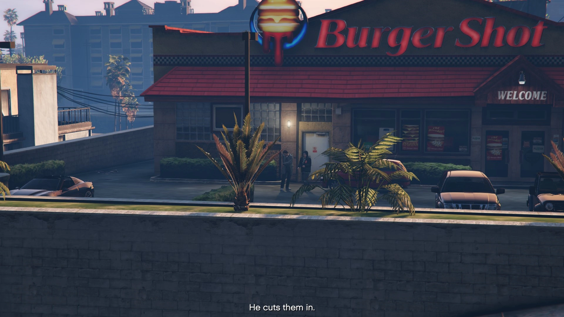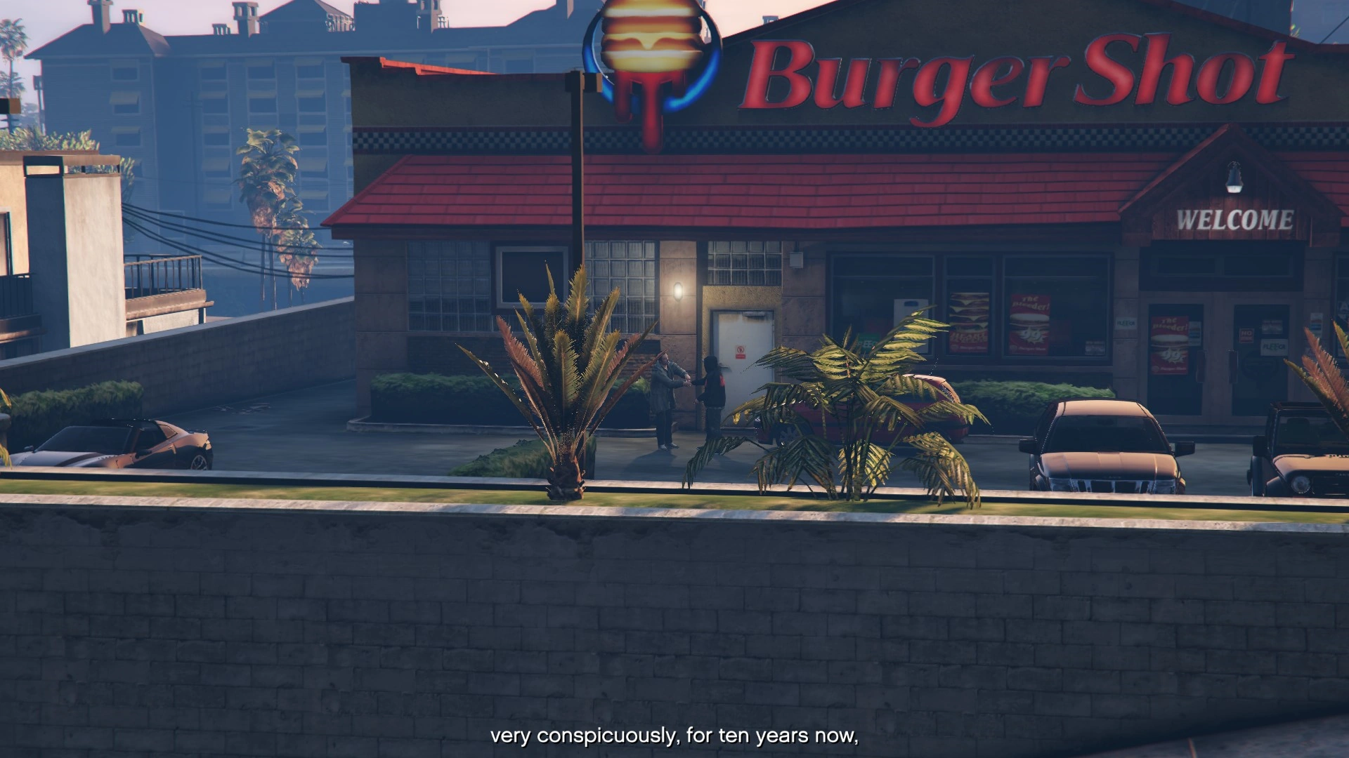 - Vincent's quote about the Burger Shot being Ahron's dealing spot for ten years is also a recall to Grand Theft Auto V, which is set in 2013, roughly a decade prior to The Cluckin' Bell Farm Raid.