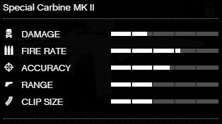 The Special Carbine Mk II slightly improves over the regular Special Carbine in damage (from 32 to 32.5), with the same rate of fire. Compared to other assault rifles, it has the second highest damage per second, only beaten out by the Bullpup Rifle Mk II but still outperforms the Carbine Rifle Mk II and Assault Rifle Mk II. (The latter of which has an elevated damage model of 40 but is offset by having the lowest rate of fire).