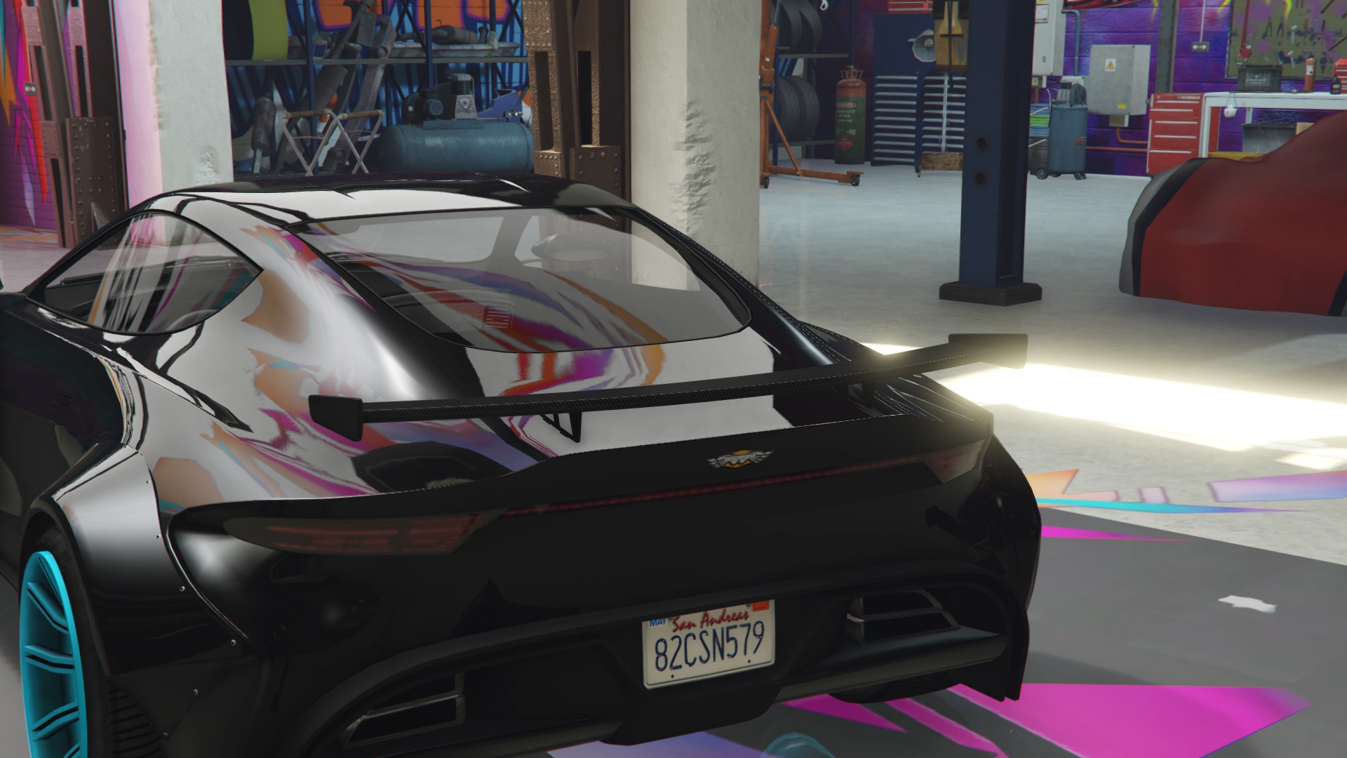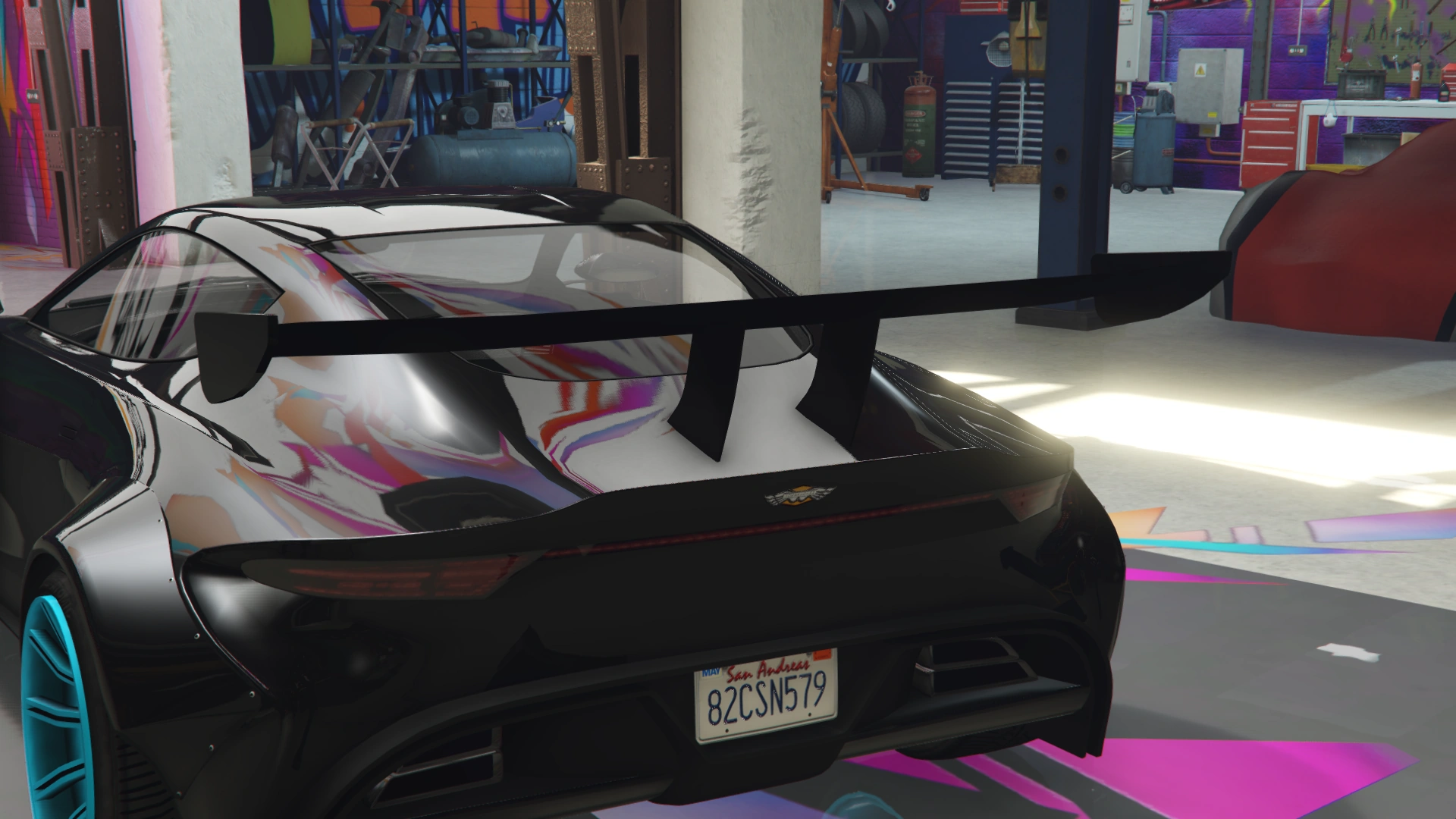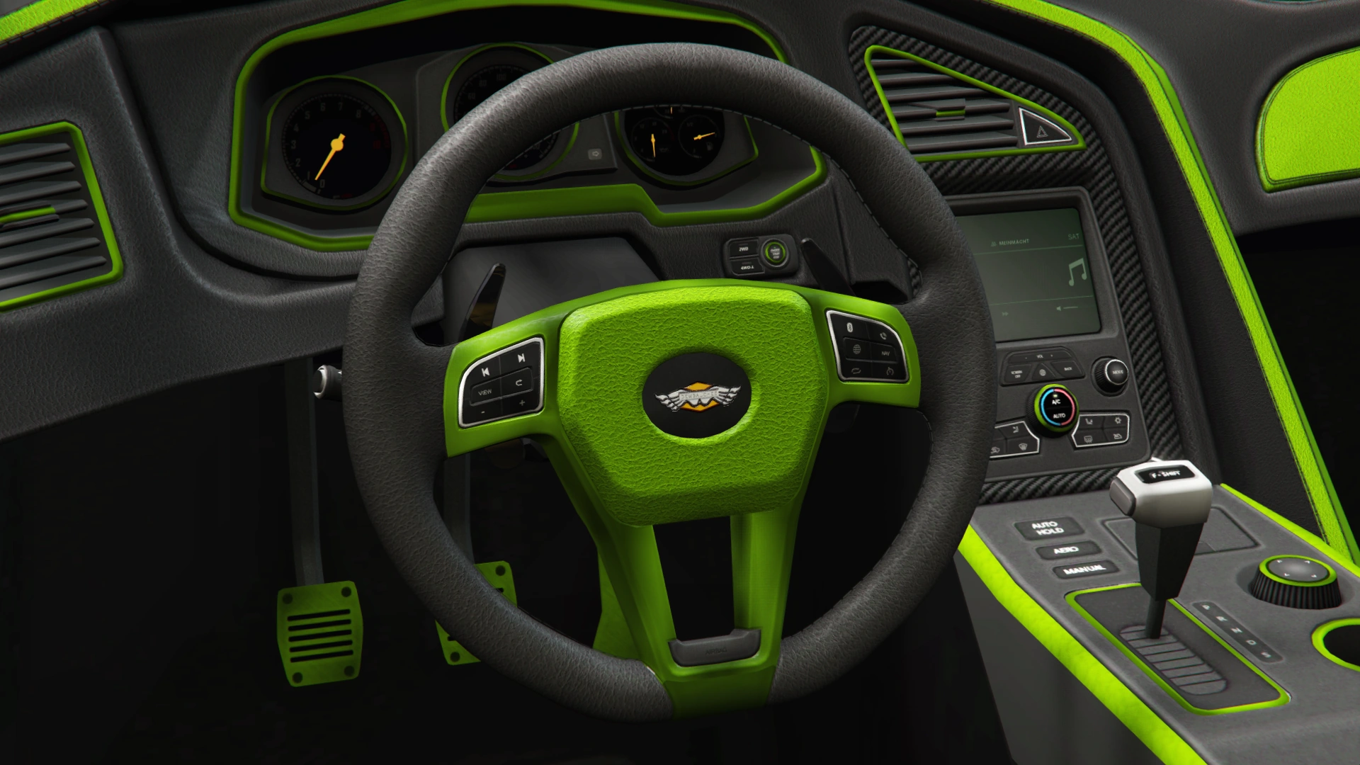 The Specter Custom is essentially a custom variant of the Specter, sharing the same body shape and features as the standard model, but featuring wide-body fender arches and the wheels were moved further away from the body to align with the fender arches. The vehicle does not appear to be based on any specific real-life motorsport vehicle, simply being a motorsport variant of the Specter (which is mainly based on the Aston Martin DB10). Its interior reuses the same dials and components as the standard version, although there are modifications that allow the car to use race-type components, being digital displays and switches in place of the radio set.