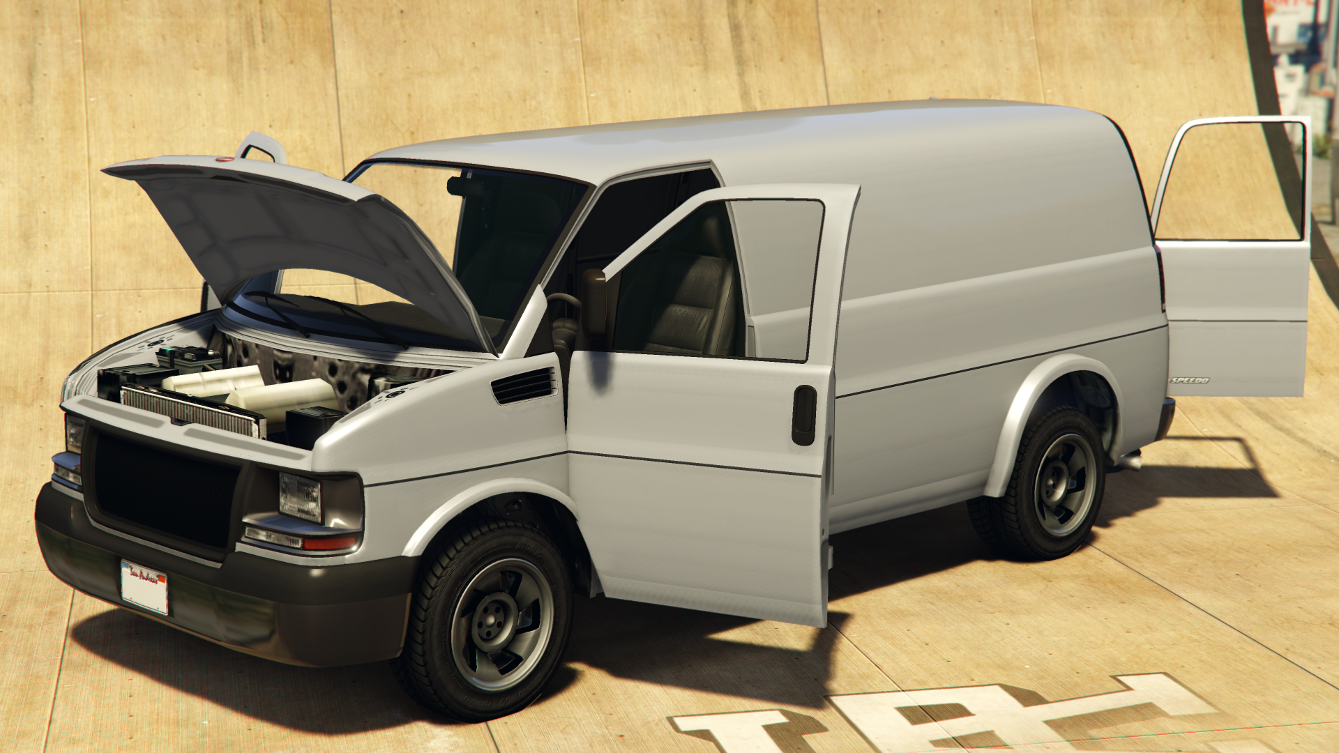 Compared to the original van, the personal vehicle variant of the Speedo Custom has slight adjustments to the first-person view camera positions for the rear cargo passengers, and permanently higher resolution textures on some customization options as the result of embedded high quality textures.