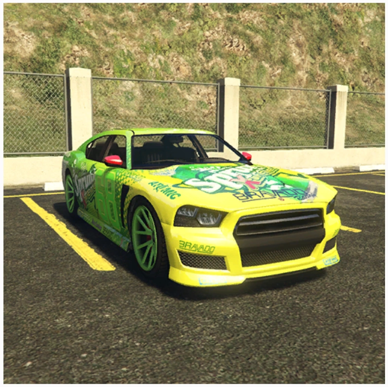 The Sprunk Buffalo is essentially a Buffalo S with a Sprunk racing livery, sharing the same derivatives. The stock car may be modified further in Los Santos Customs including the ability to respray the underlying color. The sponsorship decals cannot be changed or removed.