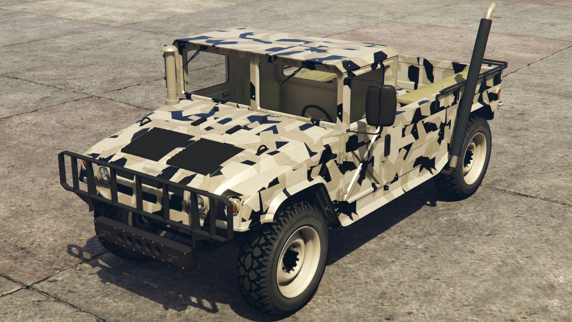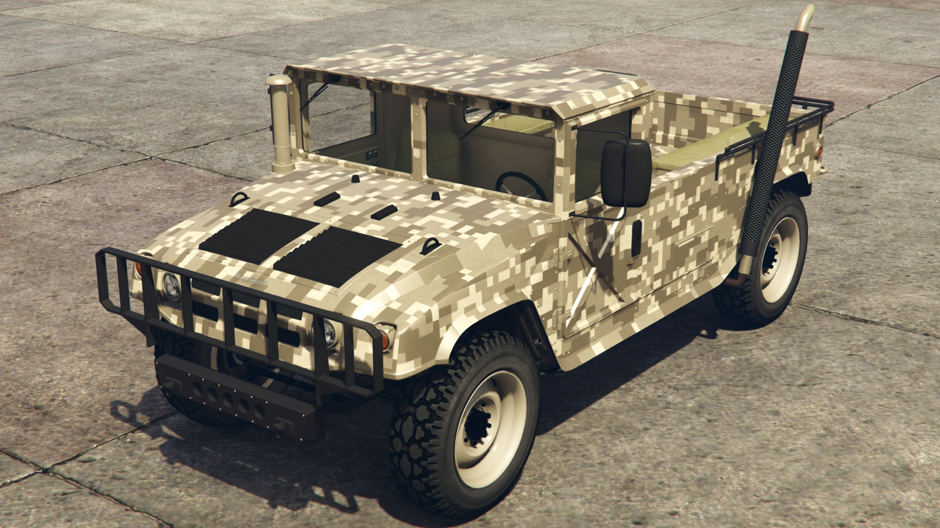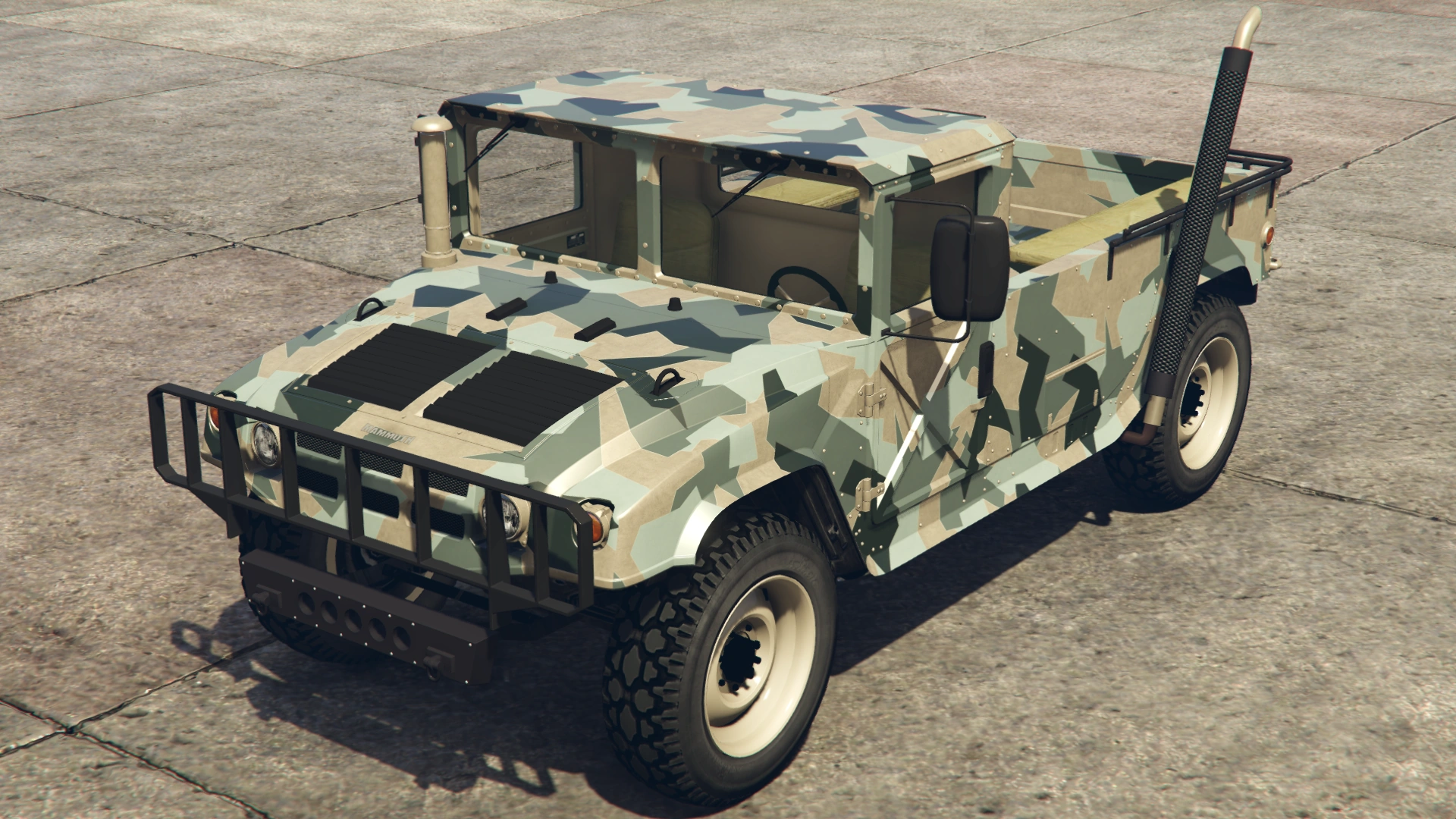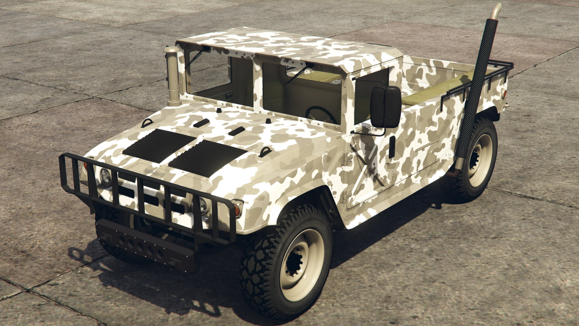 The Squaddie makes a return to Grand Theft Auto Online with the same layout as the beta model. However, its general design leans more towards the HMMWV/M1097 than the Hummer H2 (more similar to 3D Universe iterations of the Patriot), though still retaining the core body profile and dimensions of GTA V's Patriot, which is based on a H2.