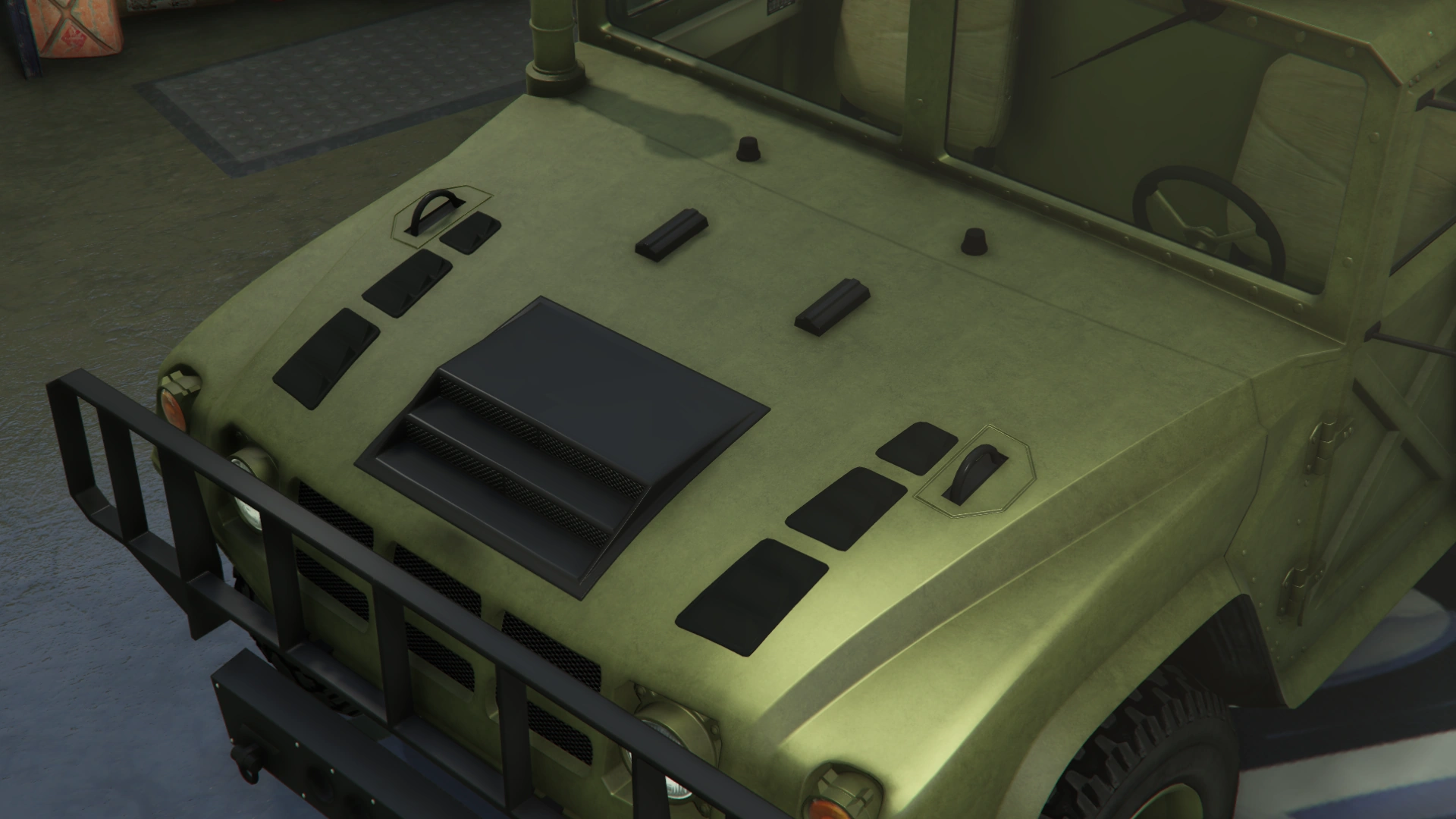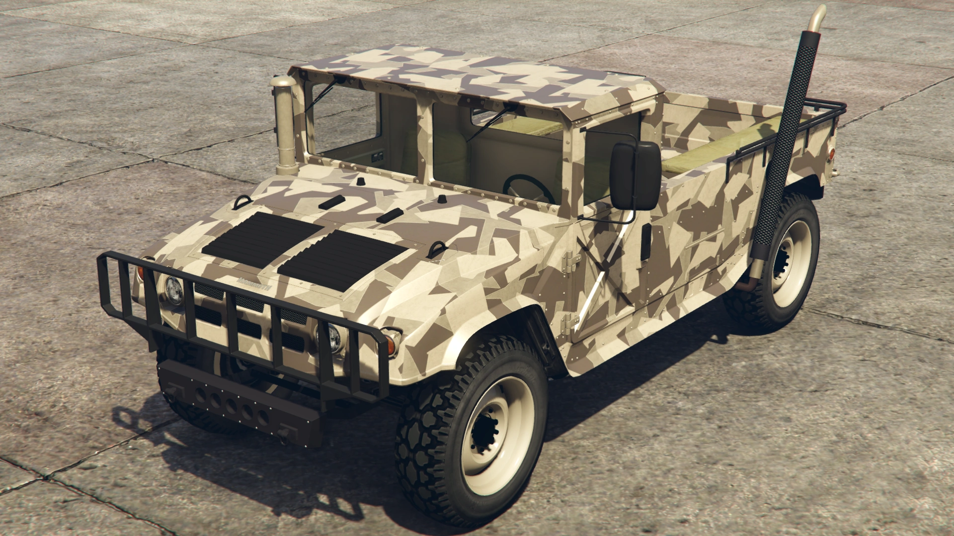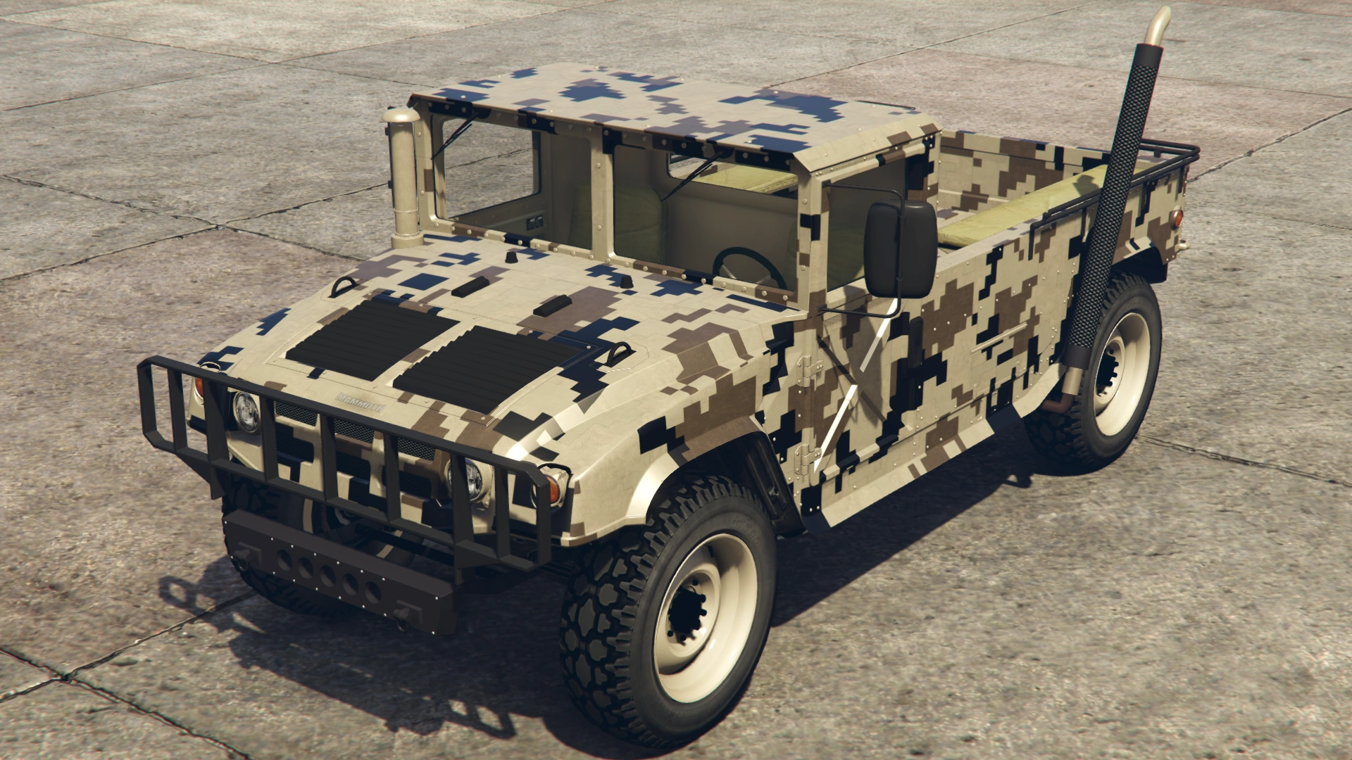 The Squaddie makes a return to Grand Theft Auto Online with the same layout as the beta model. However, its general design leans more towards the HMMWV/M1097 than the Hummer H2 (more similar to 3D Universe iterations of the Patriot), though still retaining the core body profile and dimensions of GTA V's Patriot, which is based on a H2.