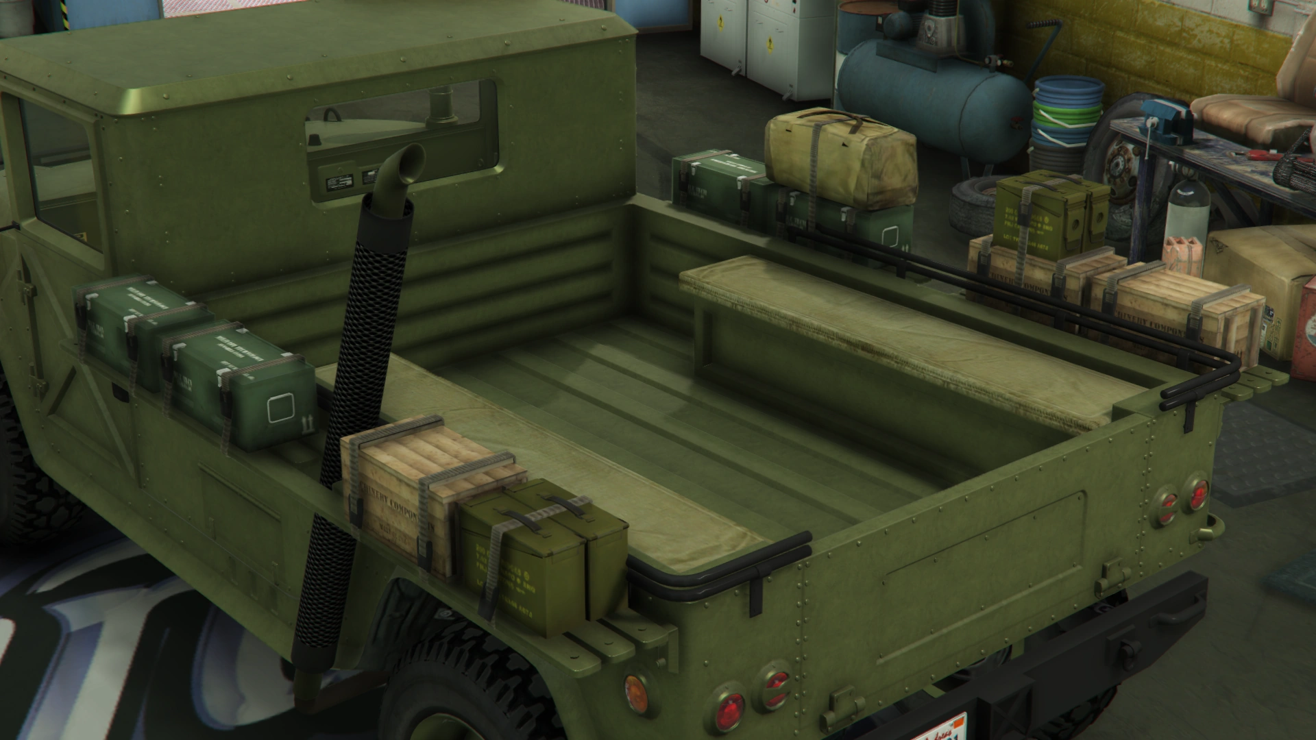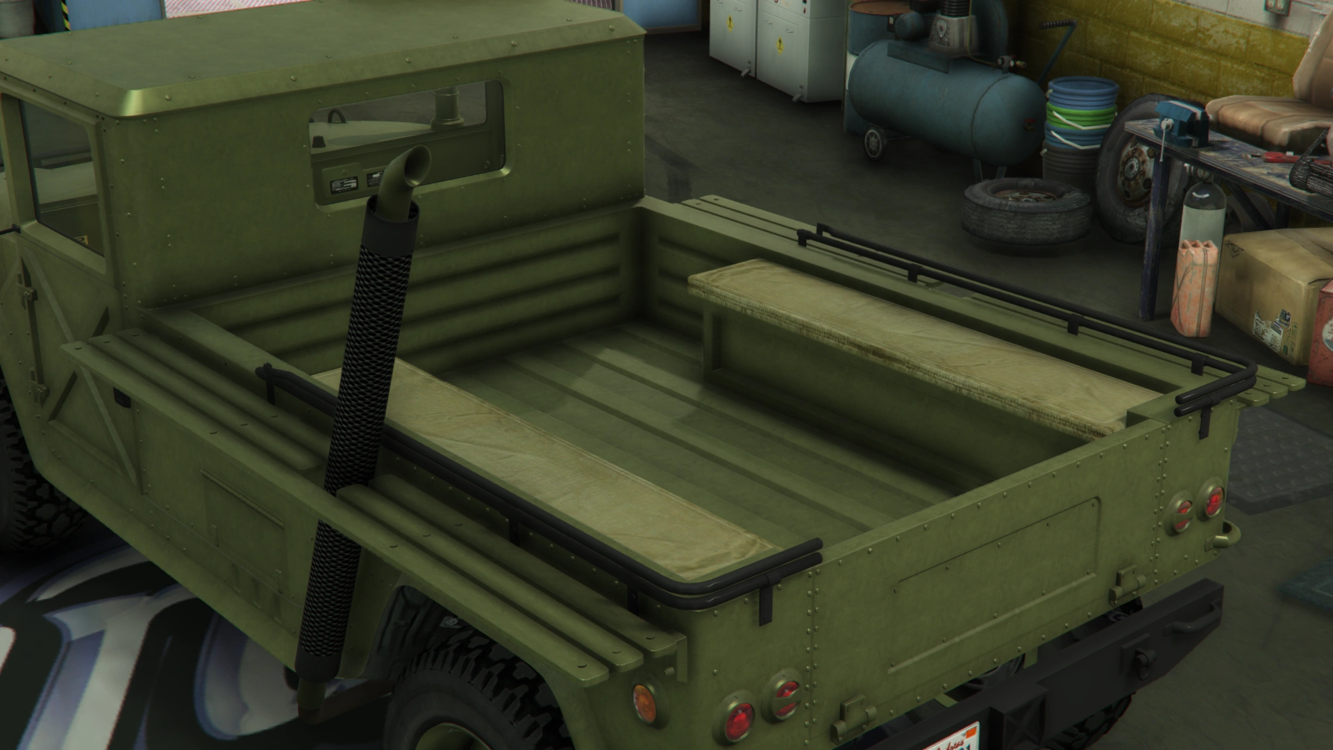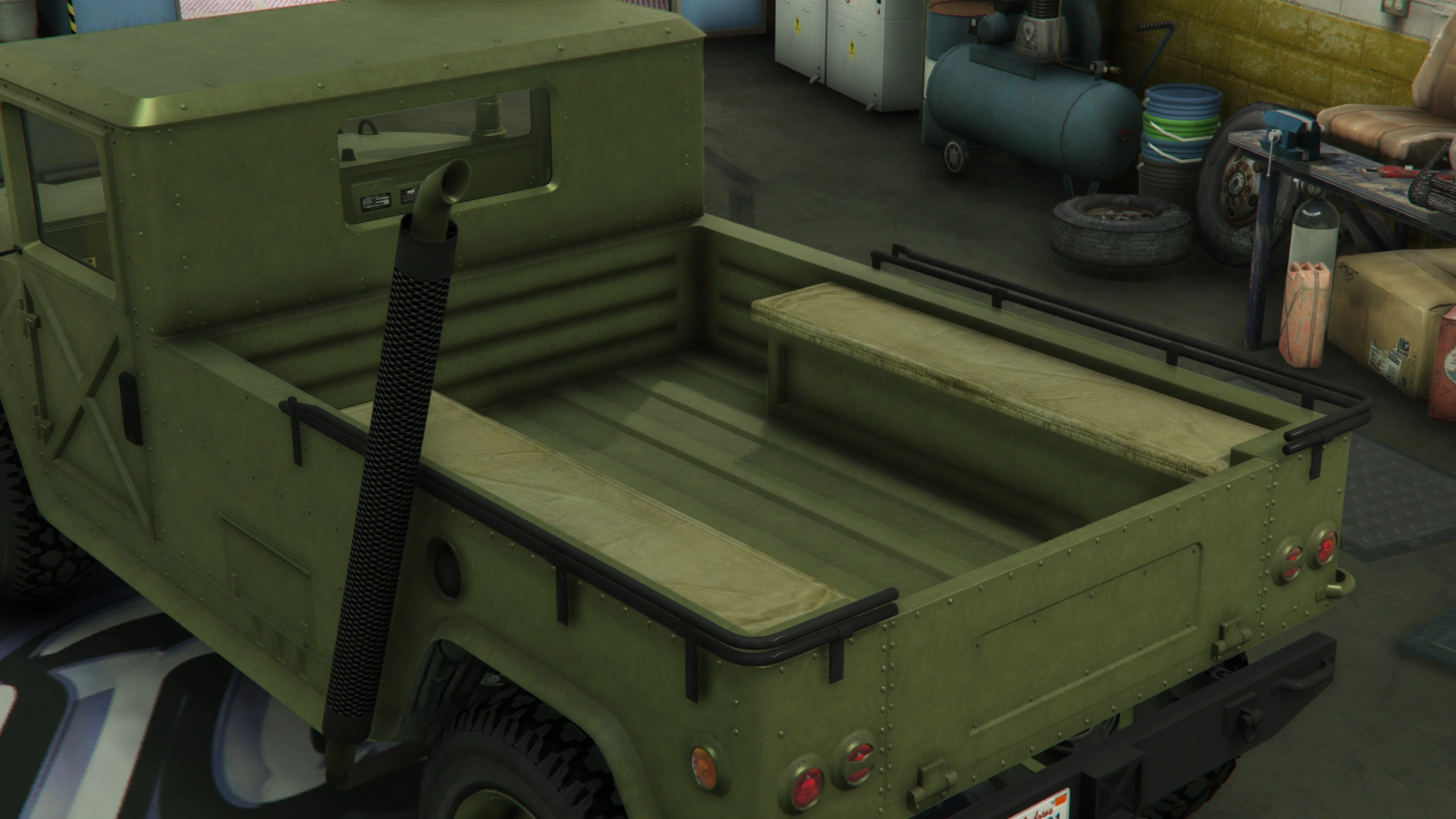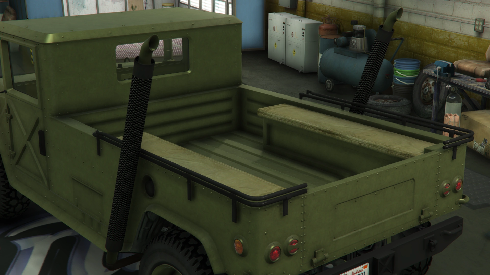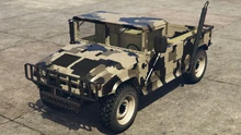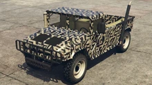 The primary color of the truck is applied on most of the bodywork, while the secondary color is applied on the doors and the roof. It uses a set of plain rims similar to the ones from the Winky, albeit with a black center and wrapped in high-profile tires. The rims can also support a dedicated color, although only naturally-generated examples may have one. Unlike the beta model, it no longer has the traditional desert camo livery, but instead uses standard camo liveries from the Gunrunning update.