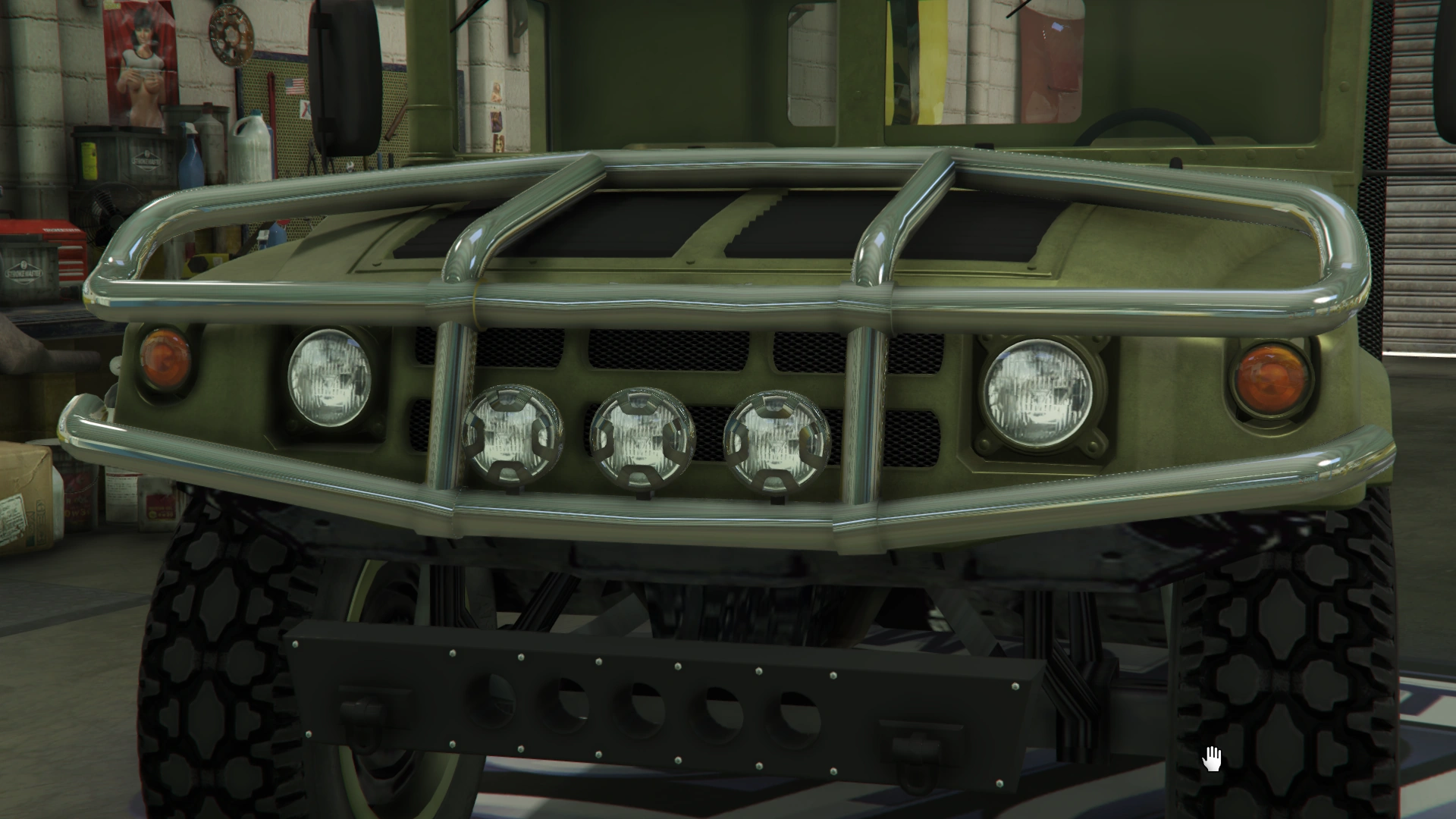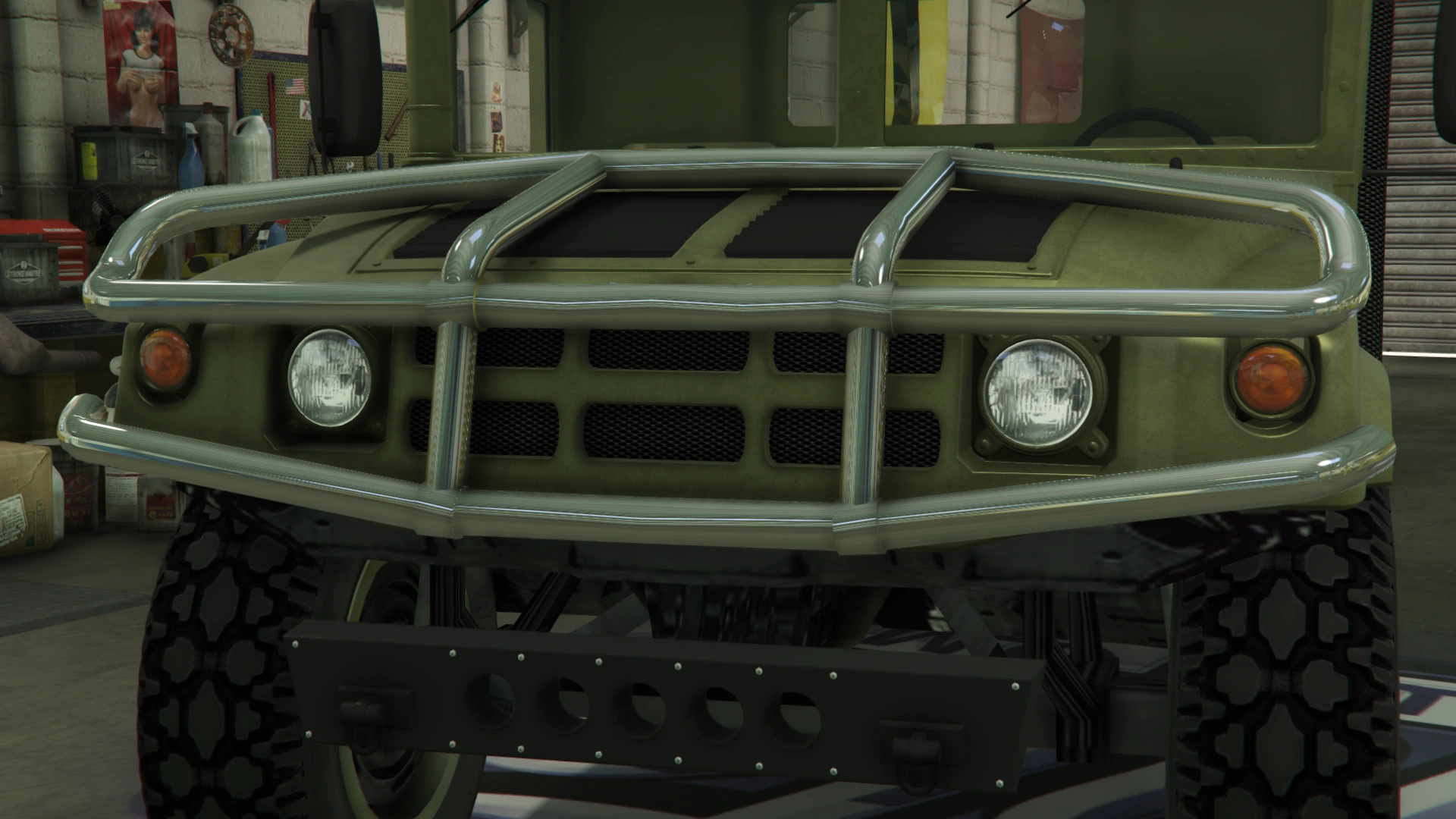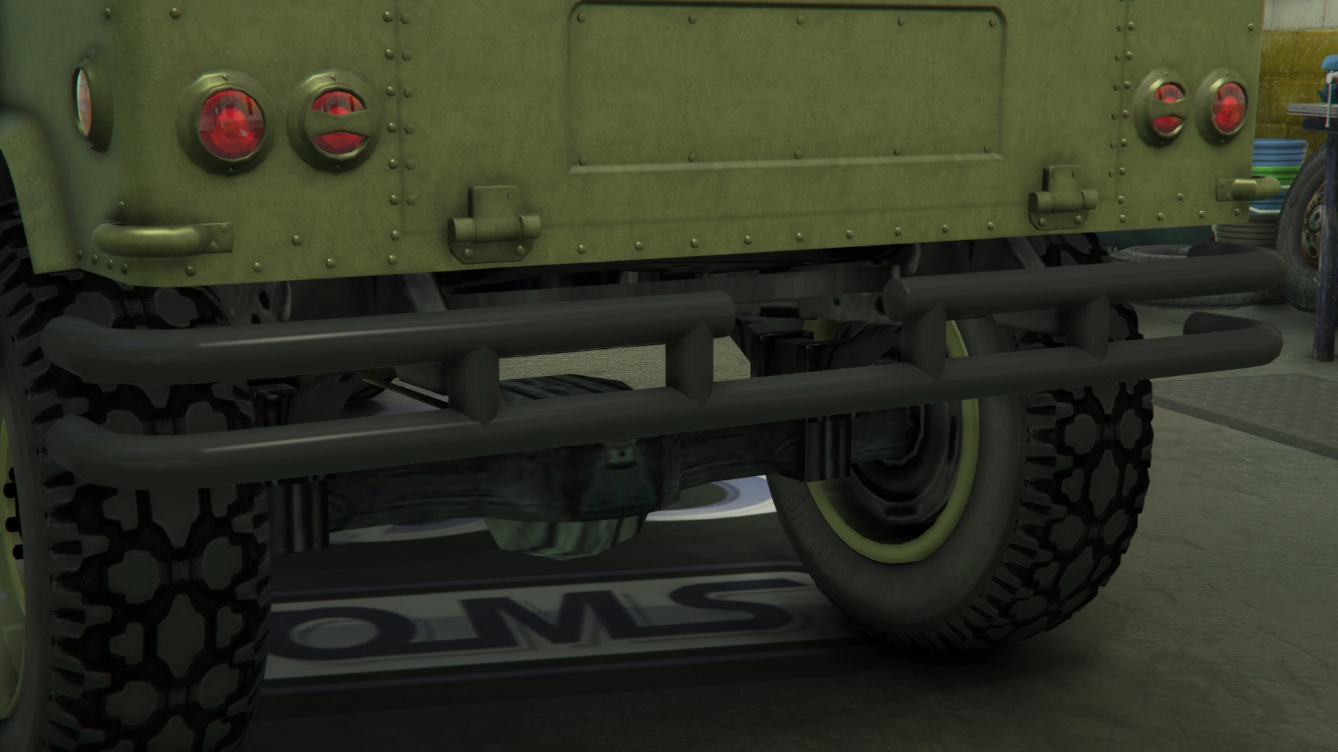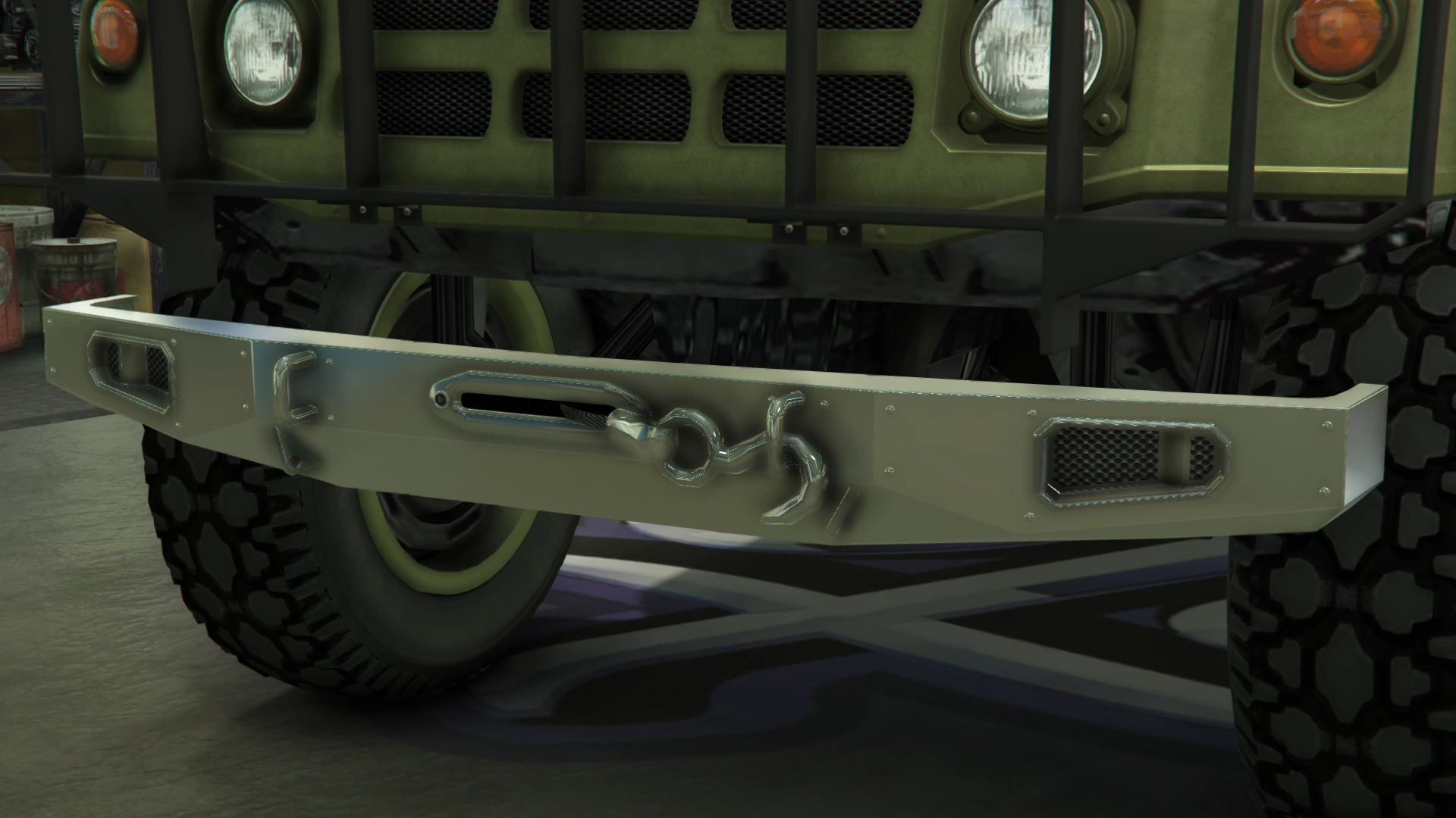 The primary color of the truck is applied on most of the bodywork, while the secondary color is applied on the doors and the roof. It uses a set of plain rims similar to the ones from the Winky, albeit with a black center and wrapped in high-profile tires. The rims can also support a dedicated color, although only naturally-generated examples may have one. Unlike the beta model, it no longer has the traditional desert camo livery, but instead uses standard camo liveries from the Gunrunning update.