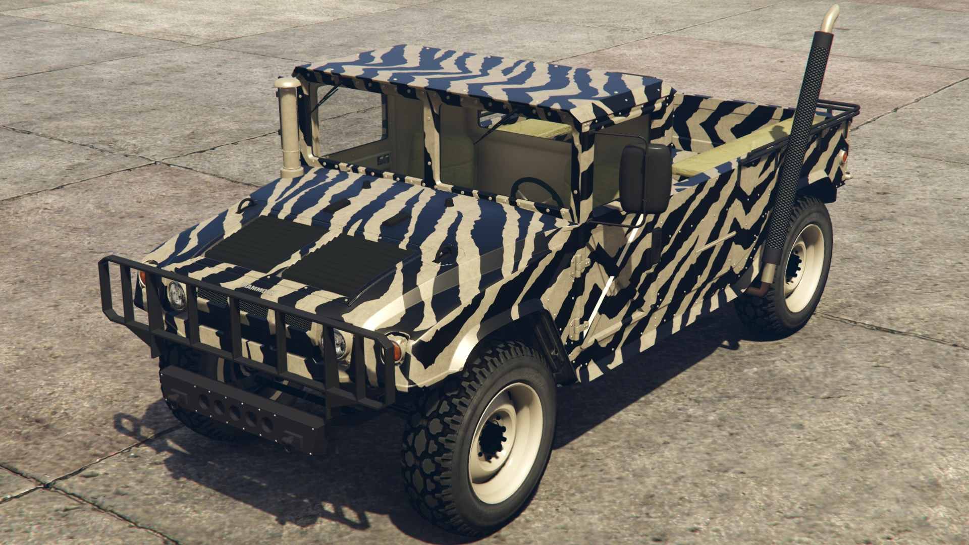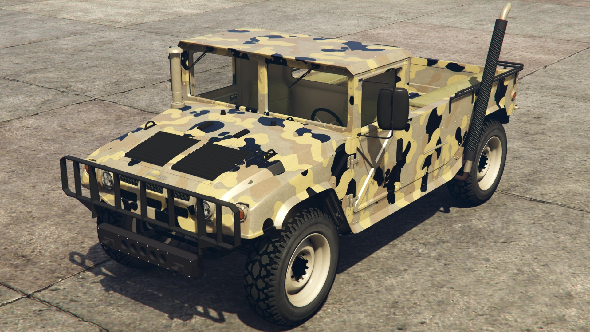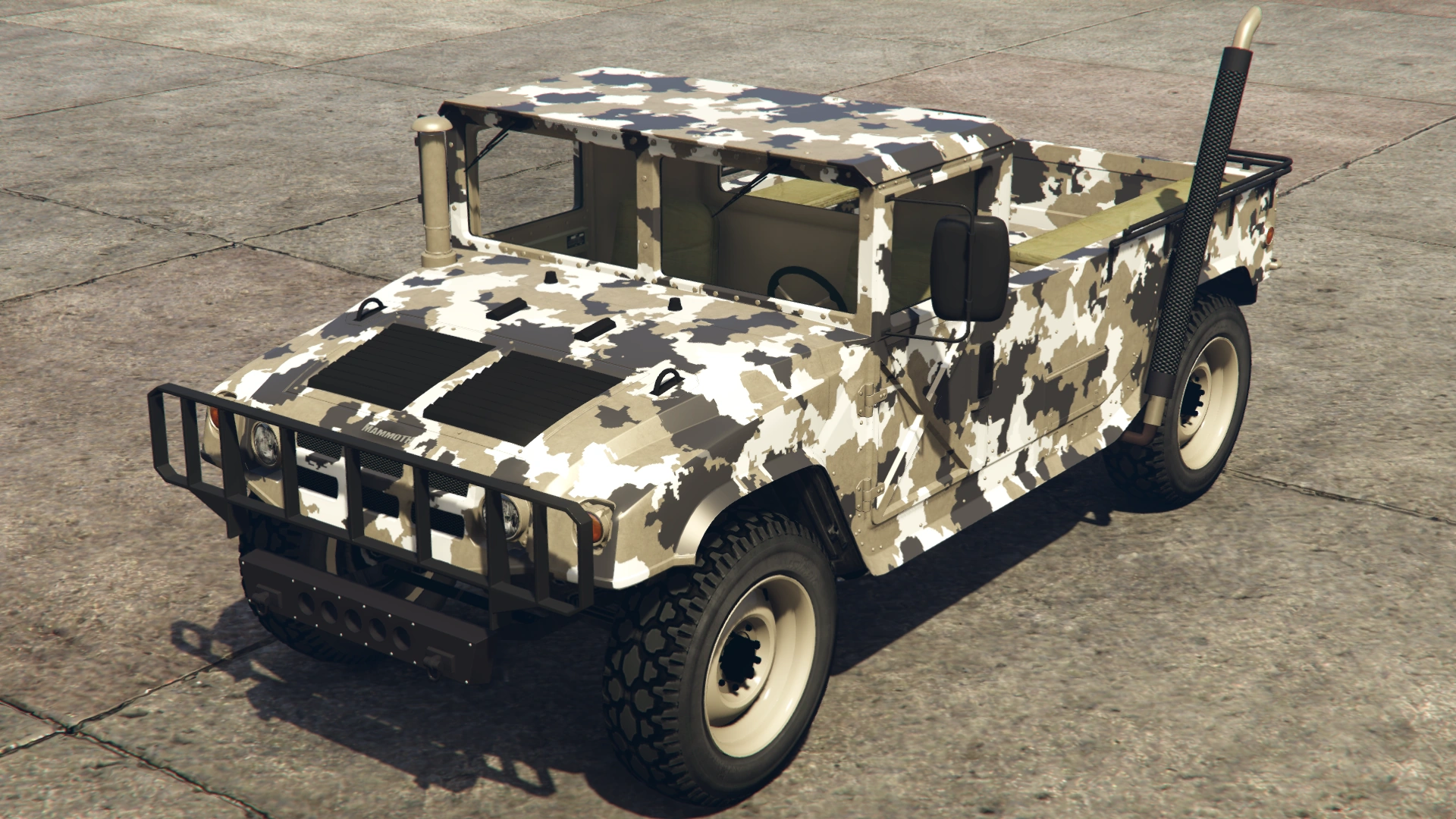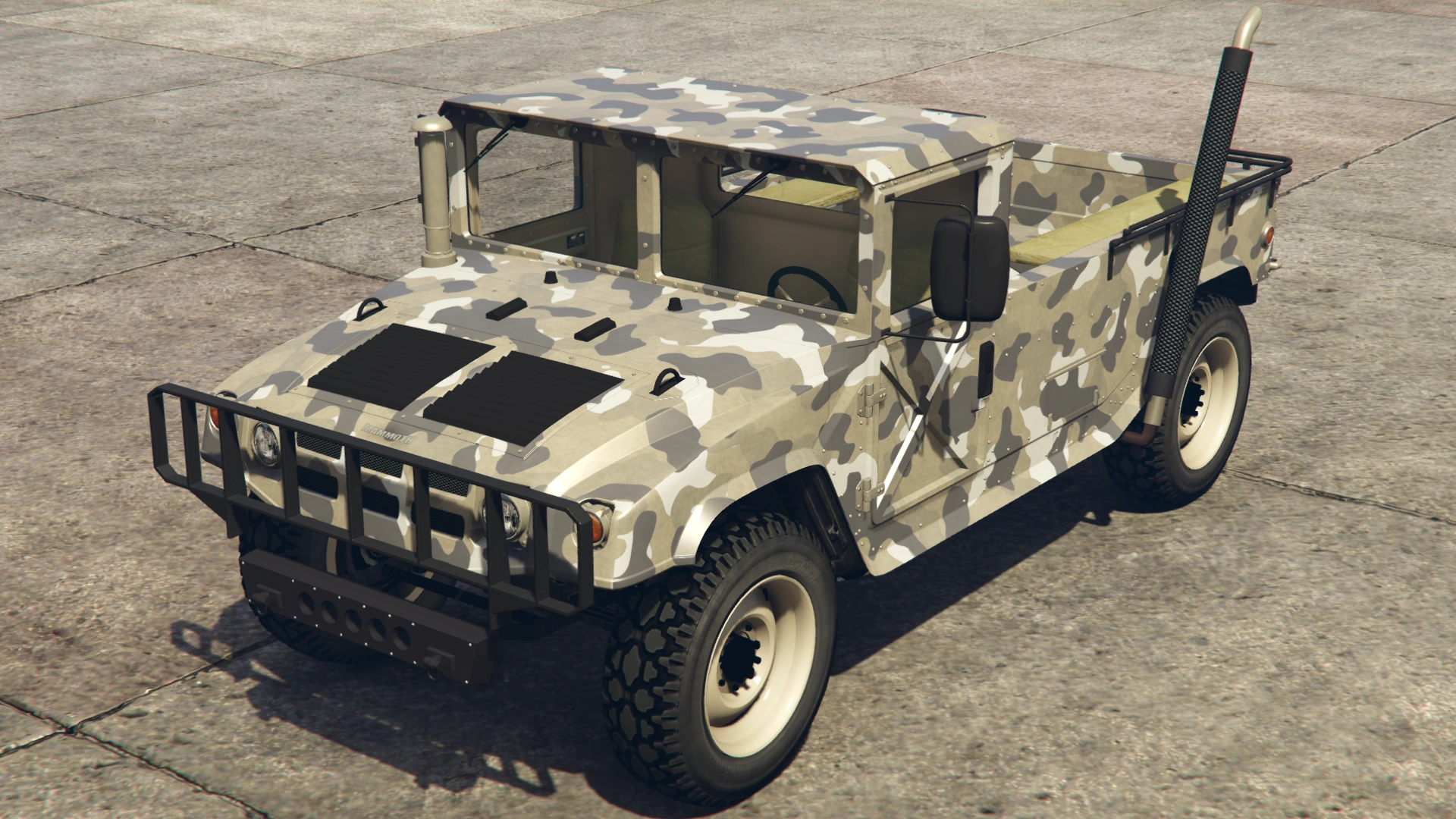 Based on the image, this version combined elements from the Hummer H2 and a Hummer H1/AM General HMMWV (specifically the M1097 variant, given the configuration). The front grille, headlights, hood, flared fenders and bottom sides were identical to the Patriot, but featured a small utility bumper, non-chromed front section, a square-shaped cabin, a split windshield and what seems to be a black air intake snorkel on the hood. The rear appears to feature side guard rails and canopy frames over it, presumably having enough room for passengers, similar to the Bodhi and the Bison. Like the Crusader and the Barracks, the vehicle featured a desert camo livery.