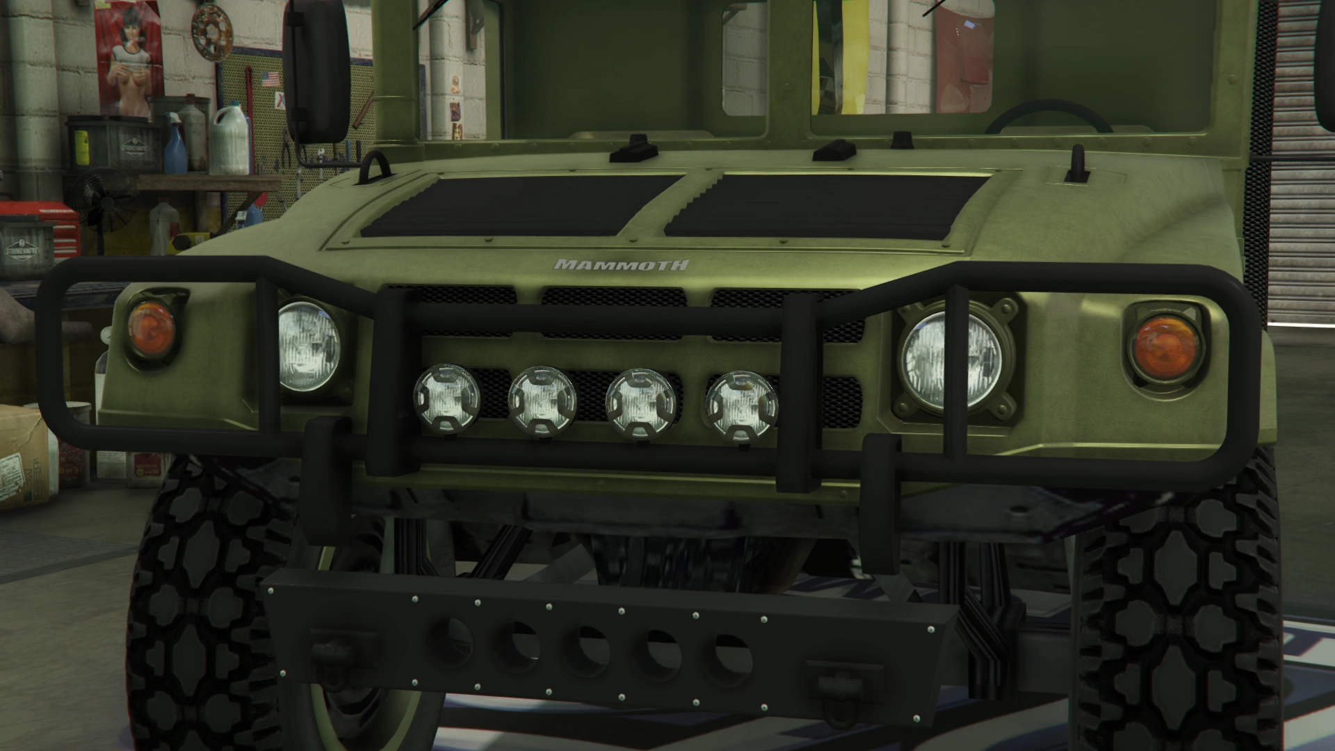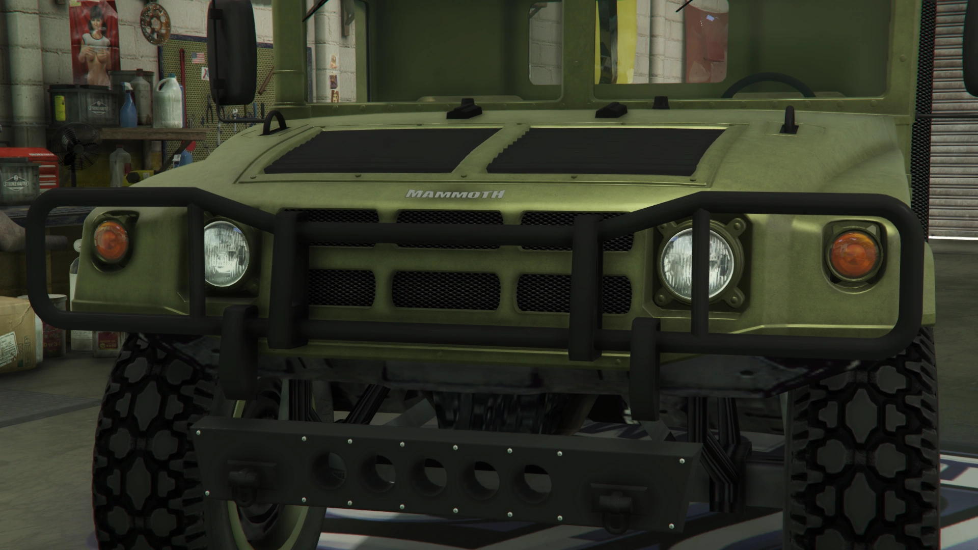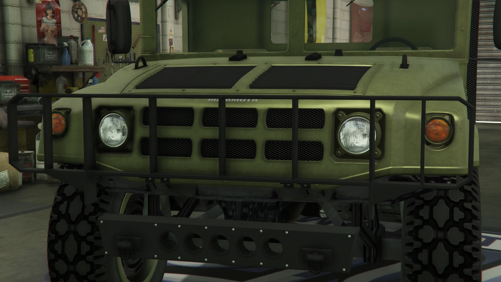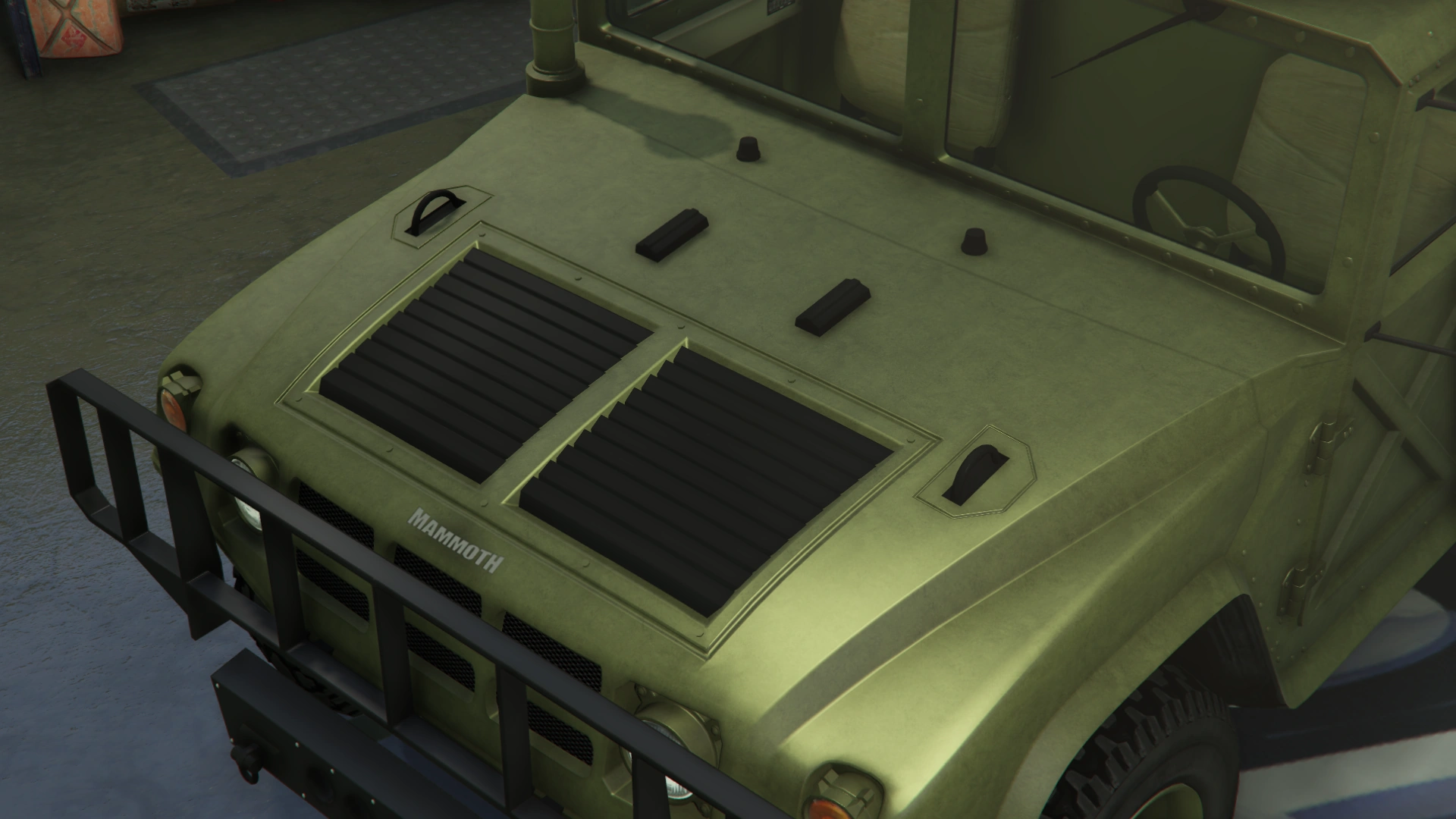 The vehicle assumes a more utilitarian appearance than before, featuring a bulky bumper with a wide guard that spans the whole width of the truck. Its front end assume a more unique design in comparison to the Patriot, featuring circular headlights and turn signals on the same locations as its civilian counterpart, along with a sectioned grille and a small "Mammoth" badge just above the same. The hood features two black slatted vents on the center, two small hooks and rubber details, along with a long body-colored air intake snorkel on the right. Like the Patriot, the front section hinges from the front and opens forward to reveal the engine bay.