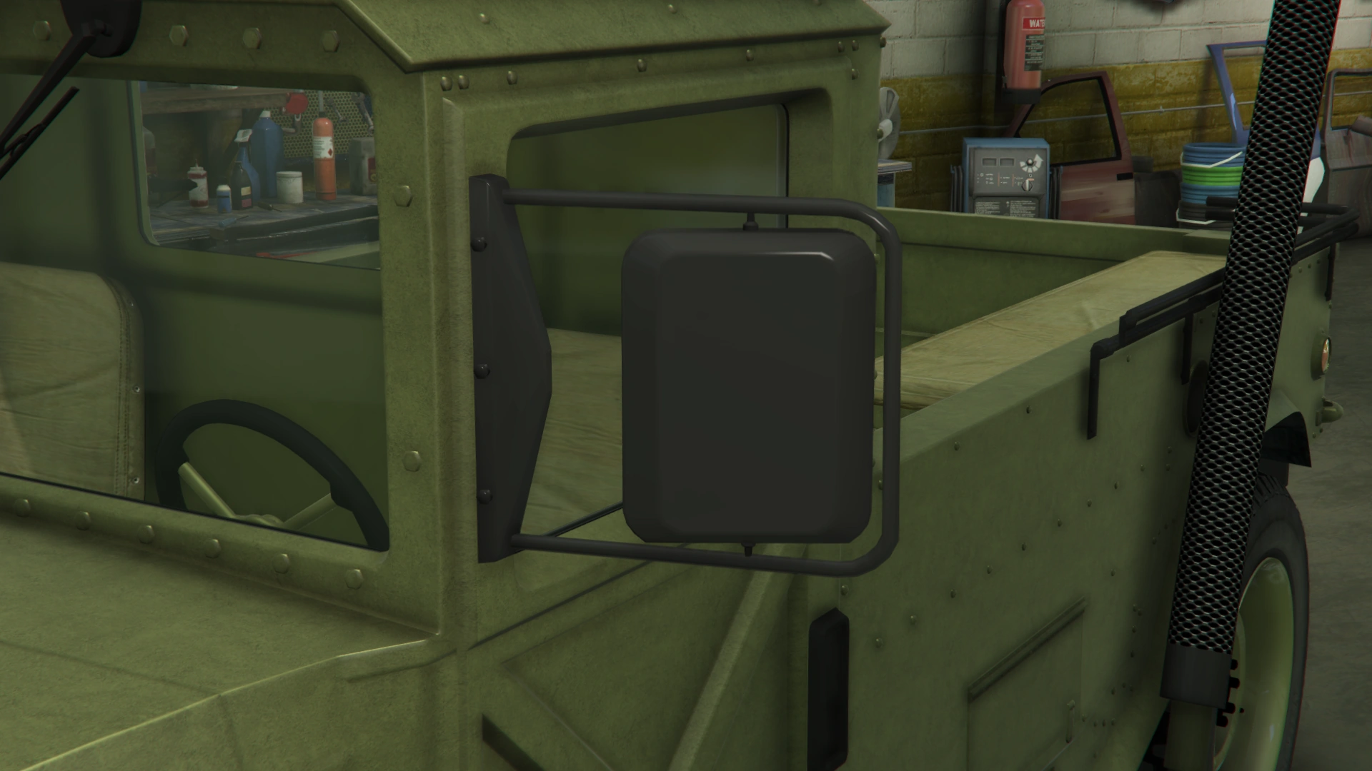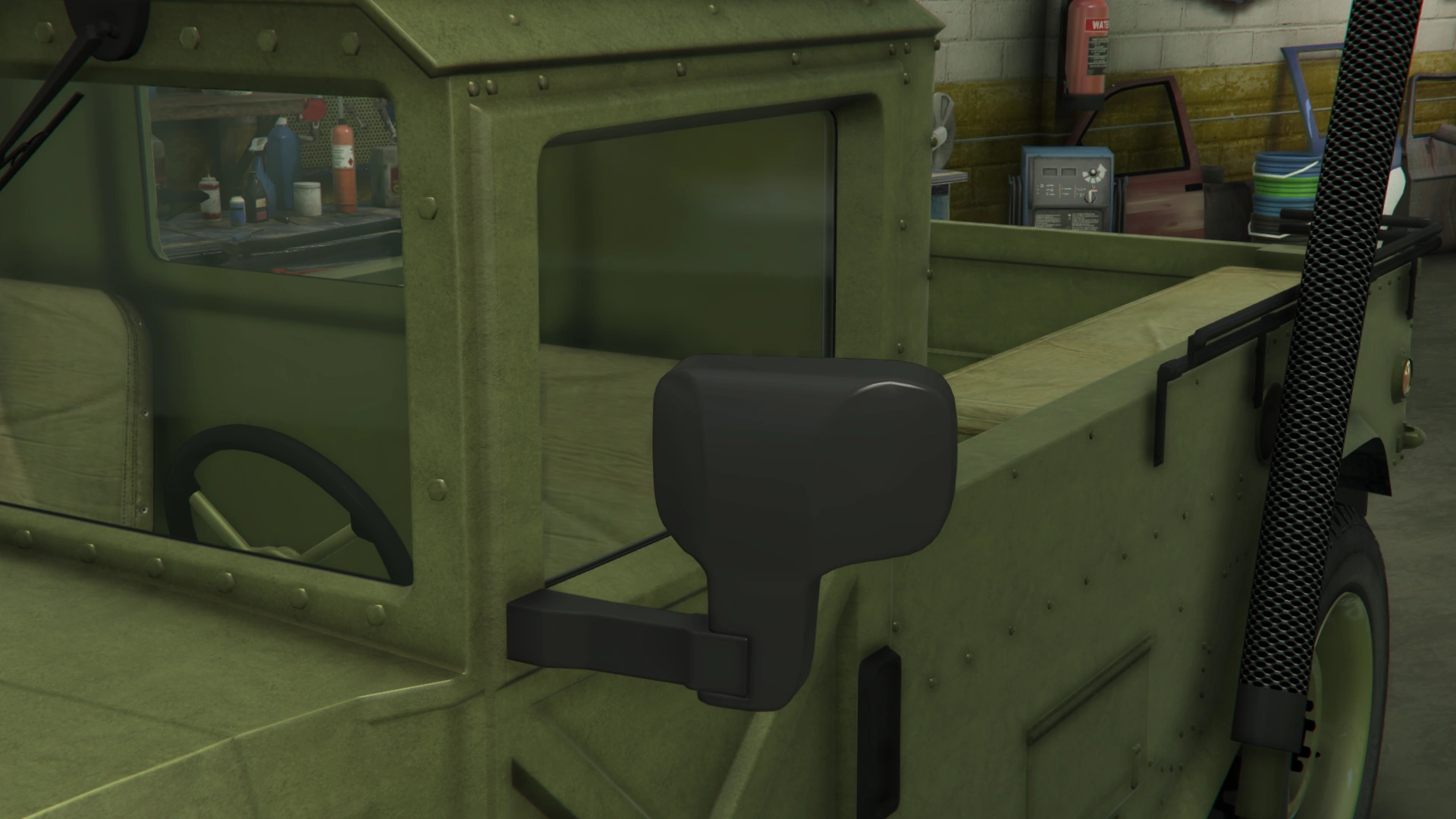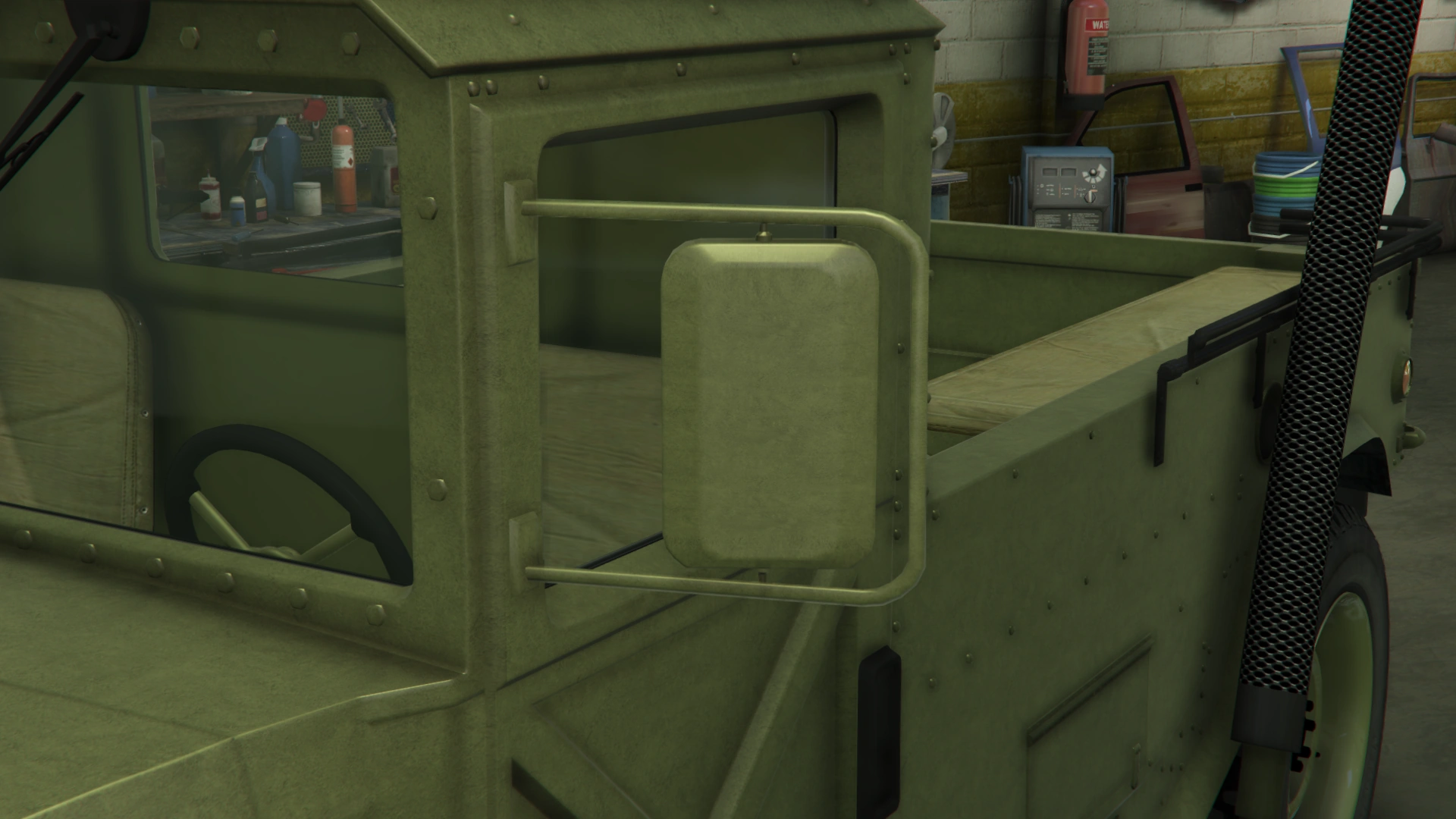 The sides of the truck have similar features to the regular Patriot and the beta model, being the flared fenders, flared bottom side and the formations on the middle section. However, it has a shorter cabin with similar design and features to the beta model. It also uses large rectangular doors with a cross-shaped pattern on the lower side, visible hinges, black door handles and larger rear-view mirrors. The rear section of the truck is occupied by a long bed with bench seats inside, black rails on the upper borders and amber lights on the rearmost sides, along with a long exhaust stack on the left and step bars on the rear quarters. The frames on the truck bed no longer comes as standard, though restorable when modified.