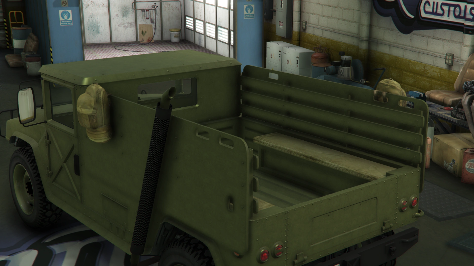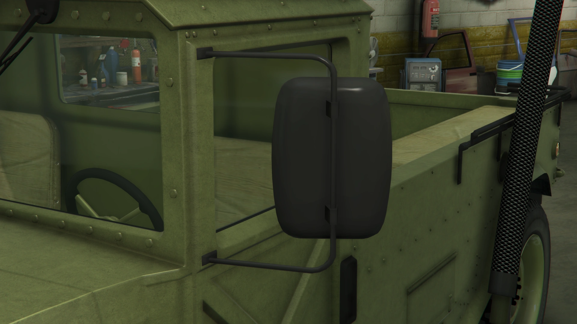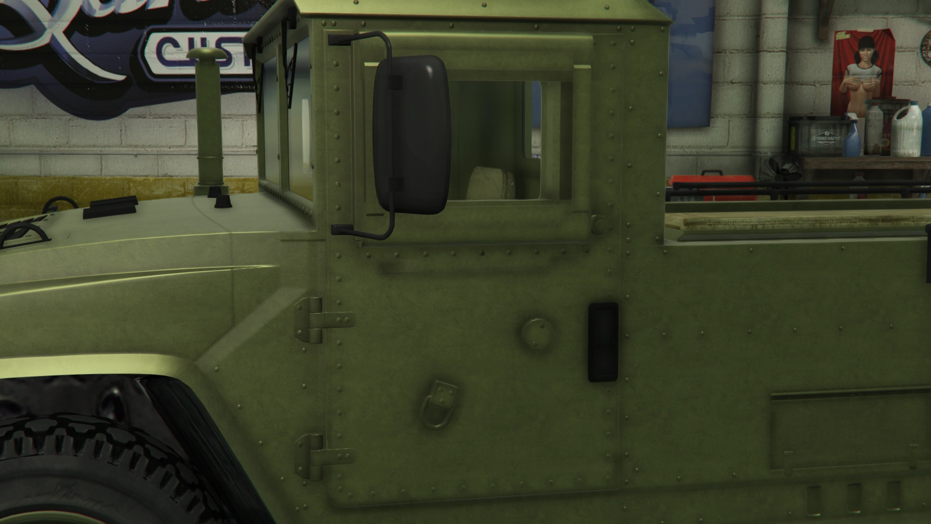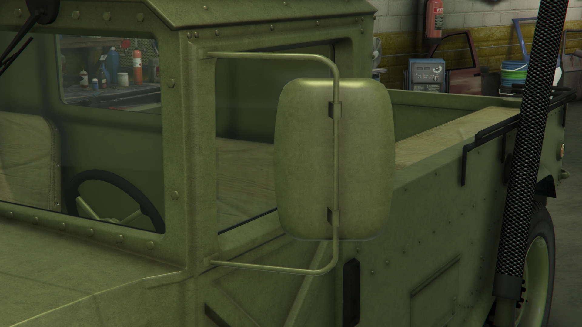 The sides of the truck have similar features to the regular Patriot and the beta model, being the flared fenders, flared bottom side and the formations on the middle section. However, it has a shorter cabin with similar design and features to the beta model. It also uses large rectangular doors with a cross-shaped pattern on the lower side, visible hinges, black door handles and larger rear-view mirrors. The rear section of the truck is occupied by a long bed with bench seats inside, black rails on the upper borders and amber lights on the rearmost sides, along with a long exhaust stack on the left and step bars on the rear quarters. The frames on the truck bed no longer comes as standard, though restorable when modified.