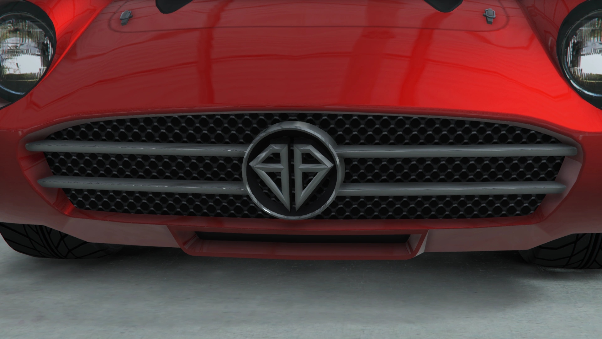 On the sides, the car features a detail starting from the front wheel arches and ending on the Gull-wing doors (one of the cars in the HD Universe to feature this door design), together with black slatted vents bearing the manufacturer emblem and dual exhaust pipes exiting directly in front of the doors on either side. The rear wheels have body plates covering the top quarter of the wheel, named body plating. On the greenhouse area, the car features chrome classic mirrors near the A-pillars and chrome window trim, while the rear features a "bubble" window, which distinctively sticks out from the rest of the body work. A fuel cap can be seen on the driver side, near the rear window.
