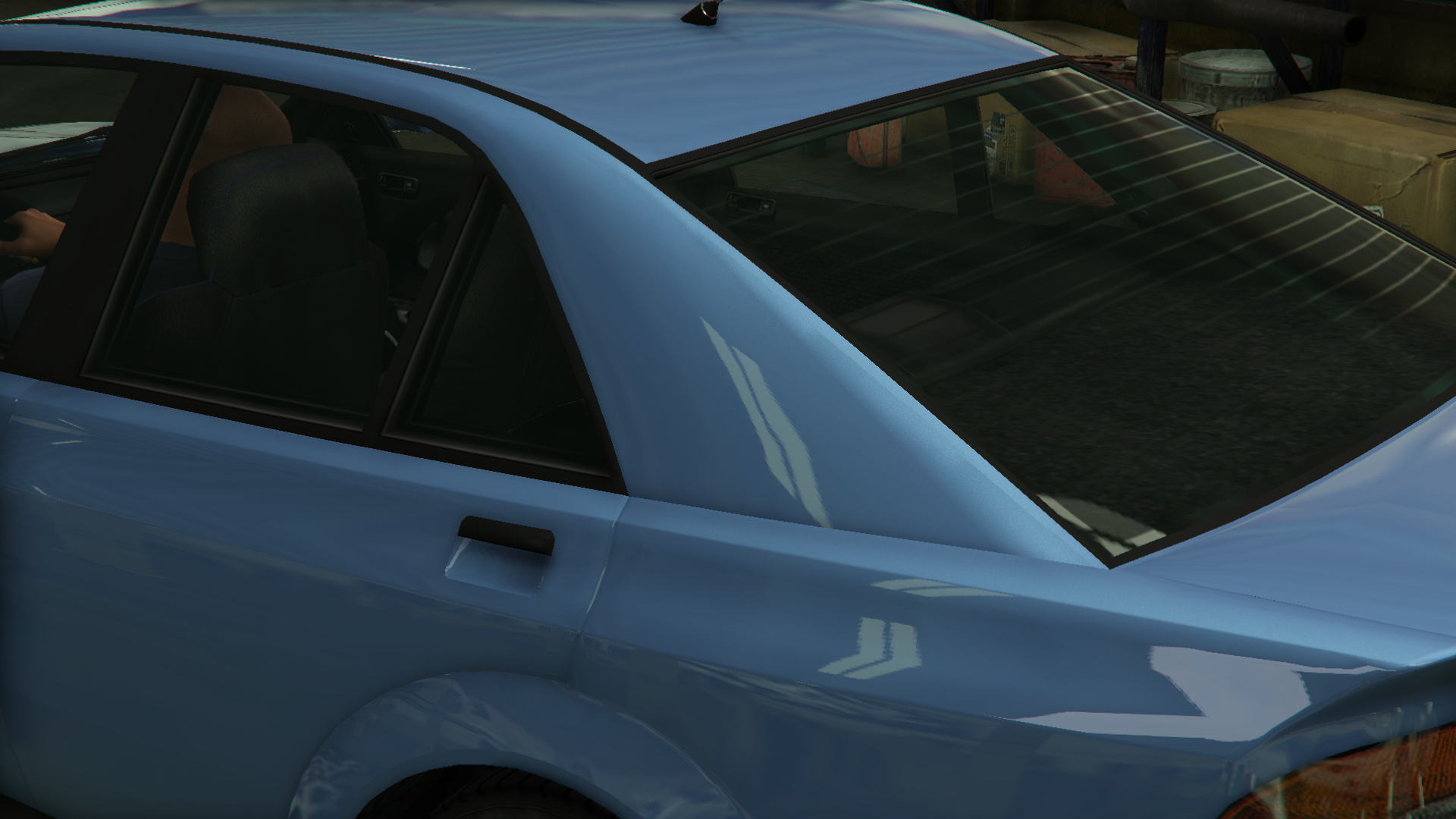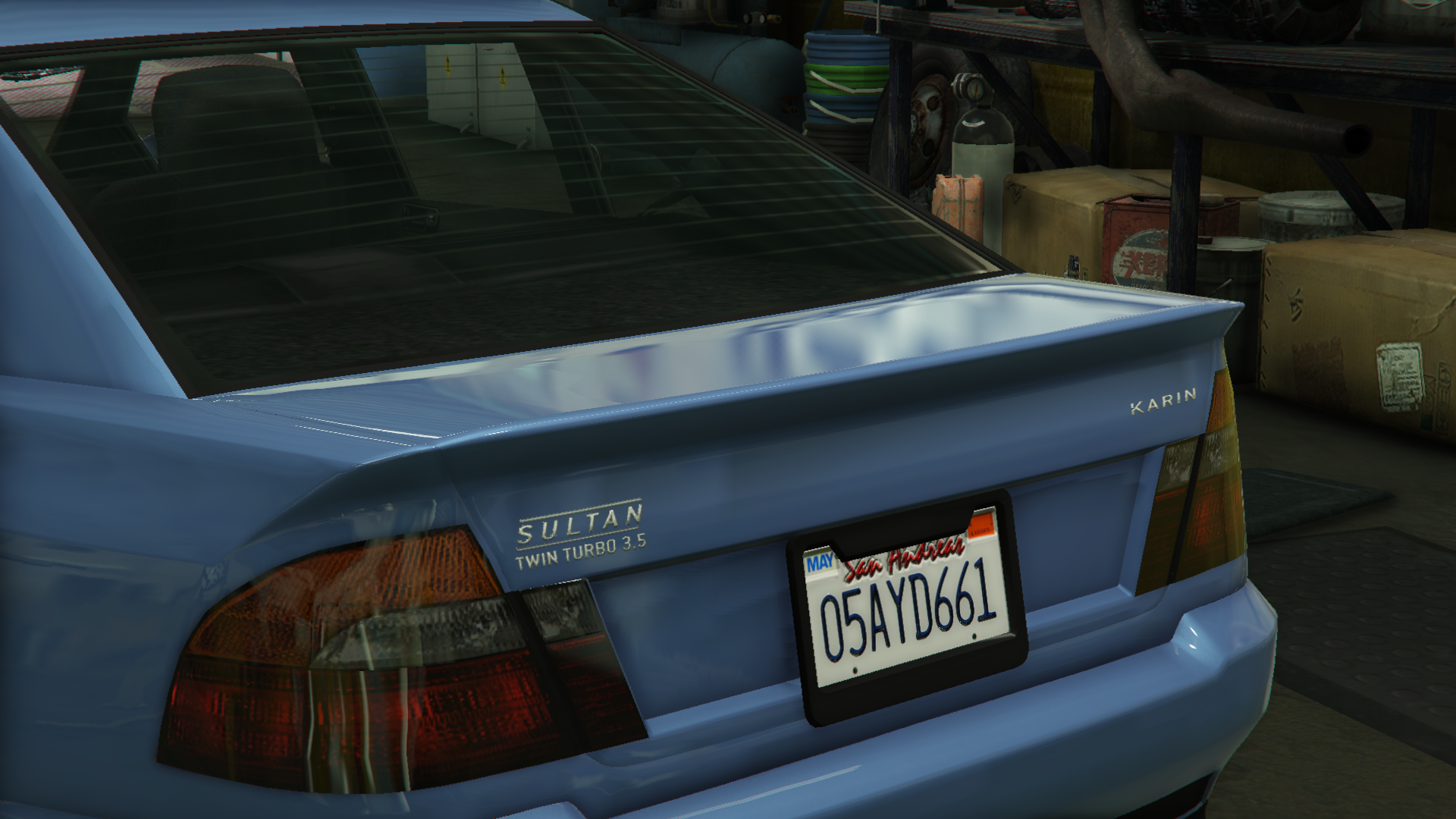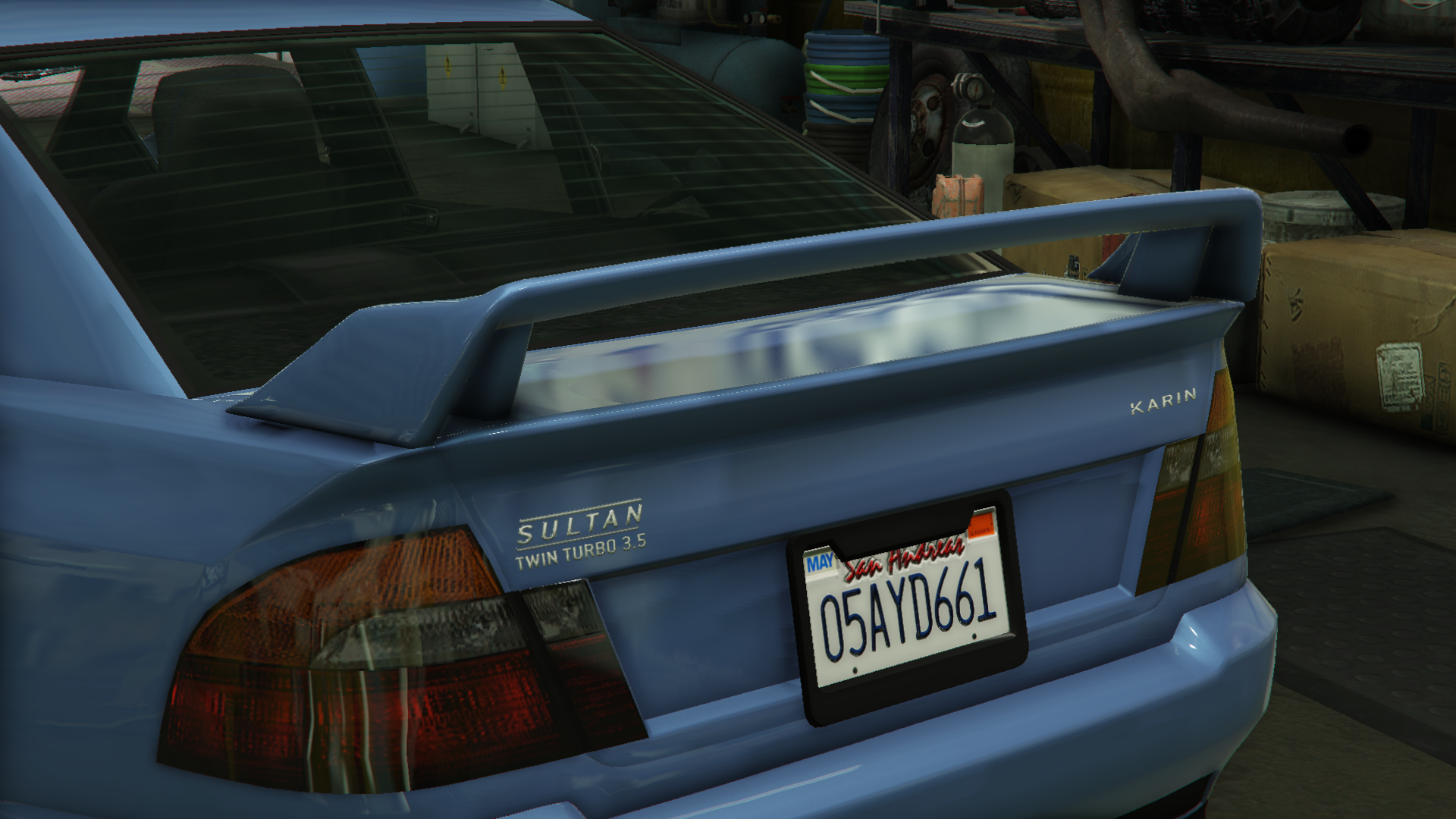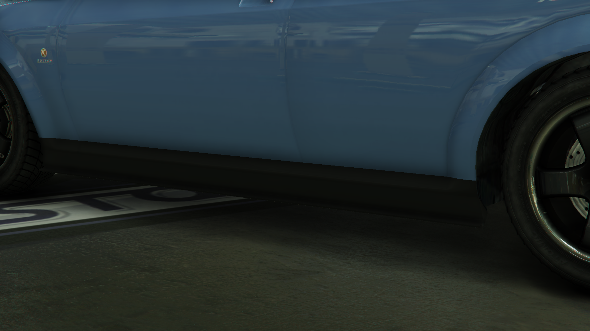 The Sultan reappears in GTA V, mostly unchanged in terms of appearance. The only difference is that its colour distribution changed, as the secondary colour is applied on the bonnet, roof and boot, as well as on the sides in the form of thin stripes. Its interior is also decorated with stitching on the seats and steering wheel, which matches with the primary colour. The car features black wheels by default (which actually gives a darker tone).