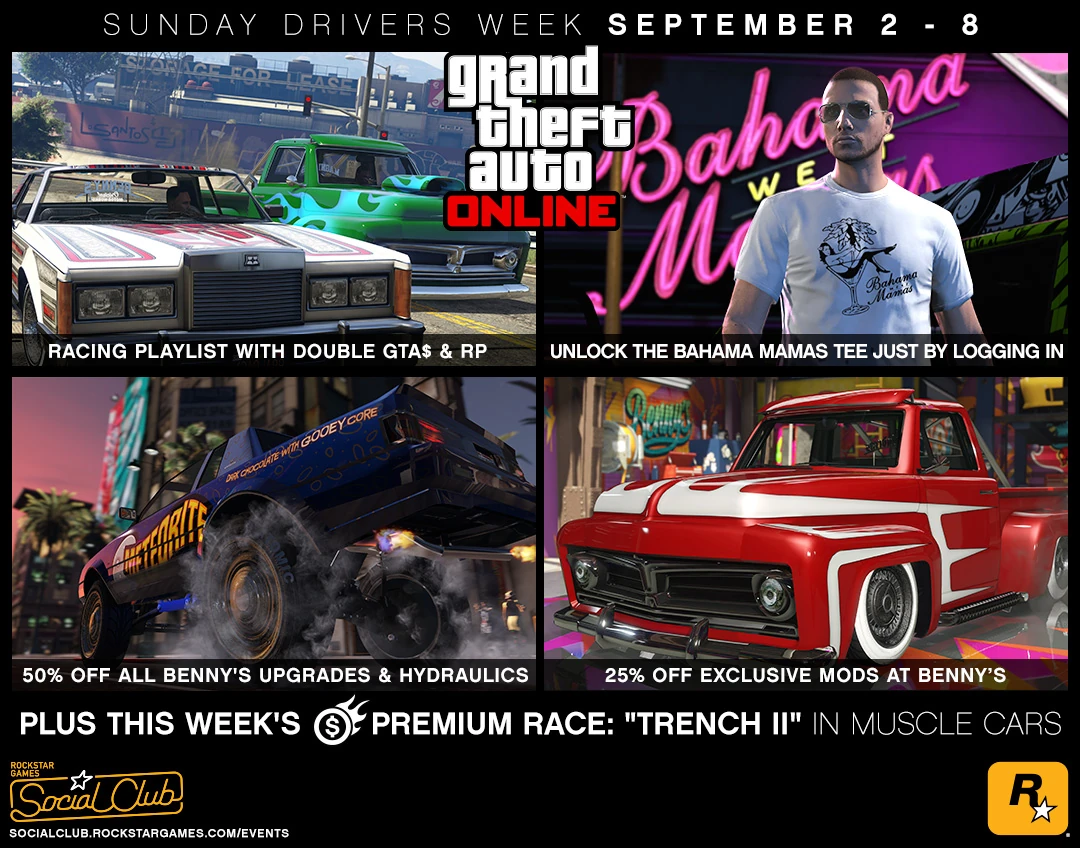 Sunday Drivers Week was an event in Grand Theft Auto Online. The event started on September 2nd, 2016, and ran until September 8th, 2016. This event awarded players for logging on and featured double earnings and discounts on selected vehicle upgrades.