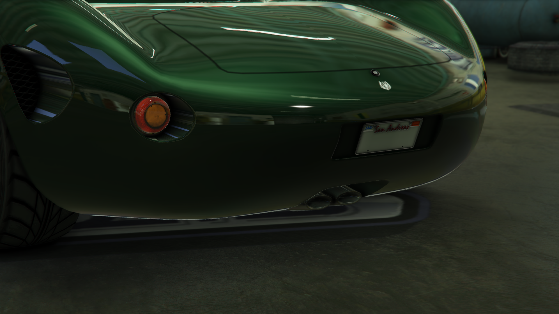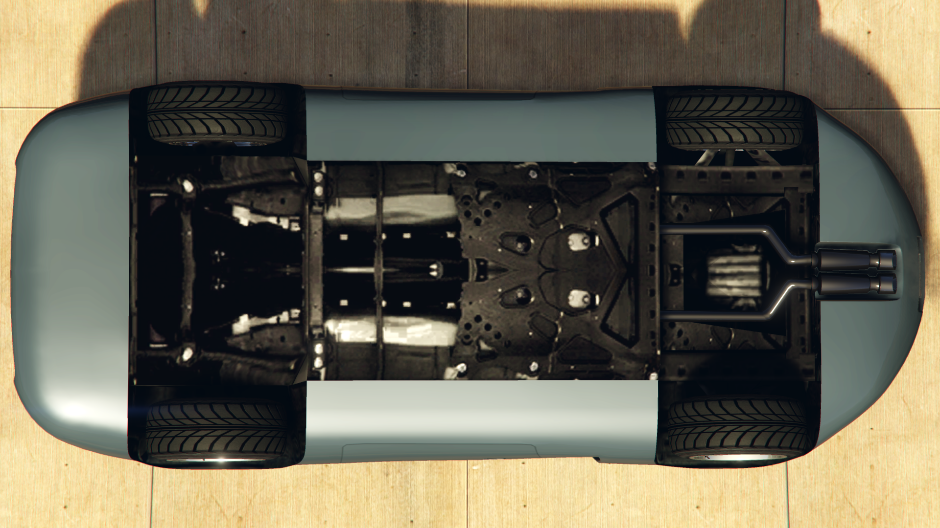 The rear area is notably curved in comparison to the front, featuring a set of red circular lamps with inner amber signals. There is a small inset area dedicated to the mounting of the license plate, as well as a central moulding for the exhaust tubes. The underside is very simplistic, with the outer sides enclosed by the bodywork.