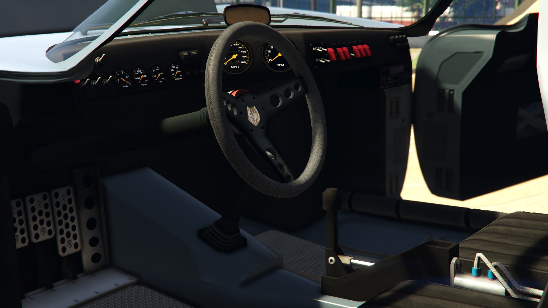 Its interior is largely composed of race-based dials and switches, but arranged in a way that the gauges are on the driver side, while the speedometer and tachometer gauges are on the centre of the dashboard, facing to the driver. The cabin's rear-view mirror is mounted on the centre of the dashboard.
