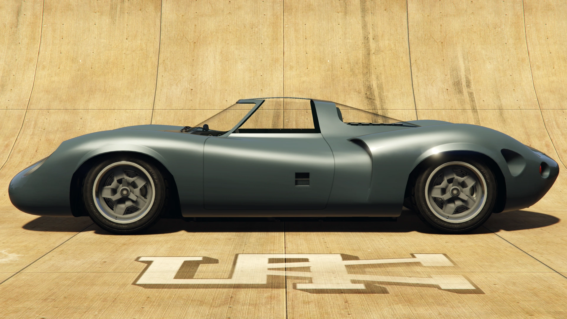 The sides of the car are defined by the curved fenders and the flared arches, with the rear fenders having large ducts on either side of the wheels to allow air to pass through the rear brakes. The doors follow the shape from the front area and feature door handles at a lower height than most standard cars (being a bit higher than cars with gull-wing doors like the Stirling GT). The cabin features a T-bar roof and a large curved rear window that exposes the engine, as well as a smaller, square-shaped glass pane on the separation between the cabin and the engine bay. A small boot can be seen directly behind the engine bay area, along with a small manufacturer emblem just at the rear end of the car.