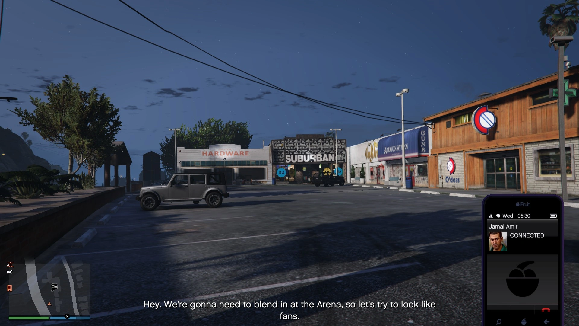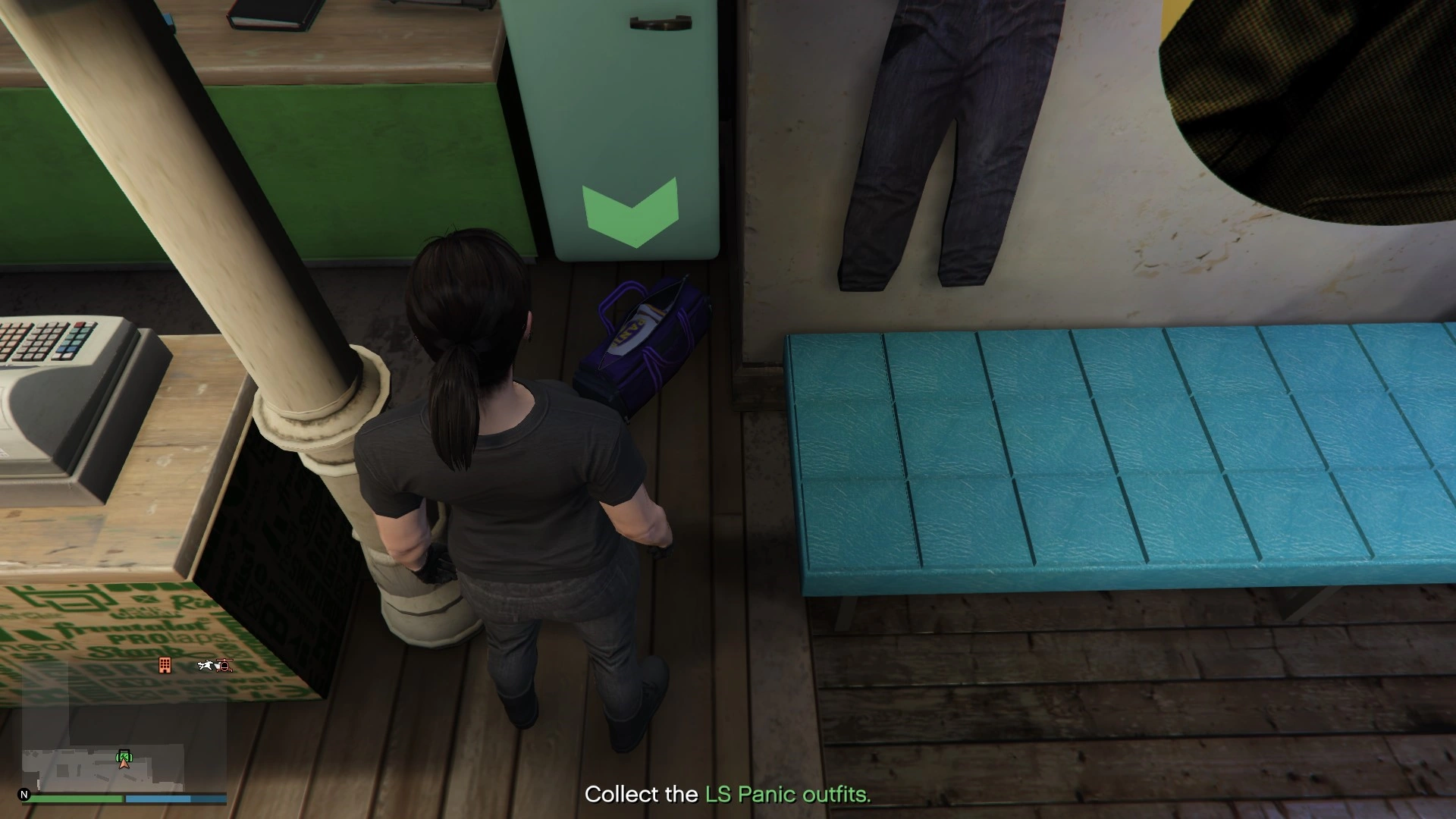 Jamal tasks the player to collect a duffel bag containing Los Santos Panic outfits to blend in with the basketball team fans at the Maze Bank Arena during the robbery. He tells the player to collect the bag at the nearby Suburban clothing store.