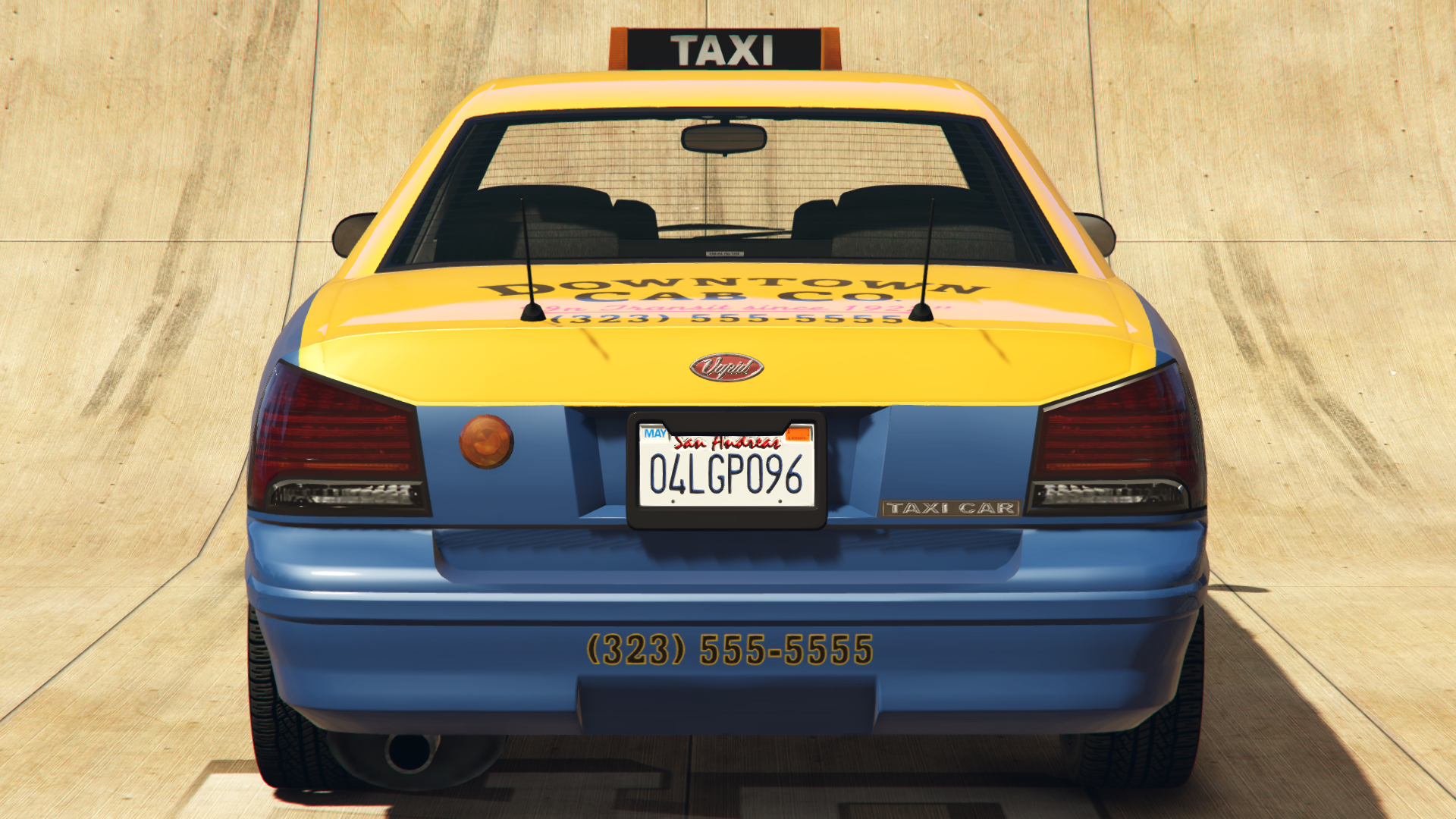 The Taxi is operated by the Downtown Cab Co. taxi company, appearing with a yellow primary color and blue secondary color (inspired by the scheme of the), and uses a set of circular hubcaps and medium-profile tires with standard tread pattern (different to those of the Stanier-based police cars in the same game). It has a small "Police Interceptor" name plate on the right rear above the taillights like most Crown Vic taxis, which are police versions of the car. Similar to its GTA IV equivalents, the Taxi will appear with regular taxi lights or variants with rooftop advertisements for "Caca", "Le Chien", "Vanilla Unicorn", or Die Already 4, which can also detach in collisions. It also bears orange beacon lights on both ends.