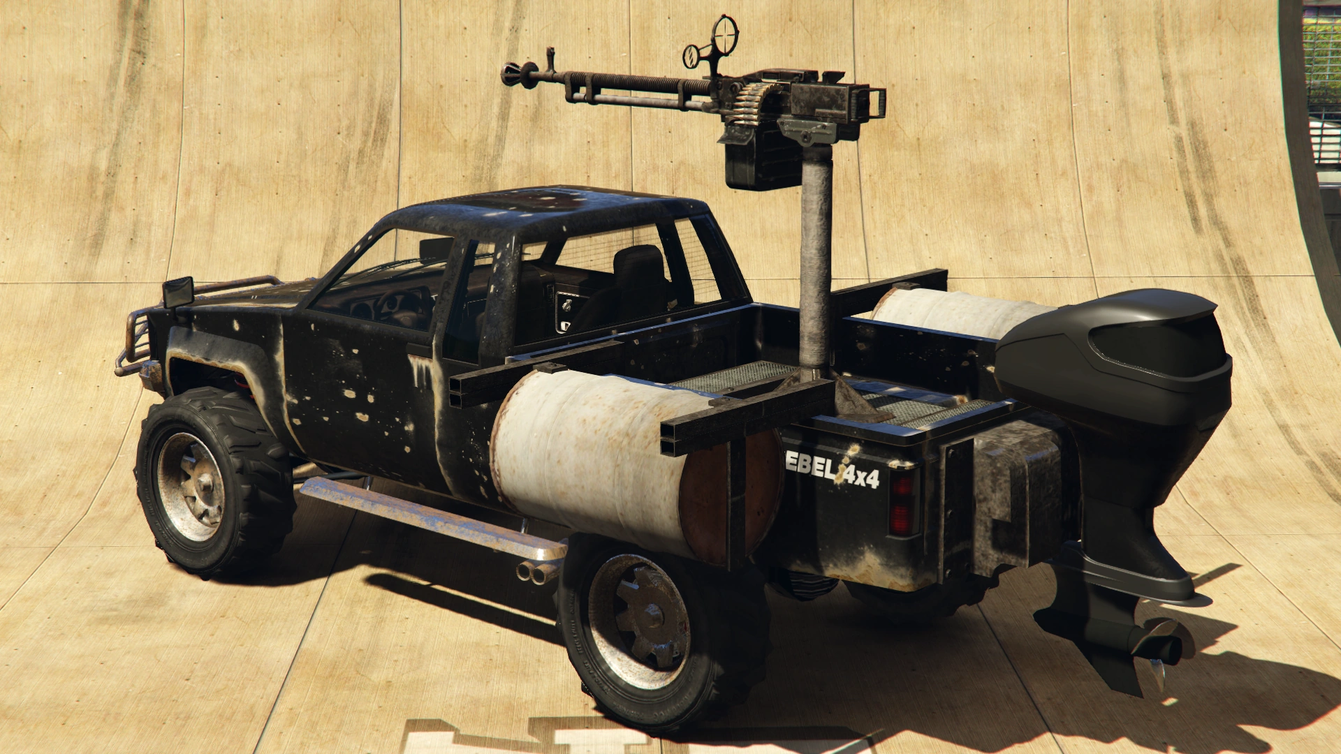 The truck retains the same design and features as the aforementioned vehicles, but adds two oil drum floats attached to the bed of the truck and a motorized boat engine on the rear, which steers in conjunction with the car's steering system, and the propeller is coupled to the engine drive systems (visible when the truck is on water). Its front end features a combination of the two bull bar sets from the standard Rebels, except that the rally lamps are replaced by a winch.