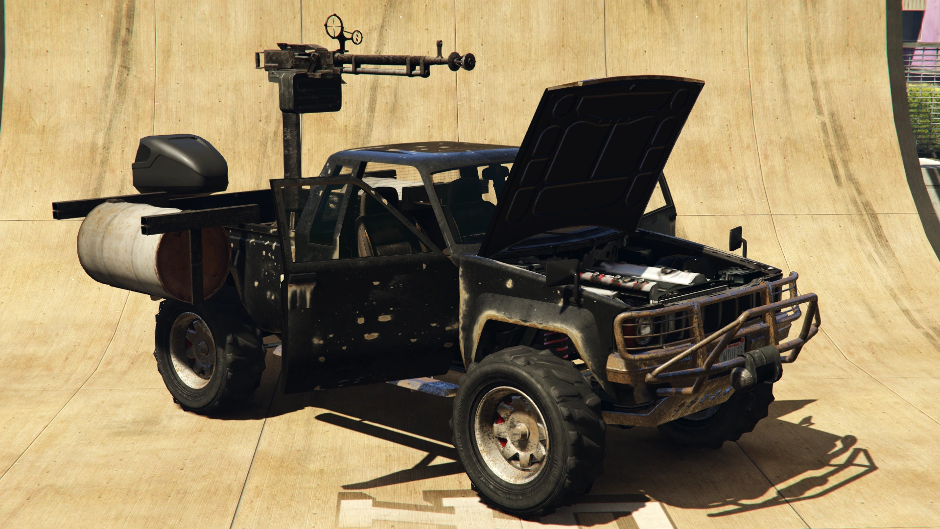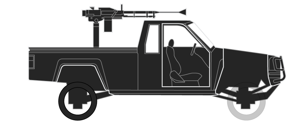 Like the Technical, the vehicle is equipped with a machine gun turret resembling a DShK 12.7mm (.50 caliber) machine gun, with the same sight resembling the anti-aircraft optical sight used on the real-life weapon.