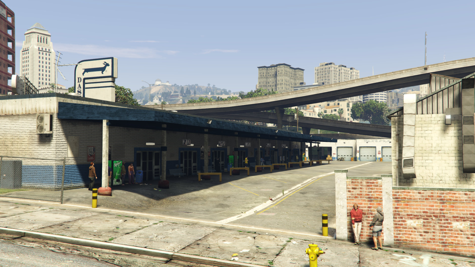 Textile City accommodates the Dashound Bus Center, situated east of the Mirror Park Railyard and across the road west from Pillbox Hill Medical Center. The center provides transport around the city and usually has Buses parked at the station. Despite this, Buses are never seen entering or leaving the station in regular gameplay. A single bus stop can be seen on Strawberry Avenue, from which a Bus can occasionally be seen pulling away from during the day.