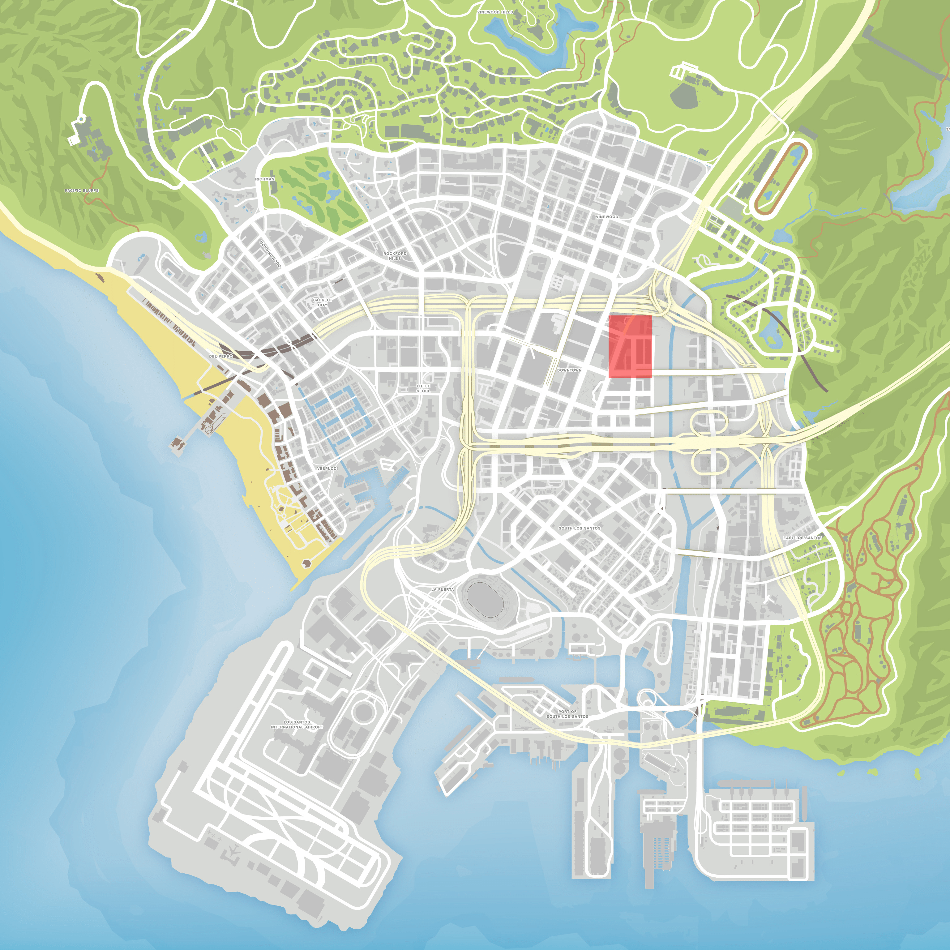 Textile City is bordered by Downtown Los Santos in the north, La Mesa in the east, Pillbox Hill in the west, and Mission Row in the south. It is one of the smallest districts in San Andreas, true to the real life Fashion District of Los Angeles, and covers just two blocks laterally and longitudinally. San Andreas Avenue denotes the border between Textile City and Mission Row.