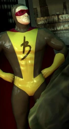 The character is depicted as a muscular man in a brown and yellow skin-tight superhero costume. He wears a mask covering his eyes and has a "B" logo on his chest.