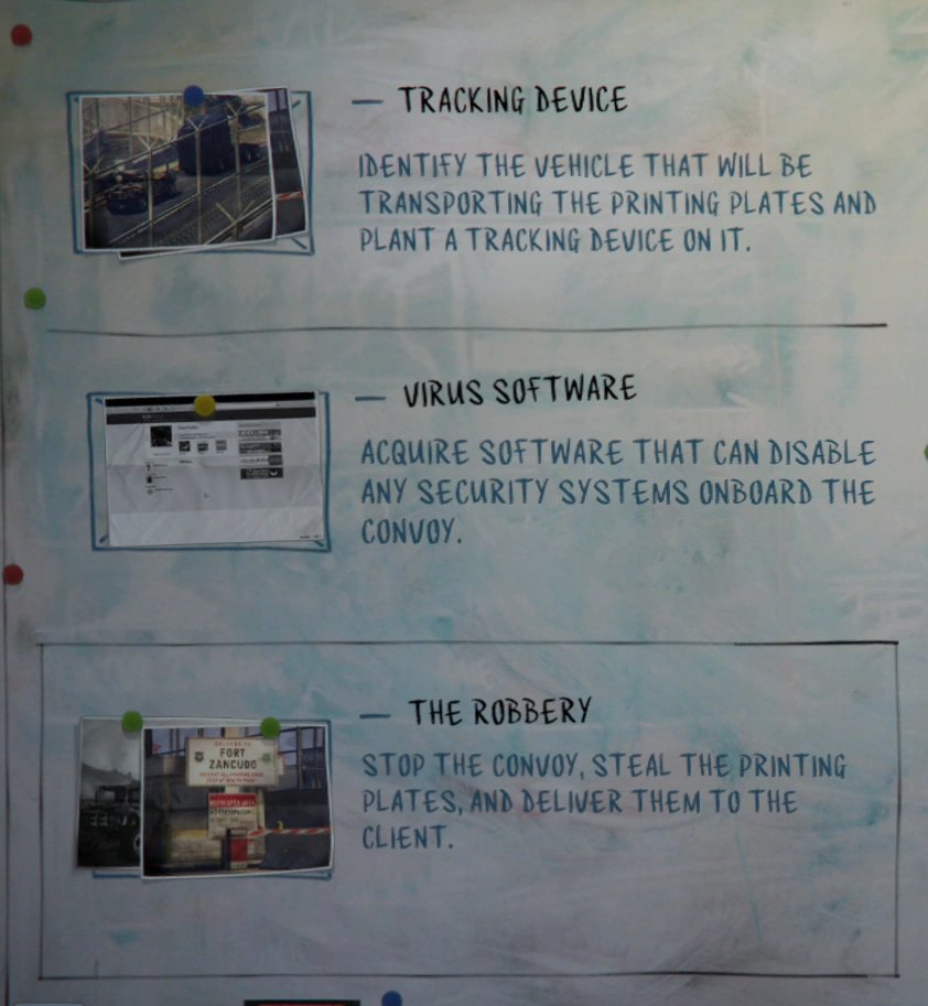 “Identify the vehicle that will be transporting the printing plates and plant a tracking device on it.”