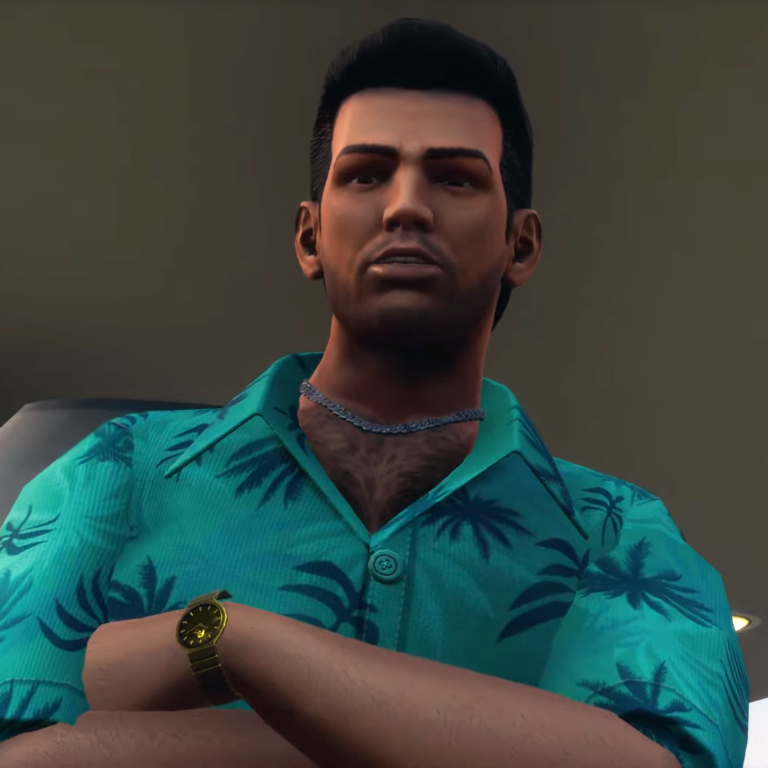 Tommy, an Italian-American, is portrayed with a tall, swarthy, handsome appearance, combed dark brown, almost black hair, brown eyes, and a five o'clock shadow. He first appears wearing a light blue-green Hawaiian shirt with dark blue palm trees printed on it, a pearl necklace (silver chain necklace in The Definitive Edition), a gold watch around his left wrist, stonewashed blue jeans and white sneakers. He has other outfits also, and his appearance can be completely changed through the Player Skin Setup, a new feature of Grand Theft Auto: Vice City, allowing players to create custom textures for the default player model and apply them in the game.