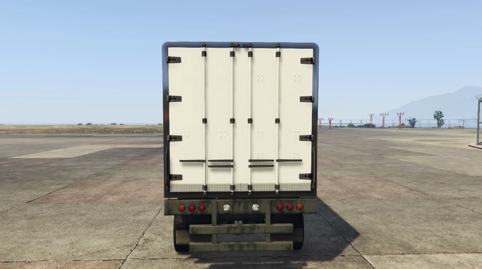 It features a refrigeration units on the front, chrome borders, red/white warning strips across the lower sides of the box, side guard rails with textures from the Flatbed Trailer, different rear guard rail textures and thinner fenders fitted with mudguards on either end. It may spawn blank or with company liveries, being Cluckin' Bell, Pisswasser and Up-n-Atom Burger.