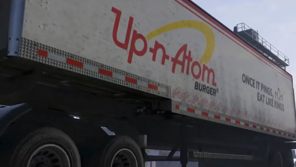 A box trailer with an "Up-n-Atom Burger" livery, assuming a different side profile design, as seen in the first GTA V Trailer.