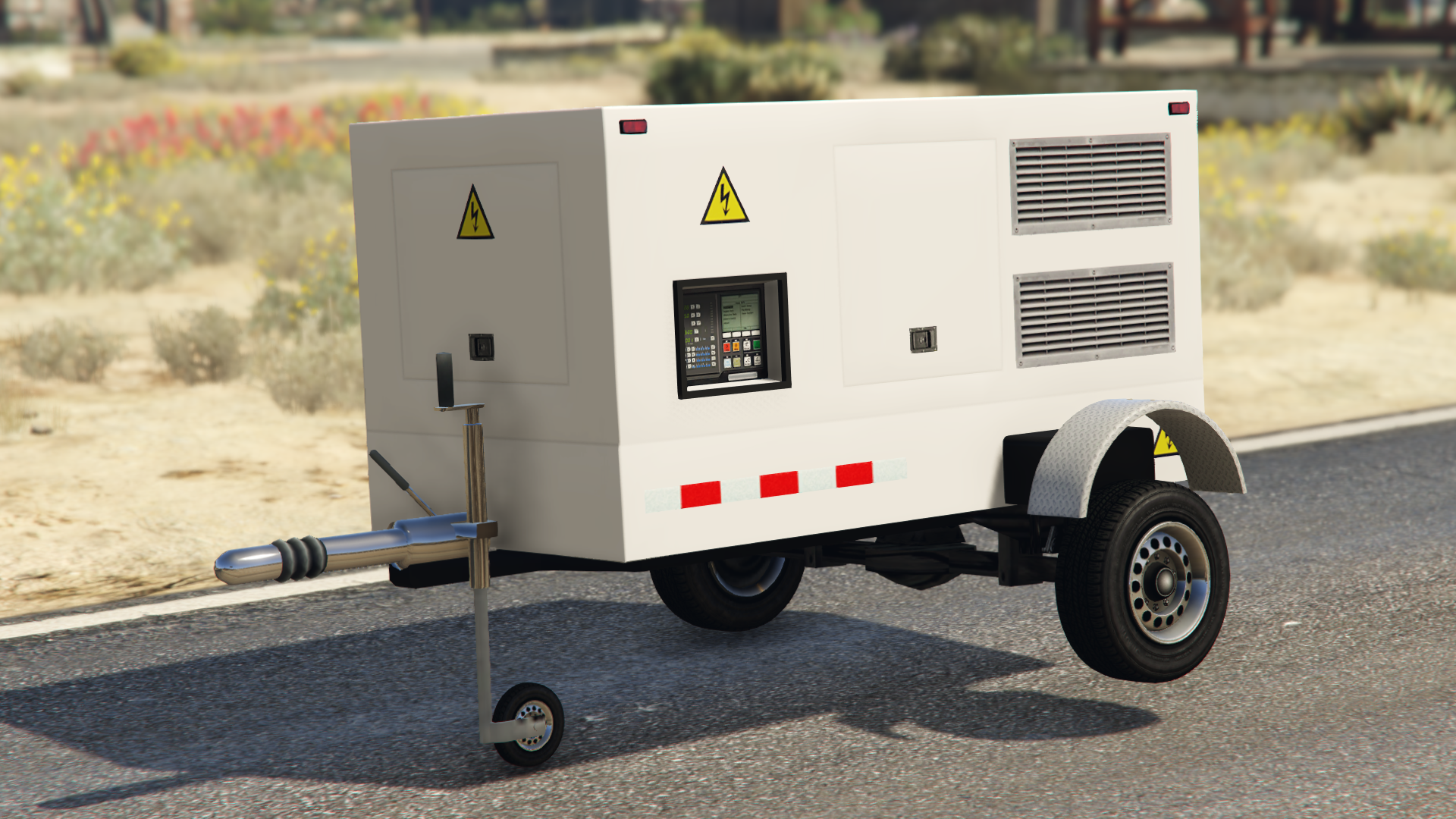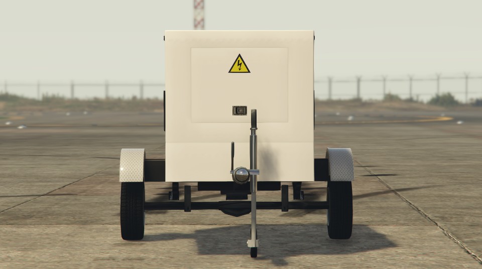 The Trailer is depicted as a single-axle, small-sized trailer that spawns either as a small utility trailer or as a generator trailer. Both versions share the same chassis length, silver tow beam, front stand with an auxiliary wheel, curved wheel mudguards with a metallic appearance and the corresponding square marker lights and tail lights, as well as the same industrial wheels from trucks like the Mule, the Benson and the Phantom.