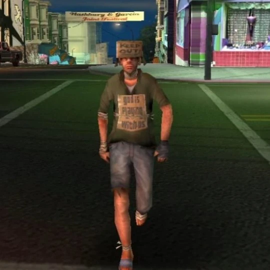 GTA San Andreas tramp with a cardboard sign plastered to his chest reading "God is playing with us".