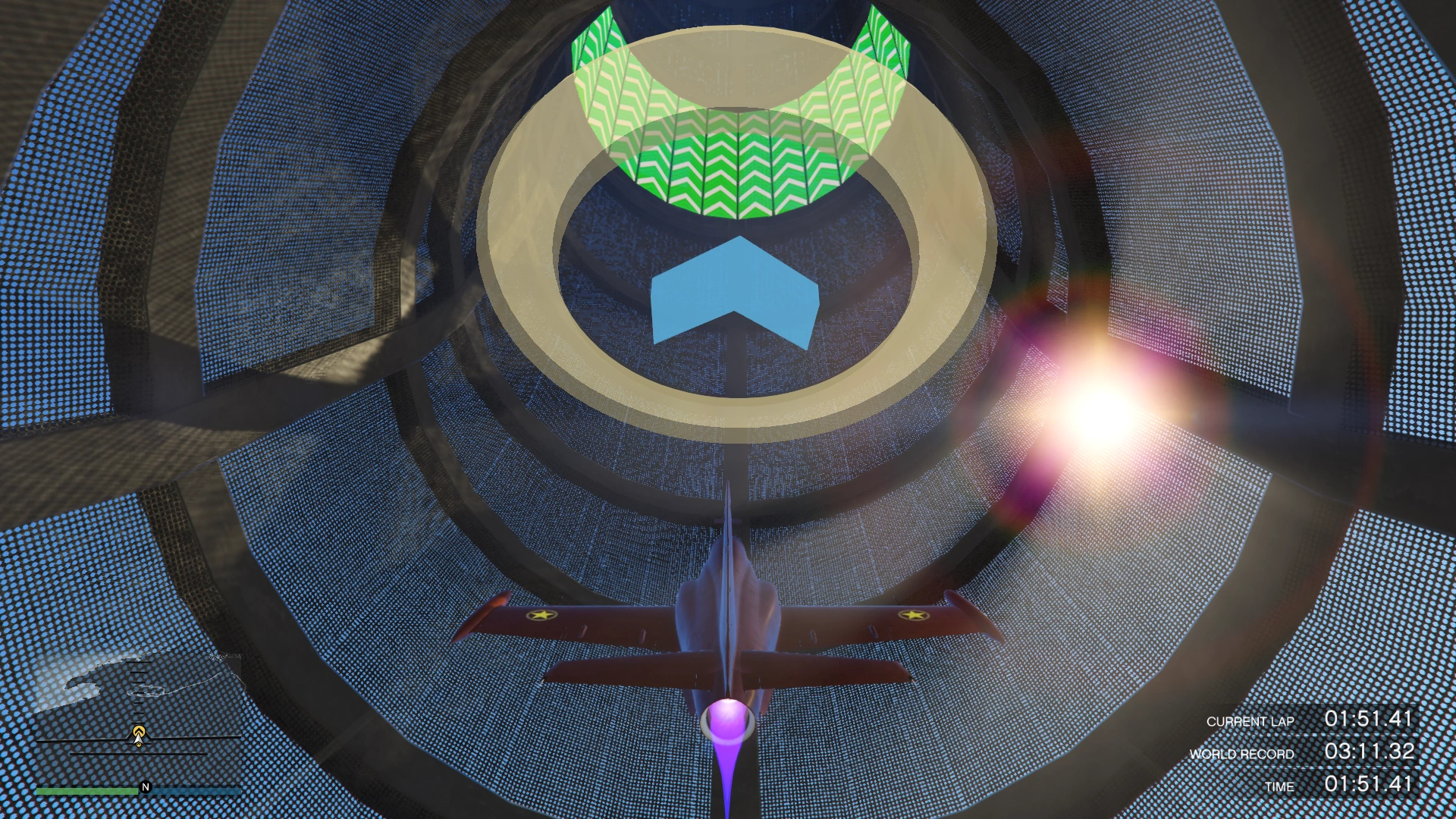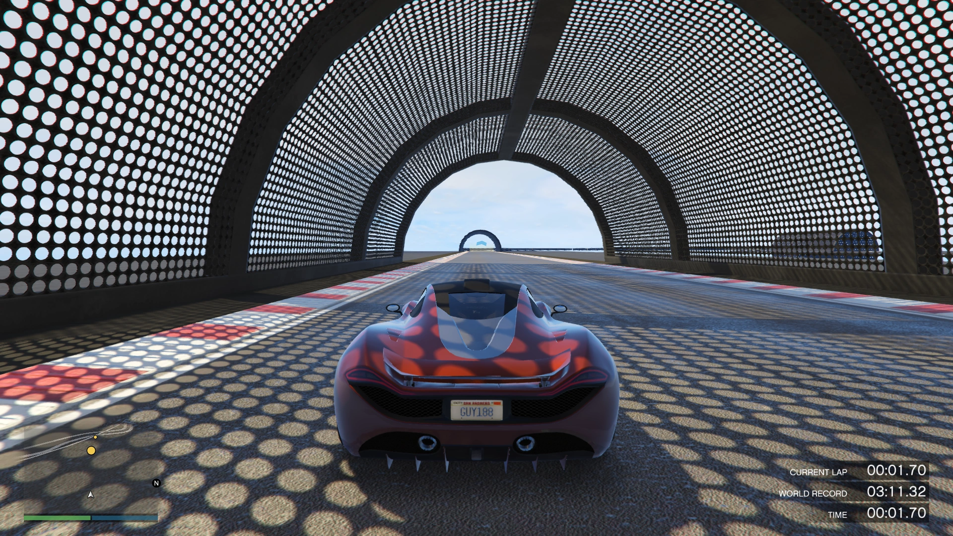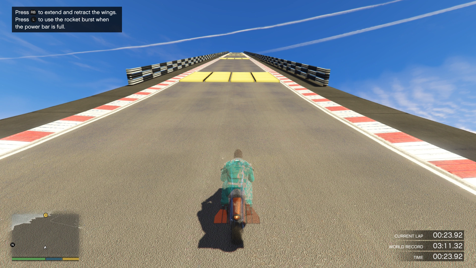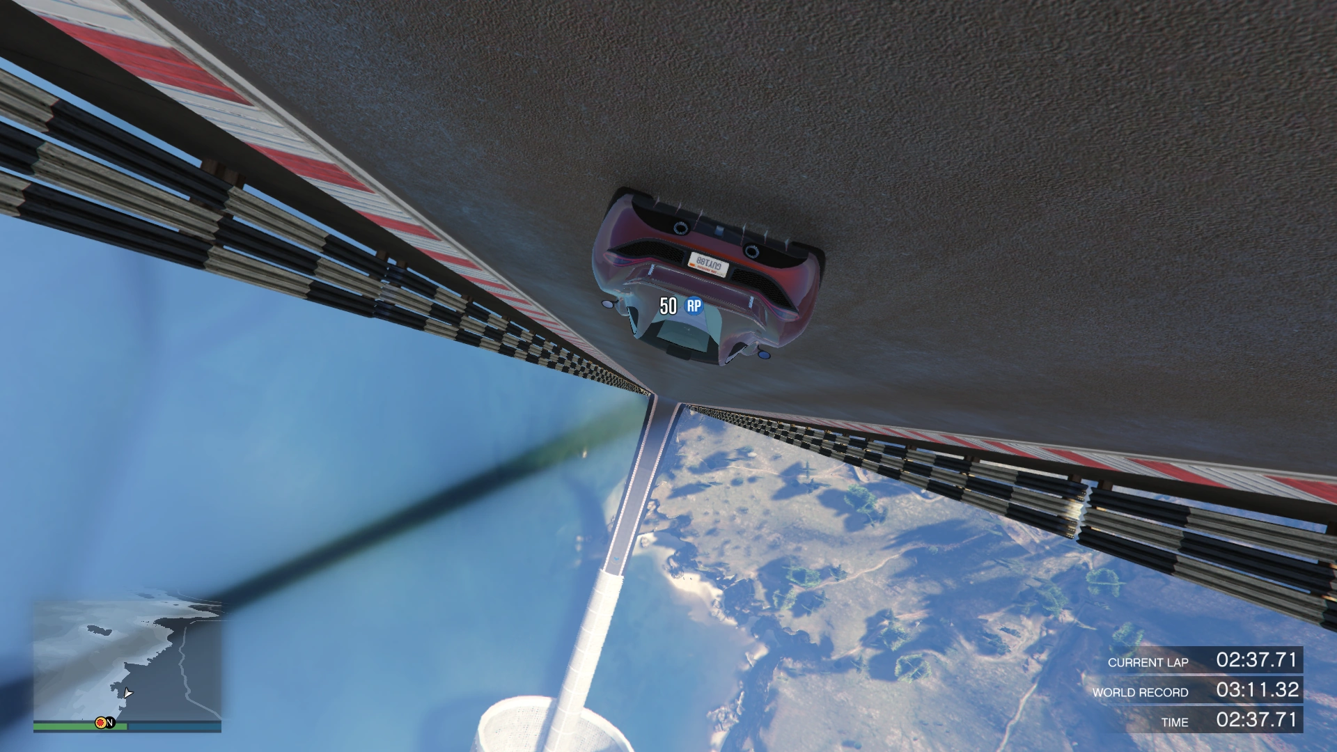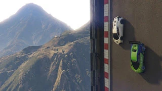 90° is a race set high above San Andreas, based entirely on track with extreme gradient. Multiple sections of the track make half or complete loops, before leading the player to a completely vertical drop, with tight squeezes between props and narrow gorges. The race is a 33 checkpoint long Lap race, default to 2 laps. Between checkpoints 17 and 20, players can take one of two different routes.